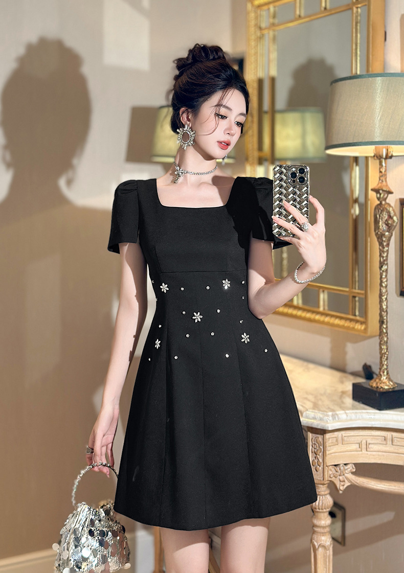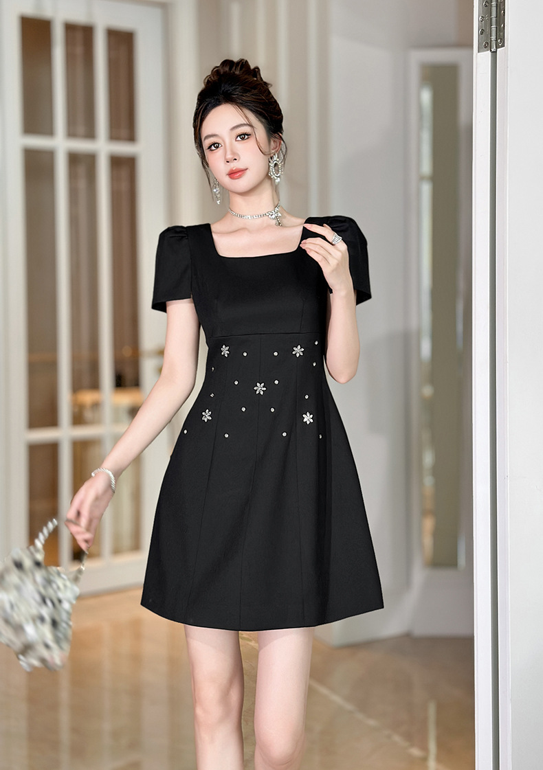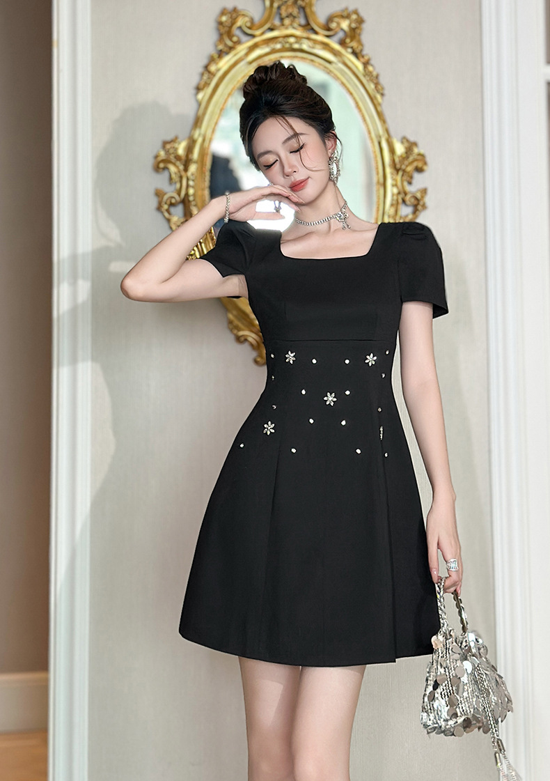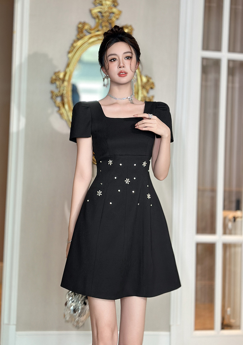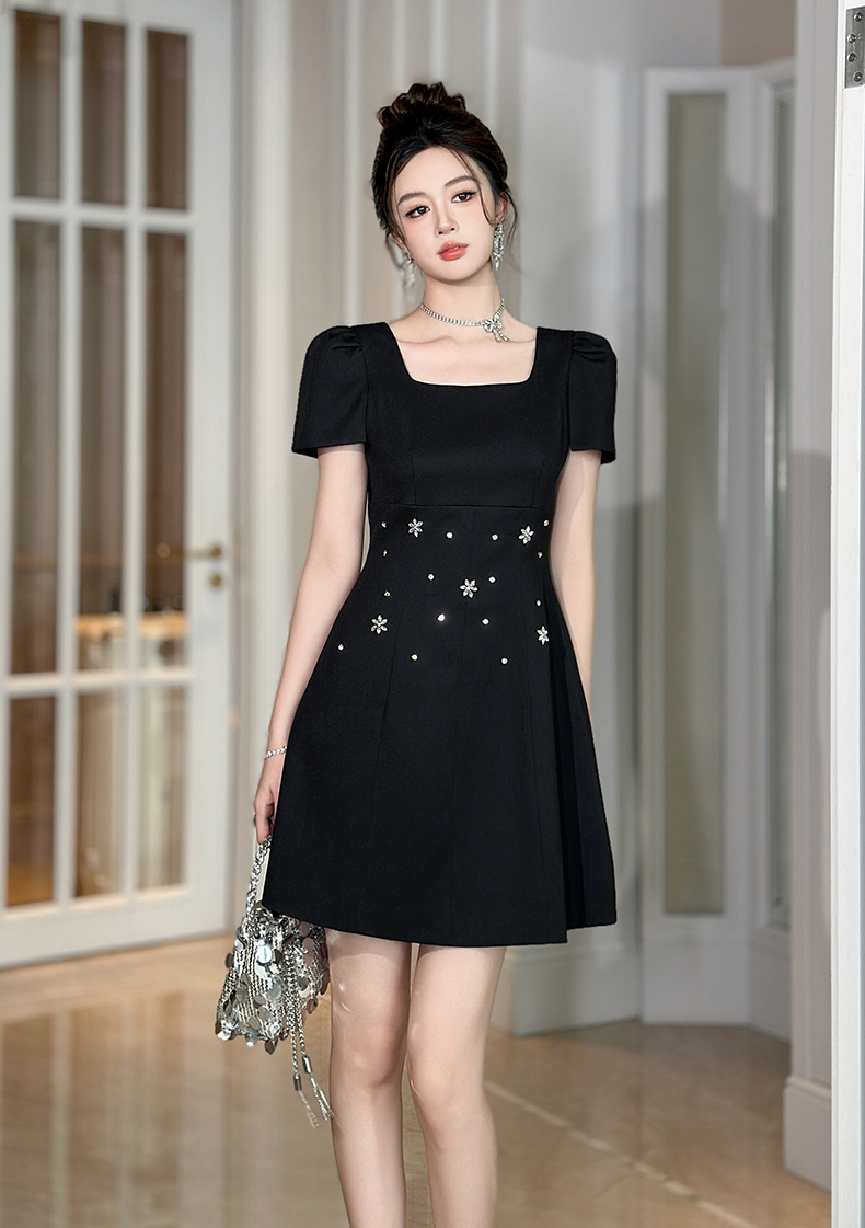 C-4361# 2025夏季新款女装重工设计感镶钻收腰a字连衣裙修身显瘦短裙15436
