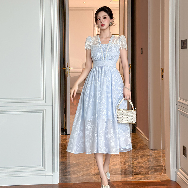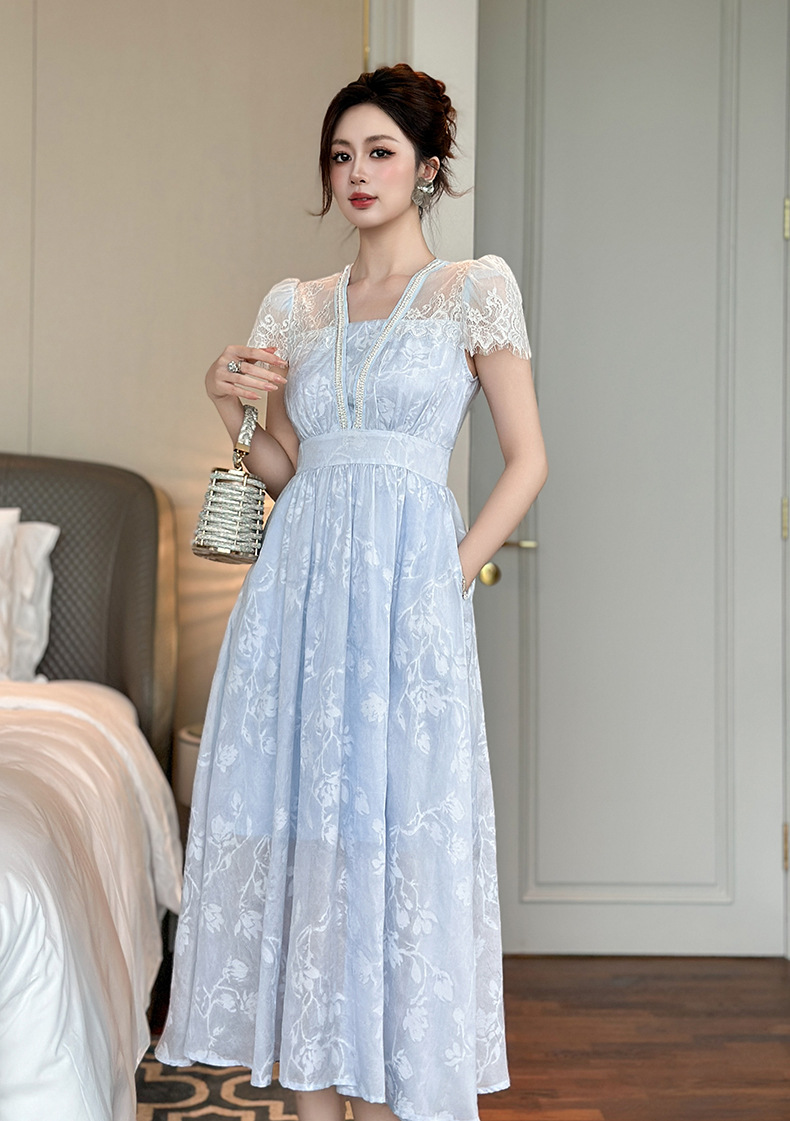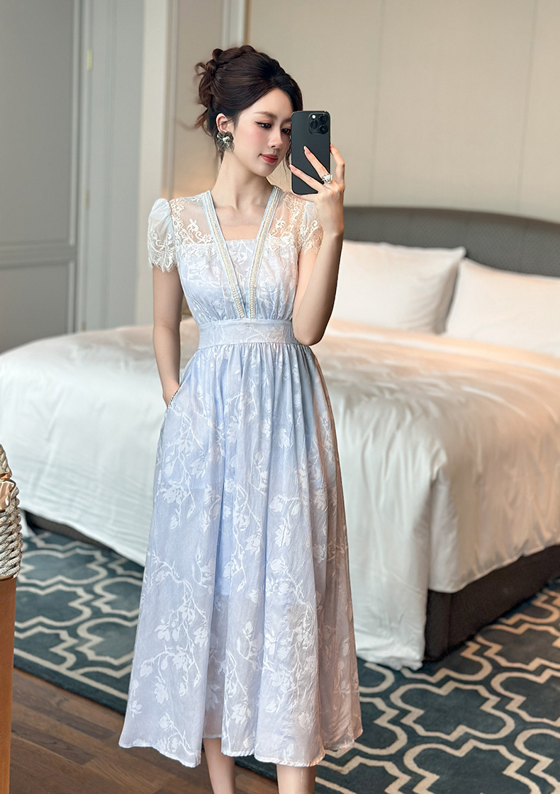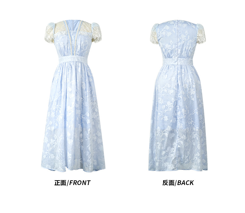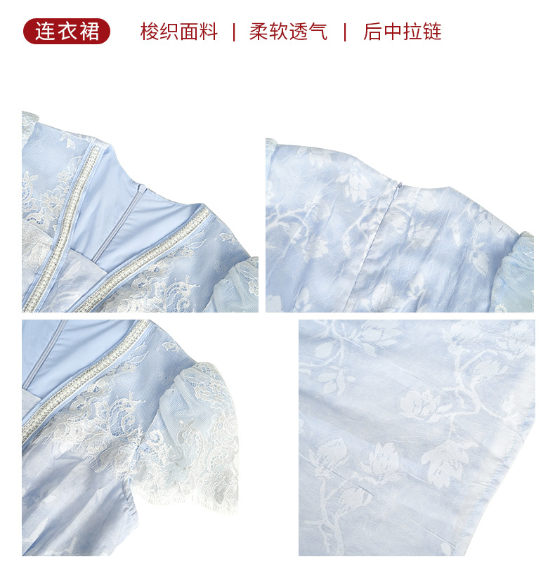 C-4387# 2025夏季新款女装法式V领收腰蕾丝拼接显瘦印花蓝色连衣裙21839