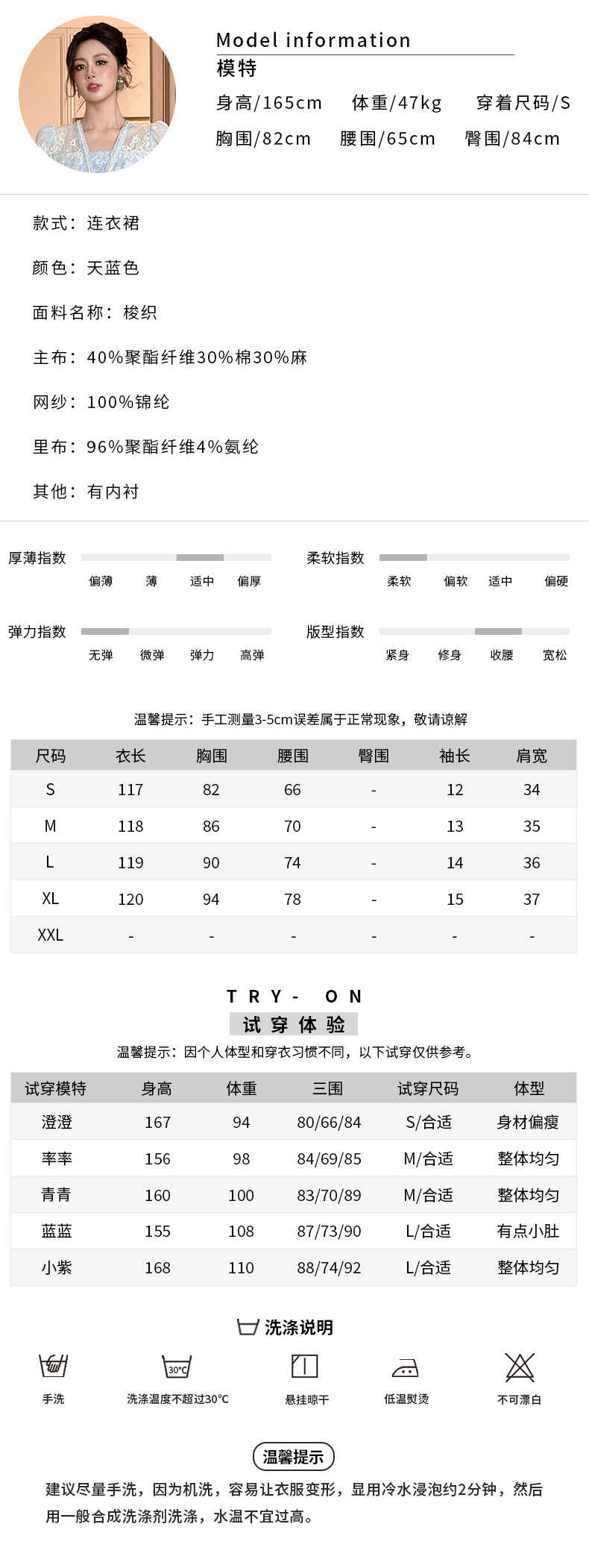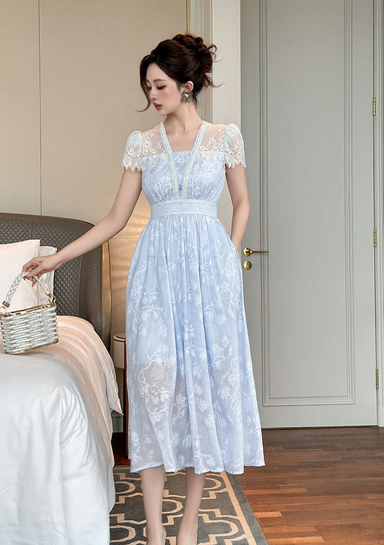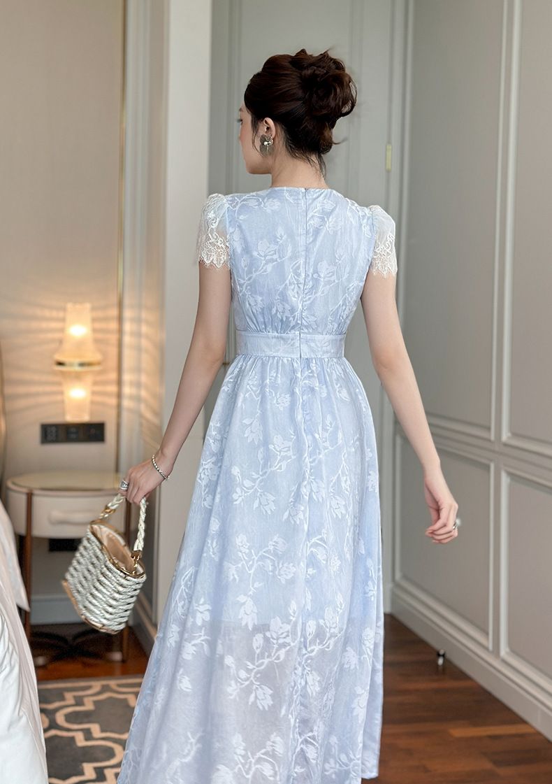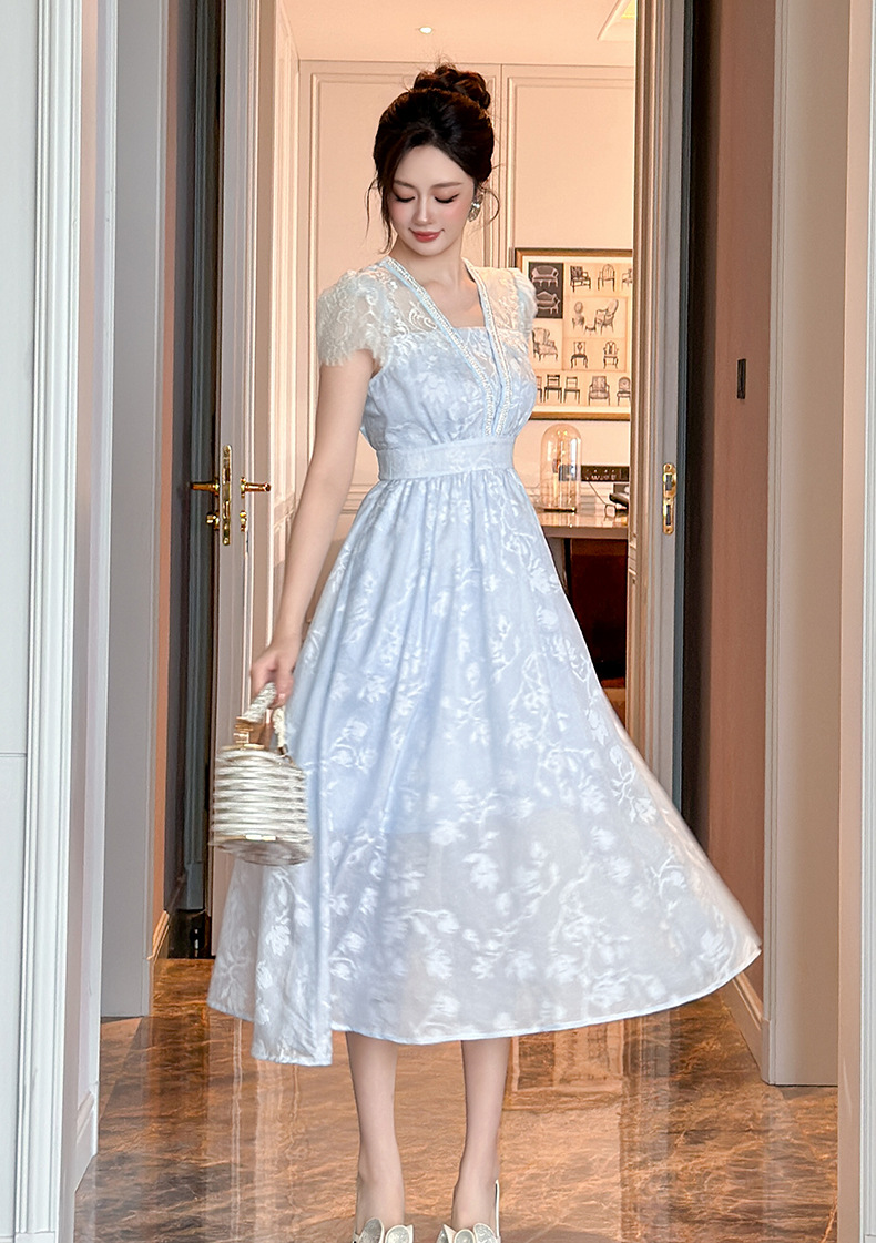 C-4387# 2025夏季新款女装法式V领收腰蕾丝拼接显瘦印花蓝色连衣裙21839
