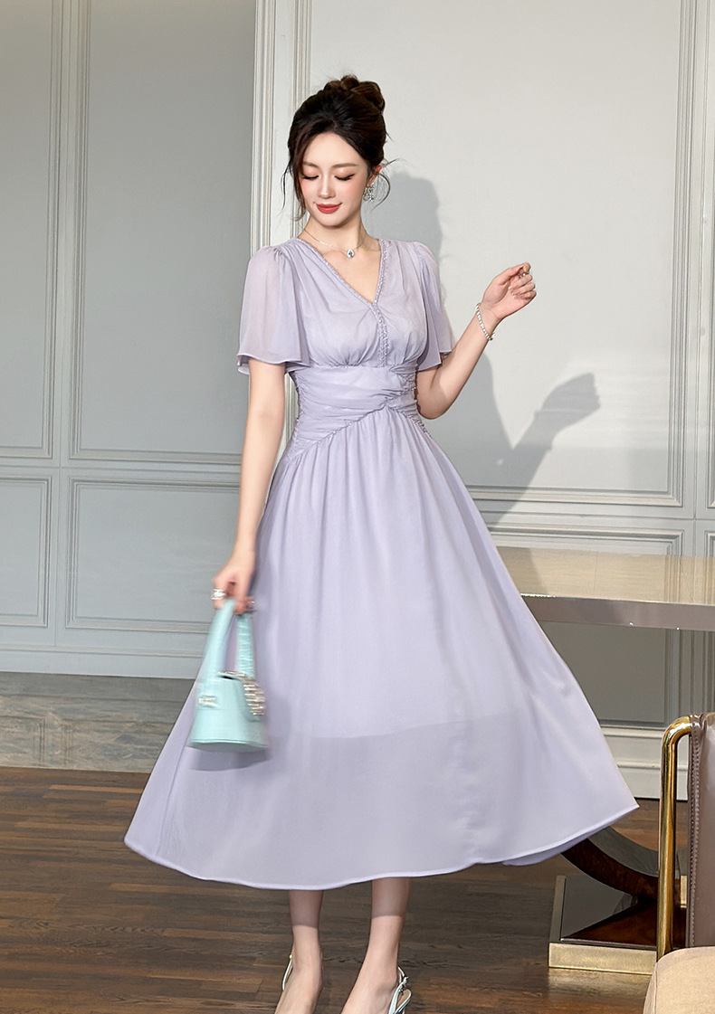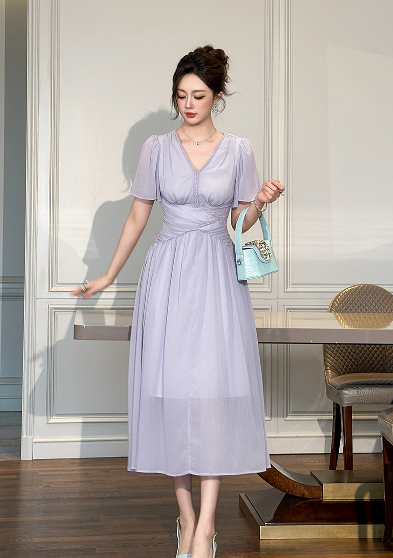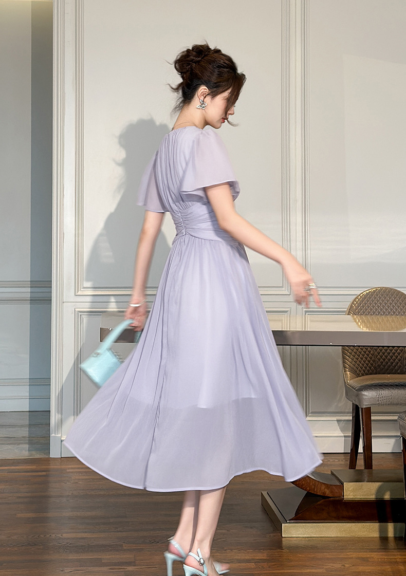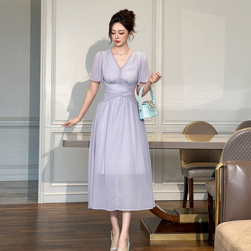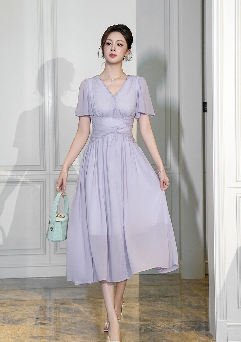 C-4388# 2025夏季新款女装法式V领收腰飘逸紫色连衣裙别致收腰长裙45246