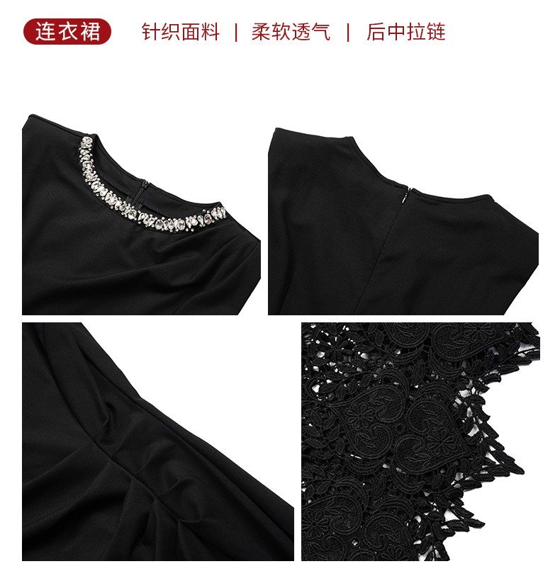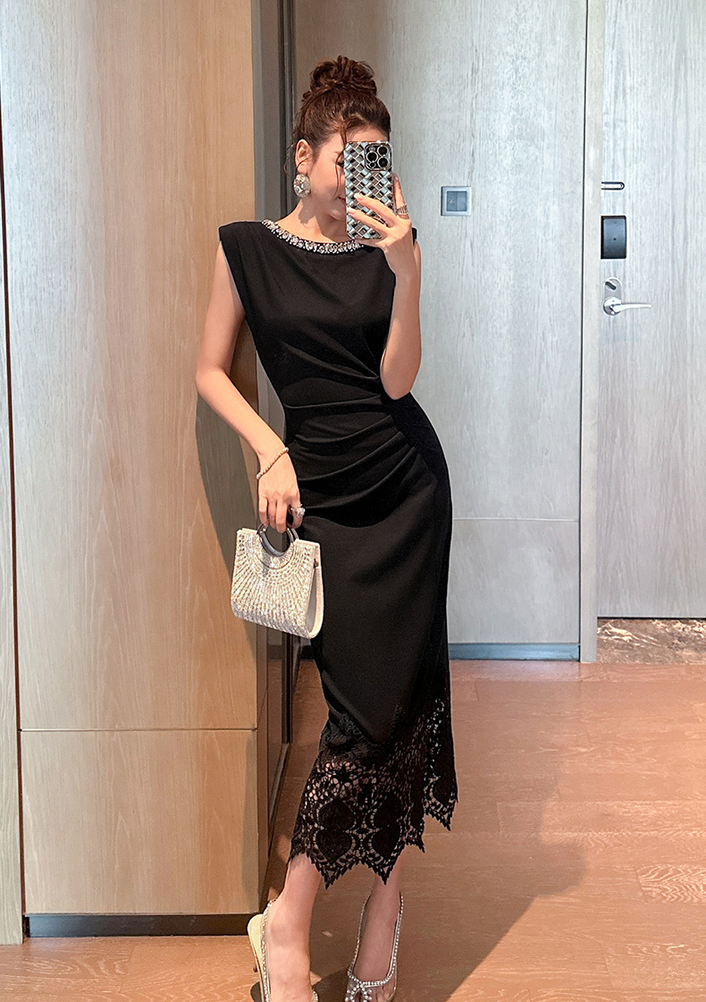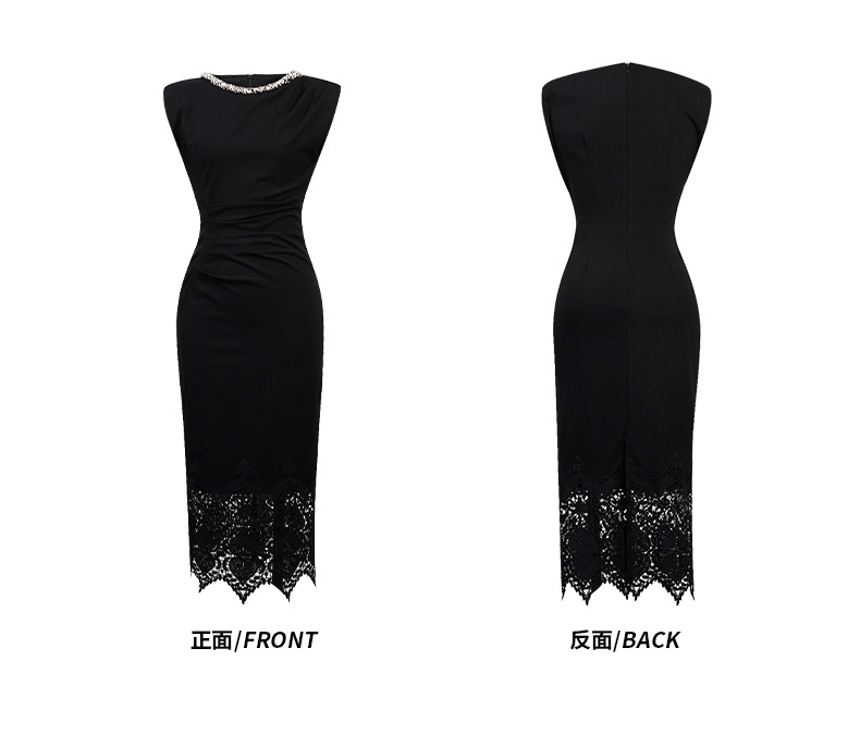 C-4403# 2025夏季新款法式镶钻圆领修身包臀拼接蕾丝连衣裙内搭长裙45258