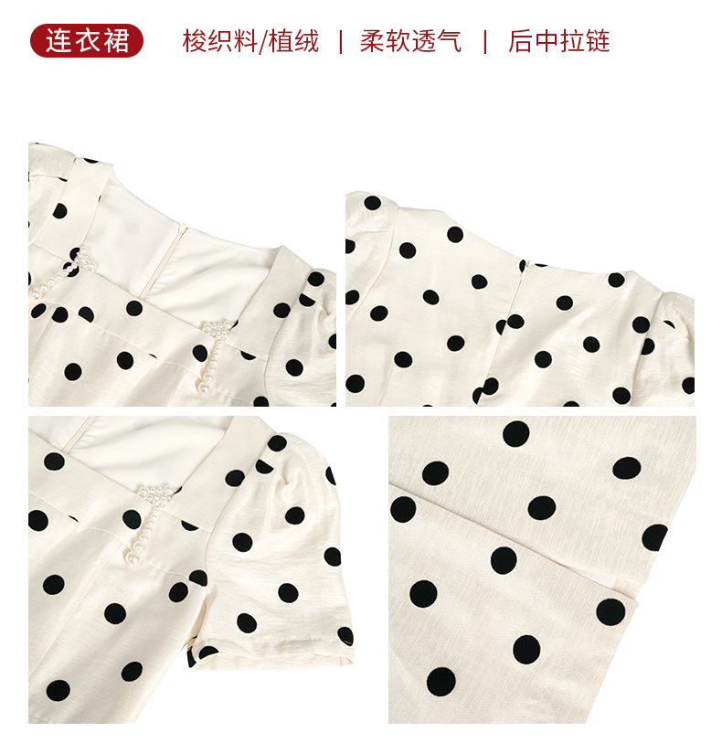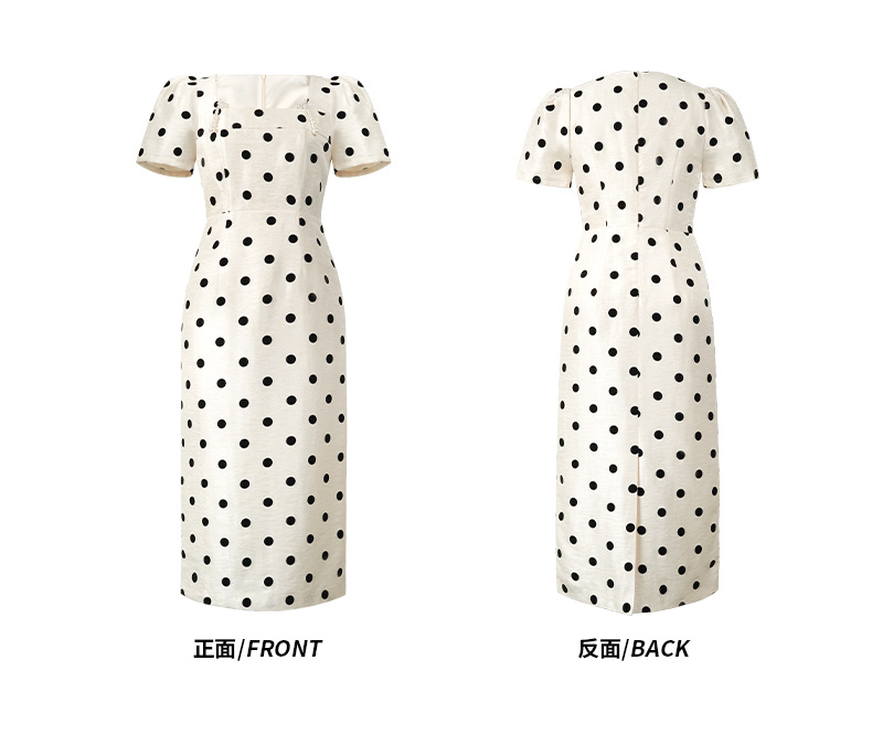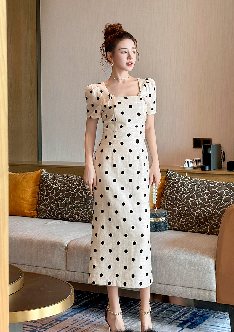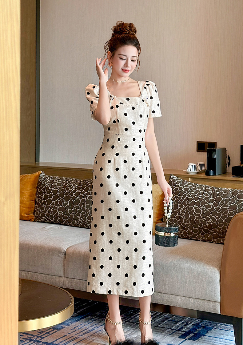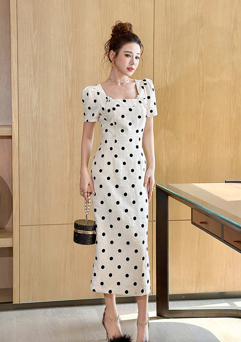 C-4415# 2025夏季新款女法式方领泡泡袖修身长款包臀波点短袖连衣裙15481