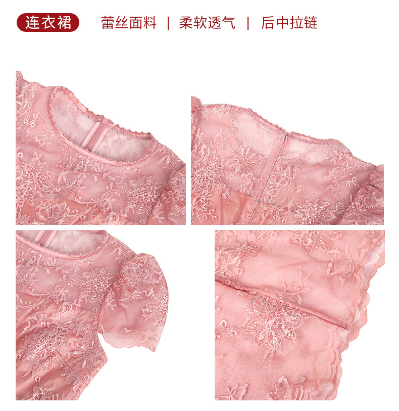 Home > 2025年9月26日---女装新款 > C-4490# 2025夏季新款女装法式圆领收腰显瘦粉色蕾丝连衣裙过膝长裙21821