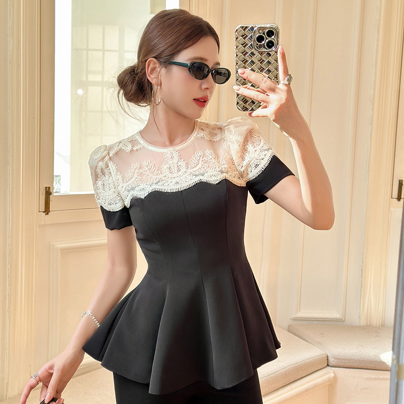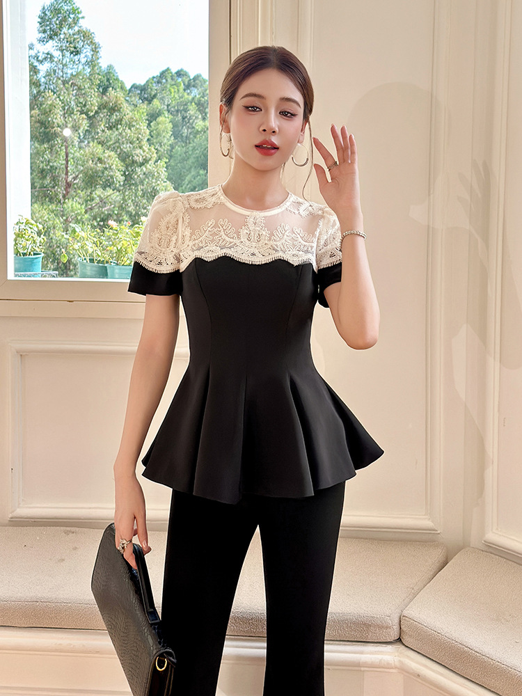 C-4502# 2025早秋新款女装御姐风气质撞色拼接收腰显瘦荷叶边上衣11627