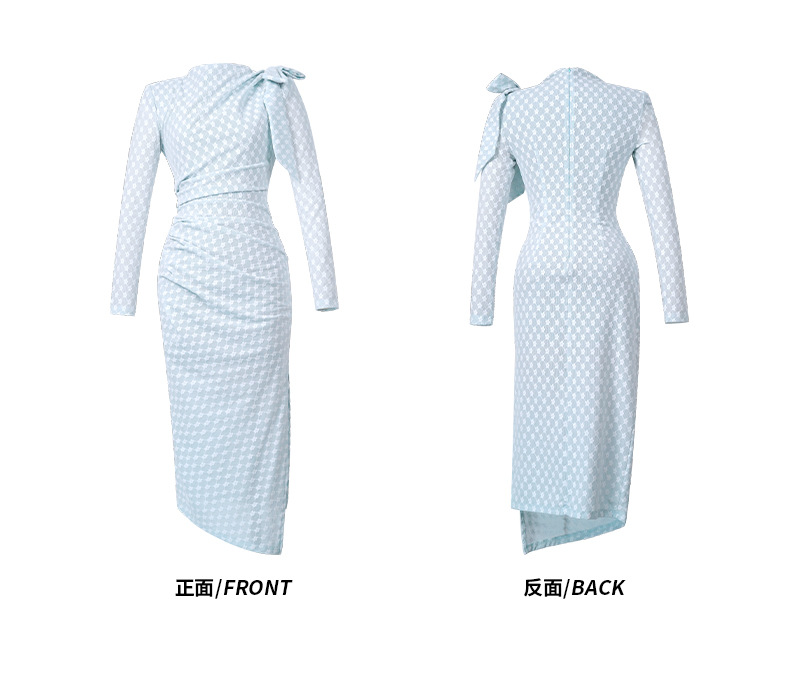 C-4548# 冬装新款女名媛气质设计感蝴蝶结修身开叉蓝色格纹连衣裙56009