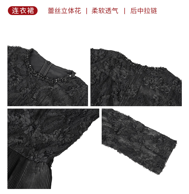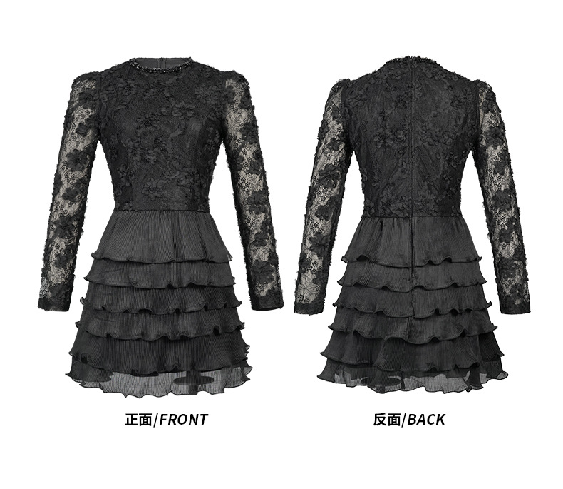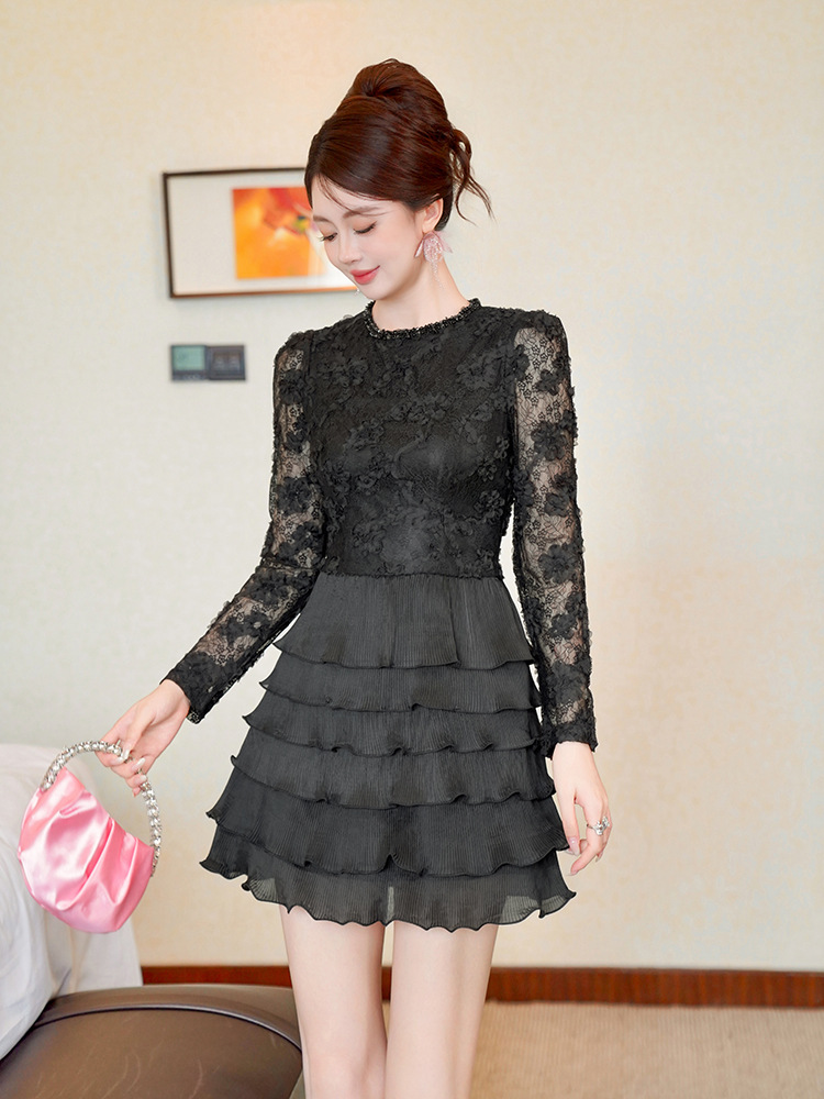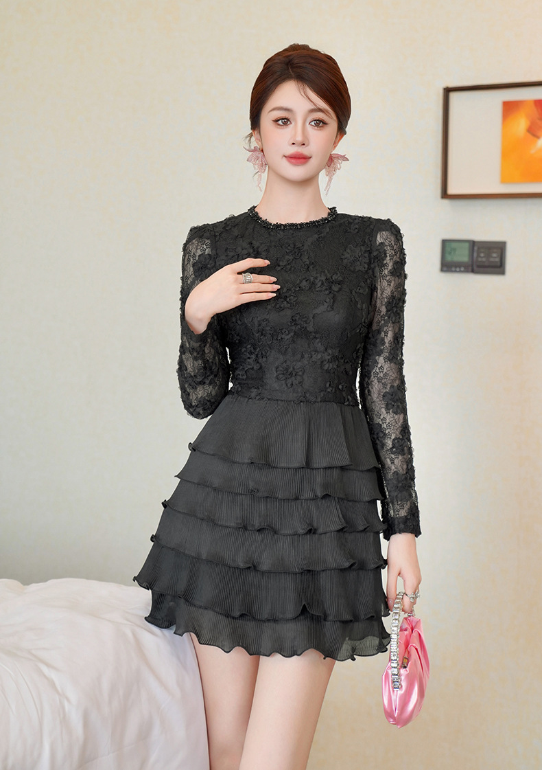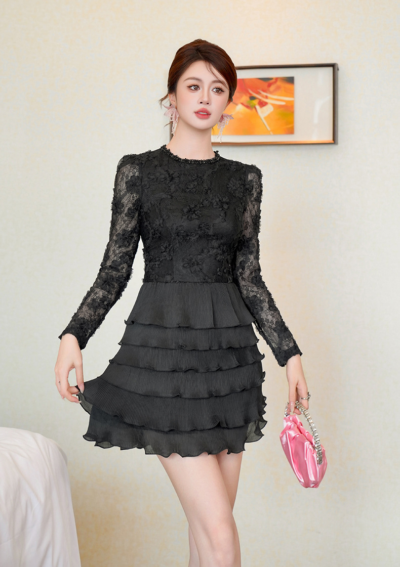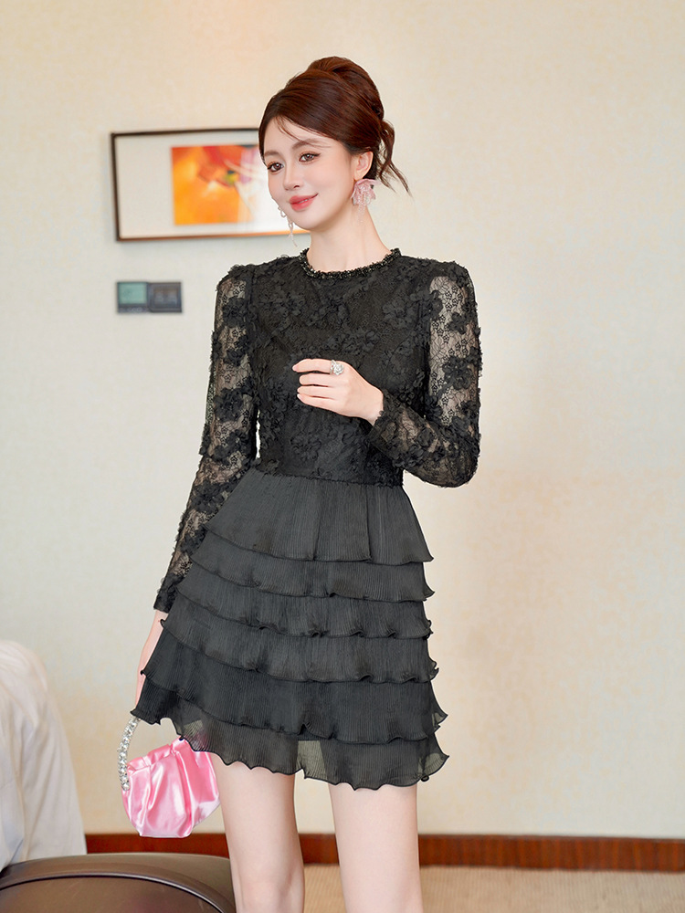 C-4550# 2025秋冬装新款女装法式镶钻圆领蕾丝拼接收腰层层蛋糕连衣裙9125
