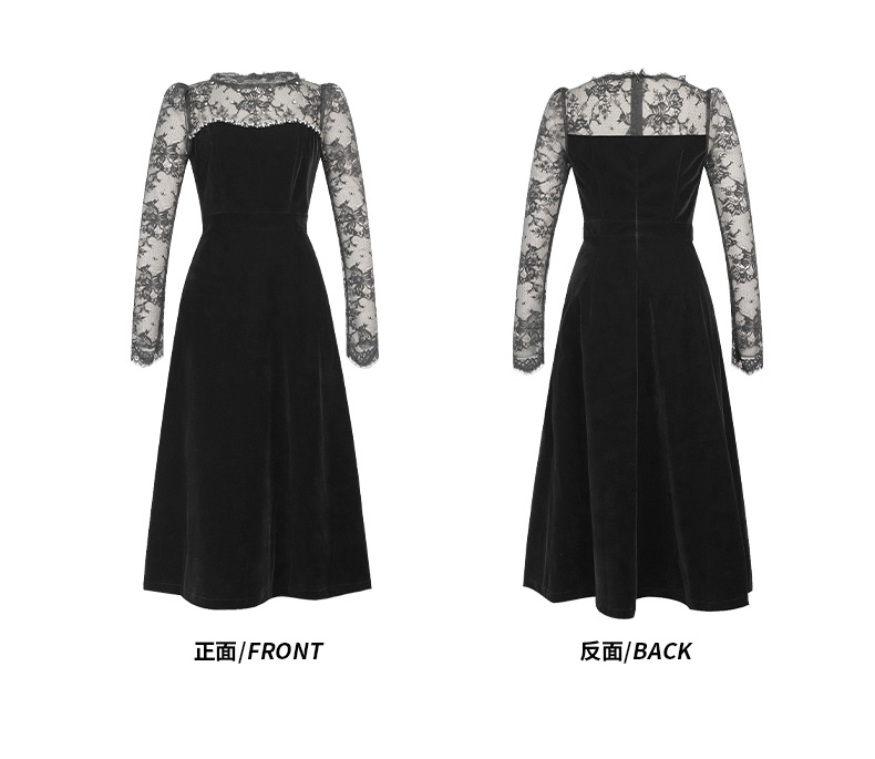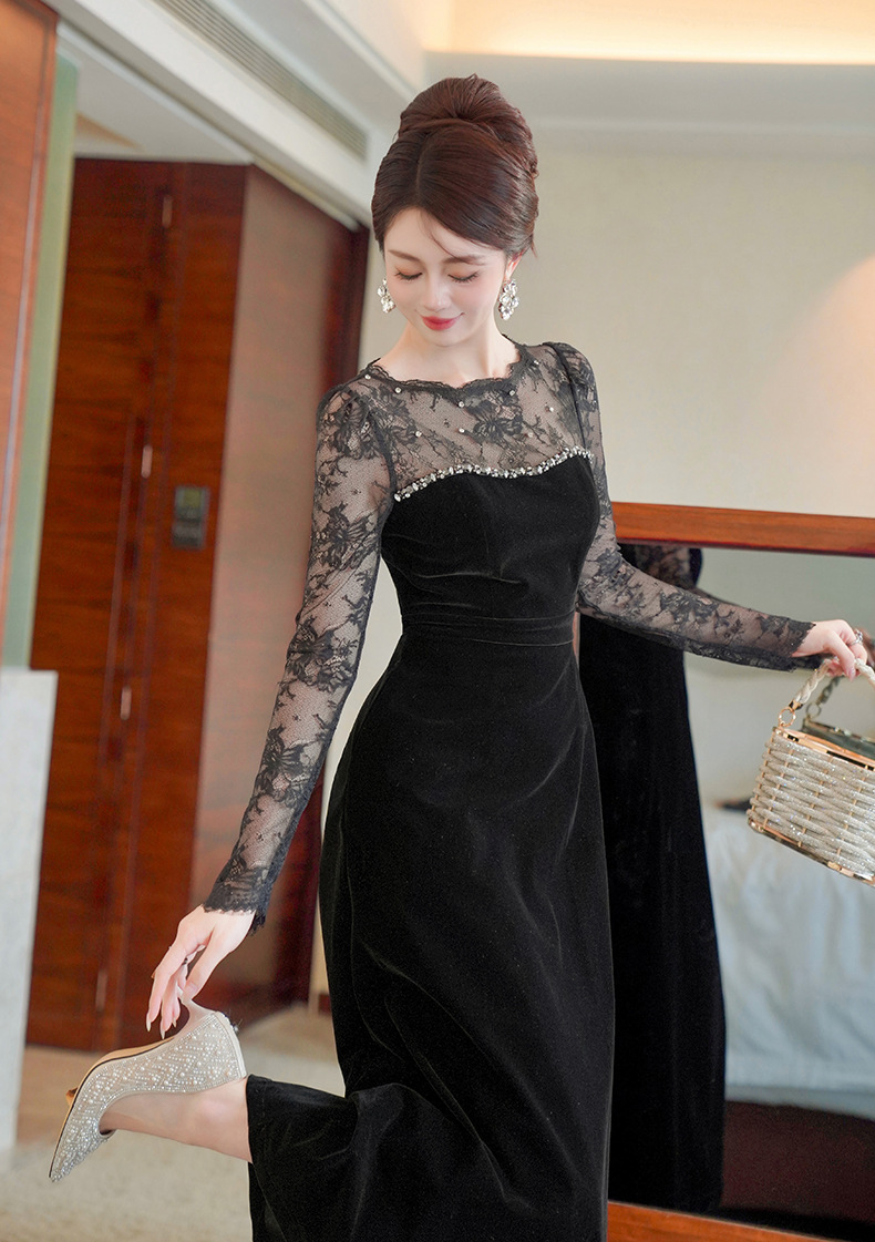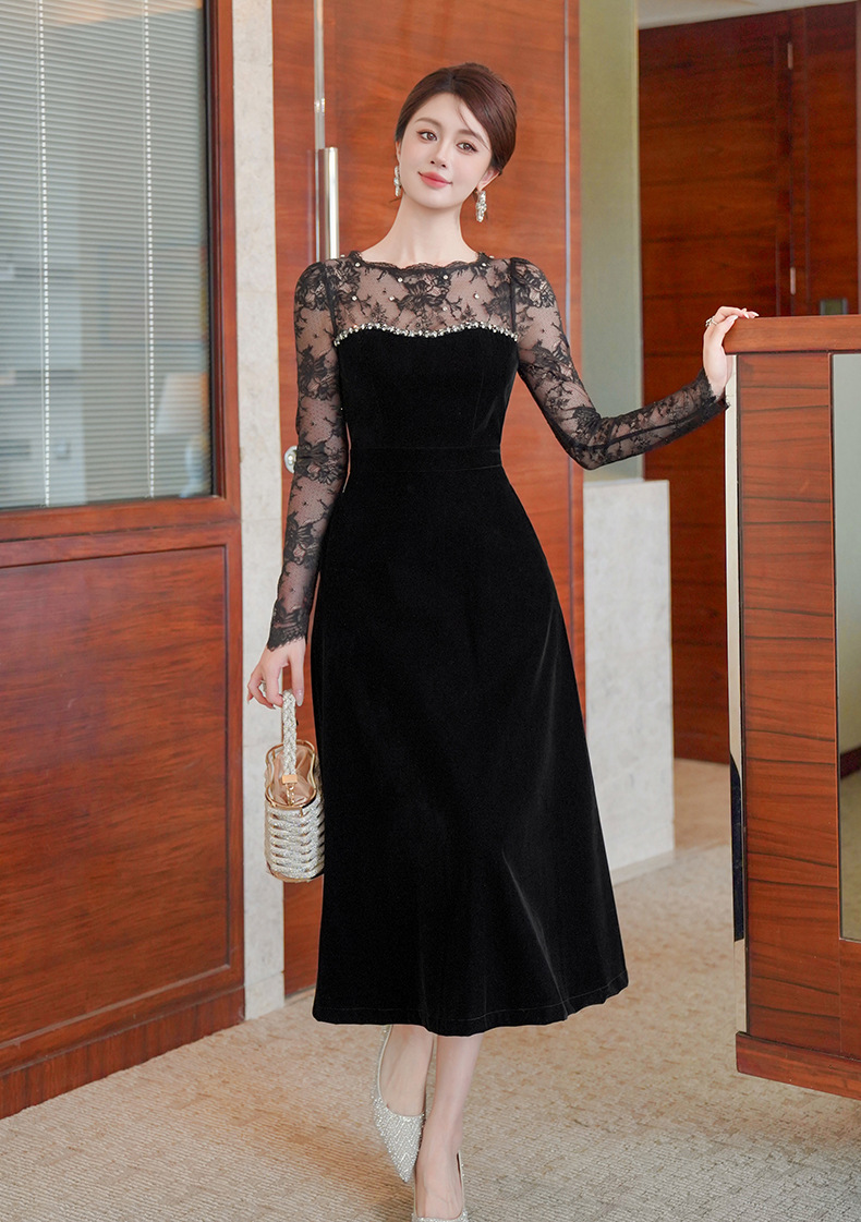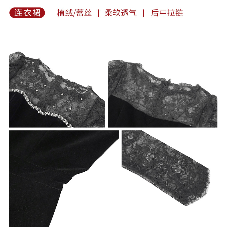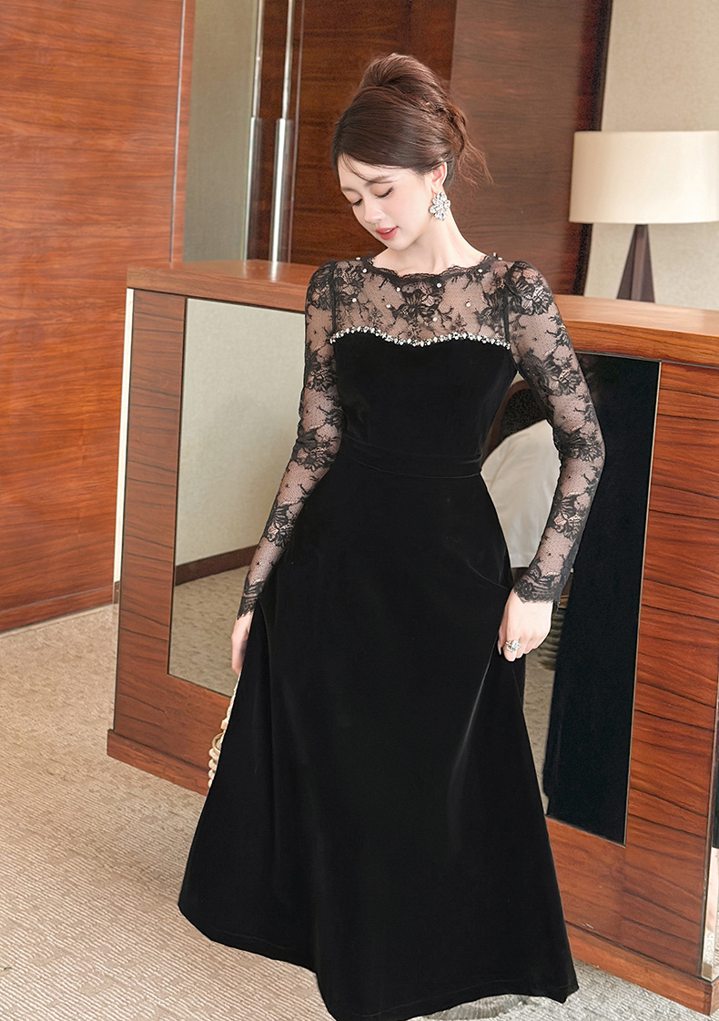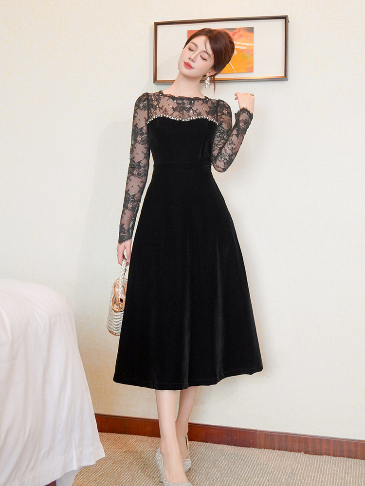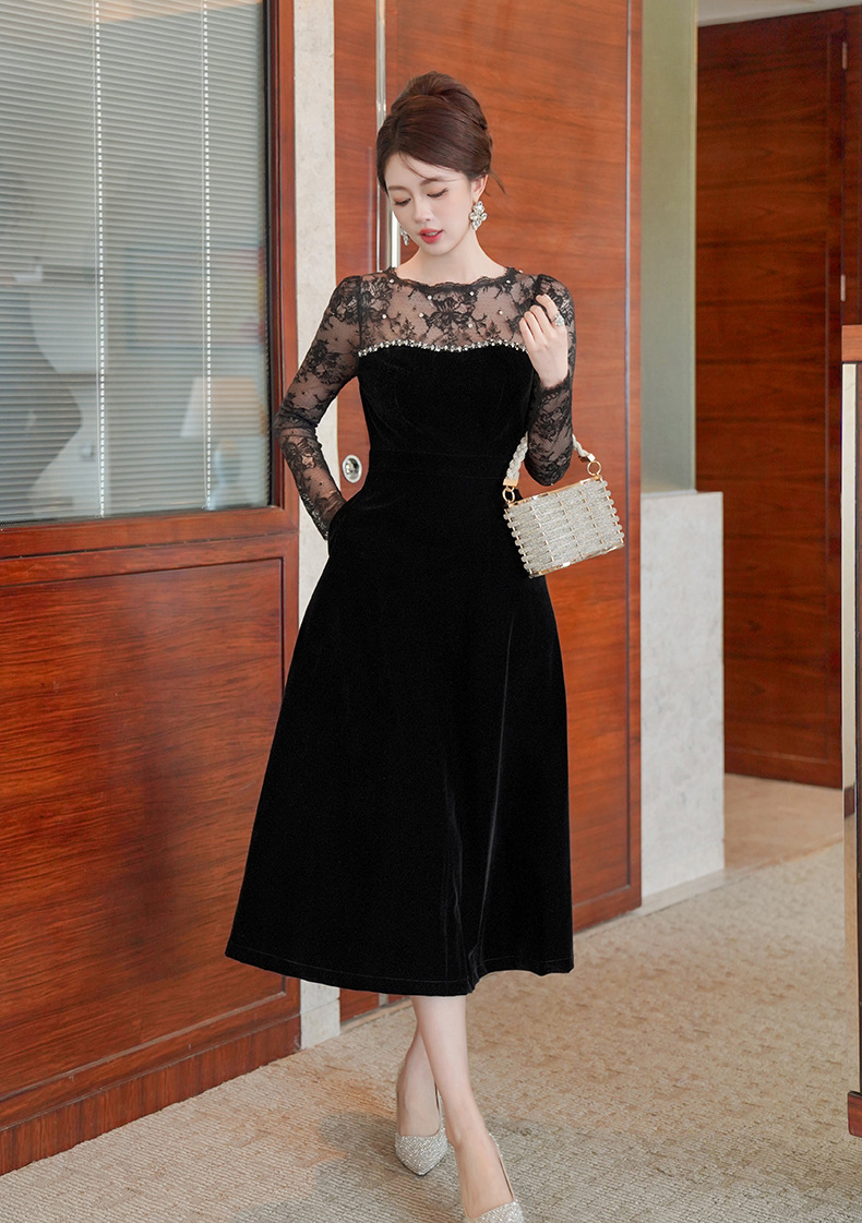 C-4552# miu系重工钉珠丝绒小黑裙年会礼服裙赫本复古收腰连衣裙女21881