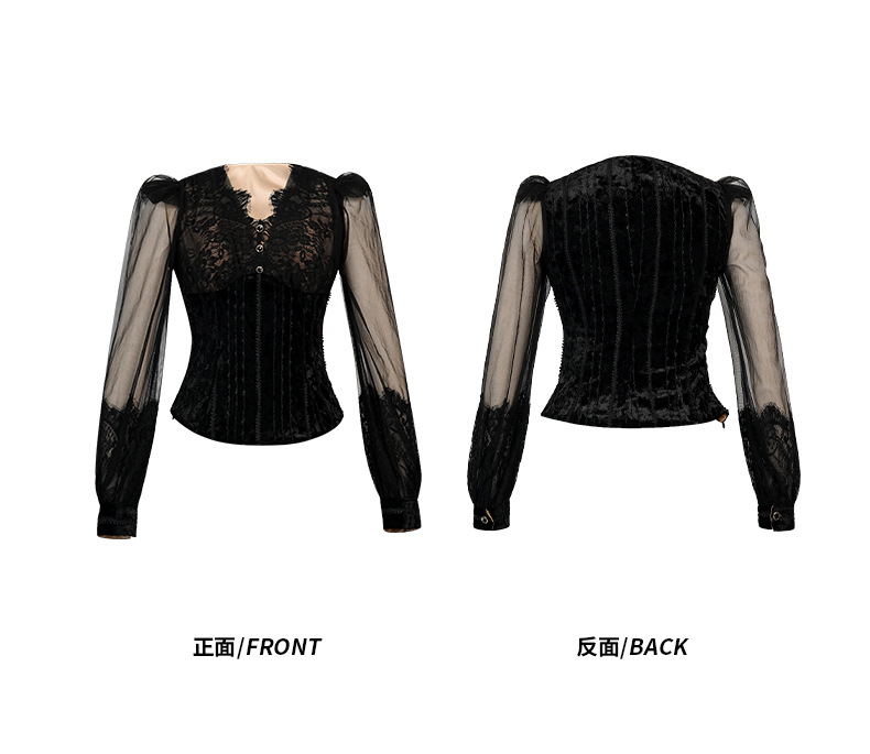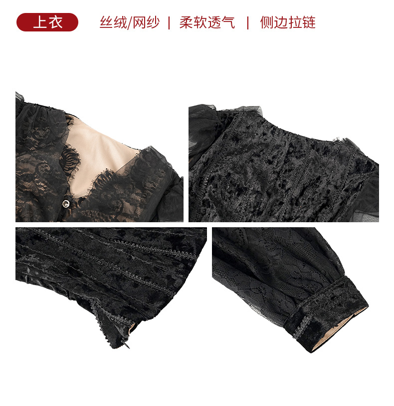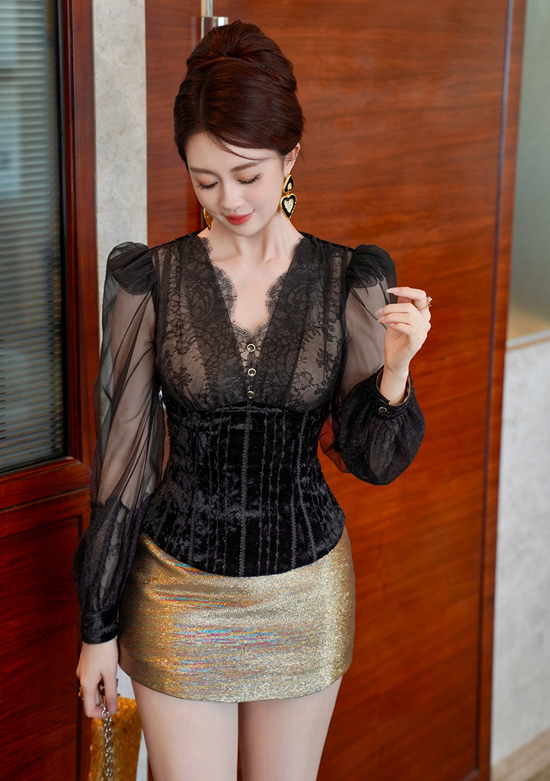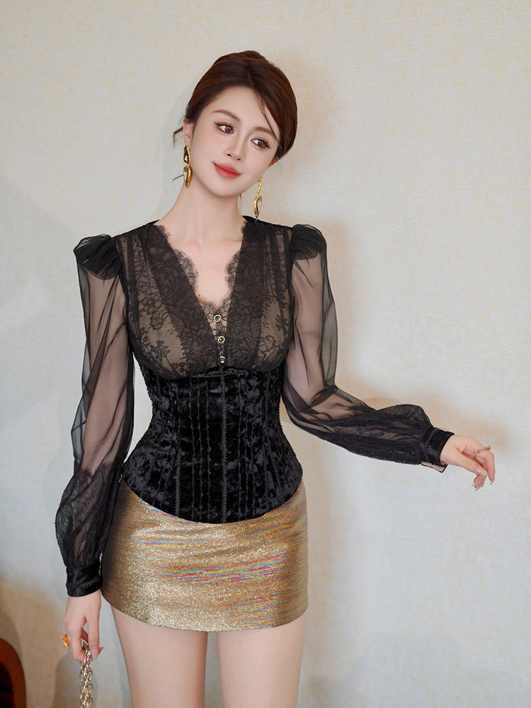 C-4553# 秋冬蕾丝花边拼接丝绒收腰打底衫设计感内搭纯欲显瘦T恤女21907