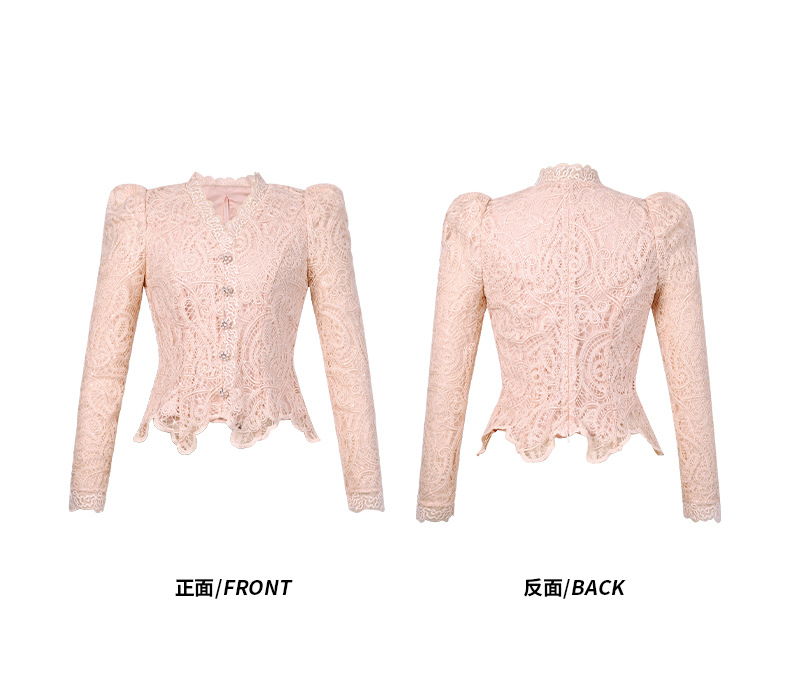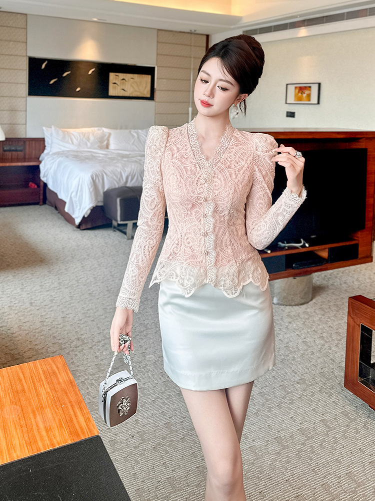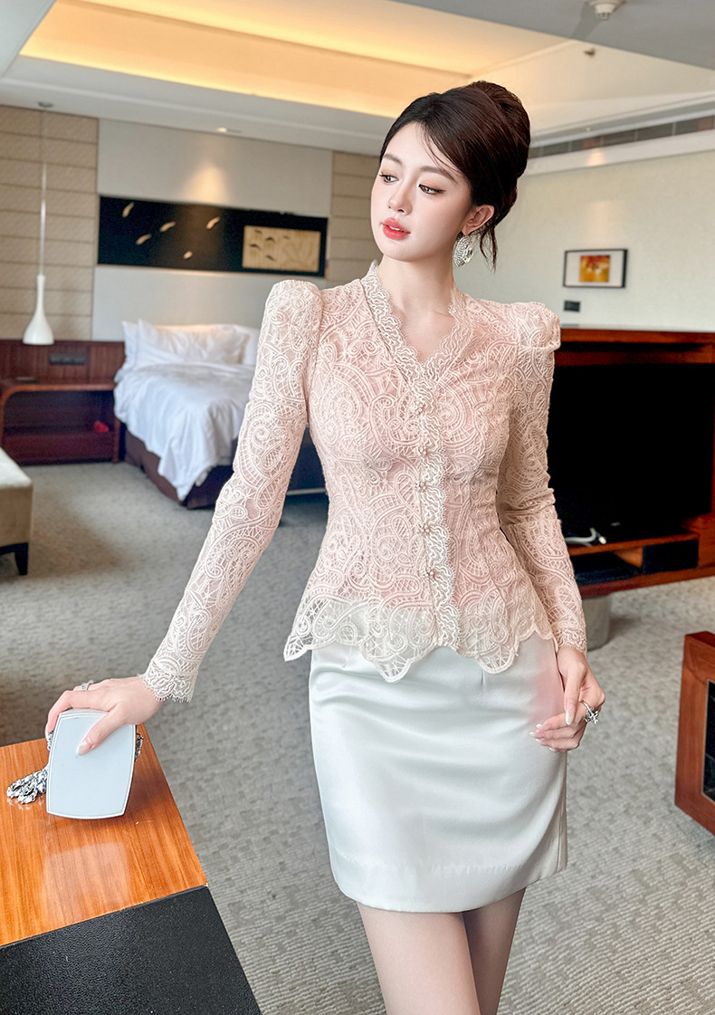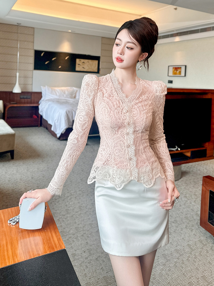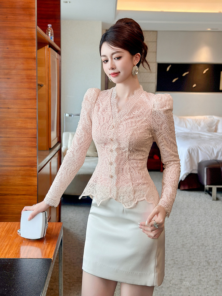 C-4554# miu系秋冬蕾丝衫长袖内搭可单穿可打底V领收腰修身上衣女11680