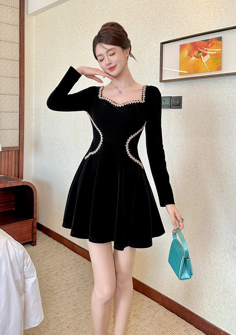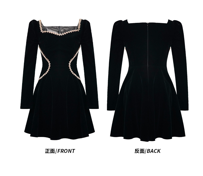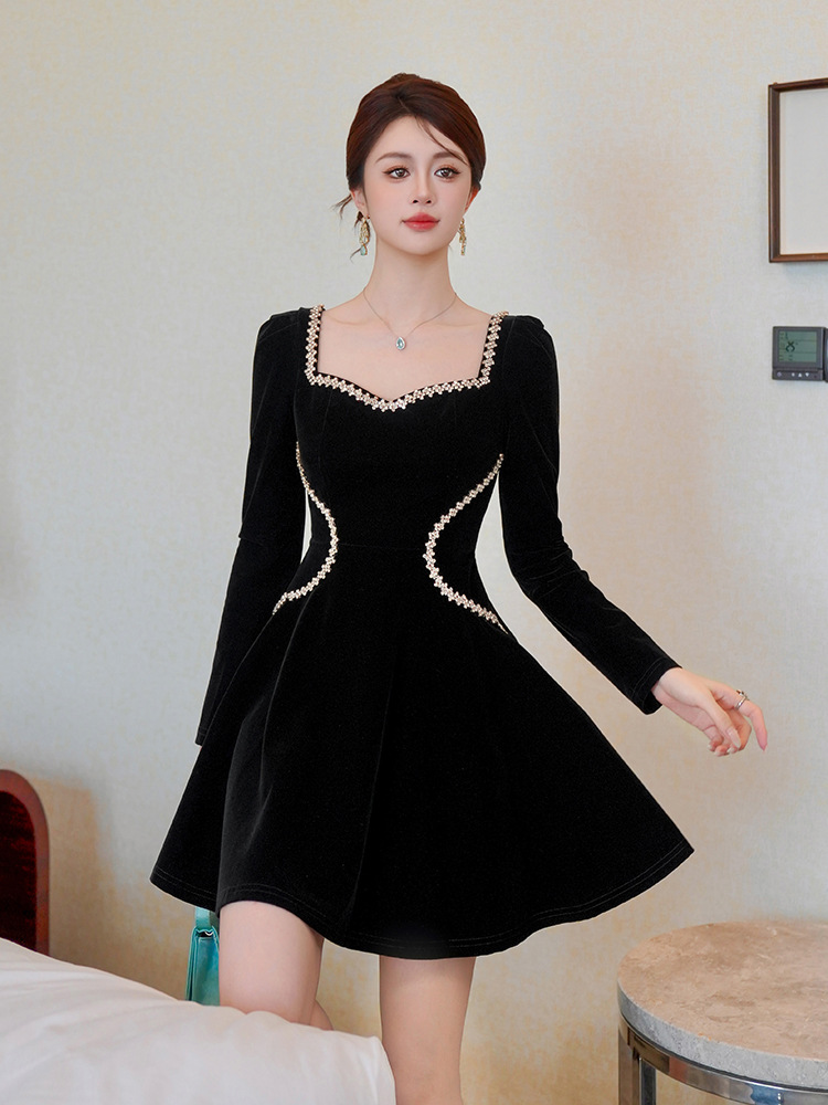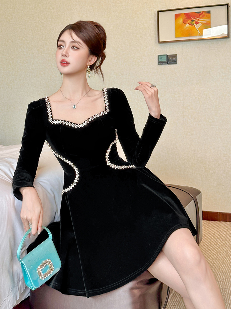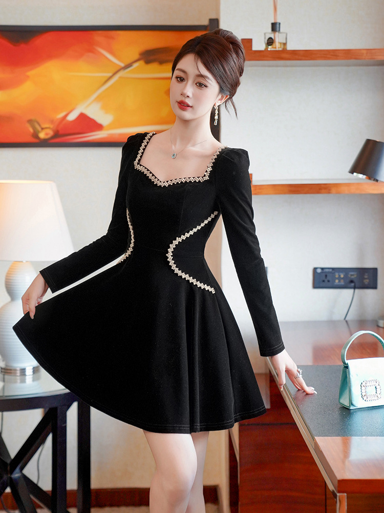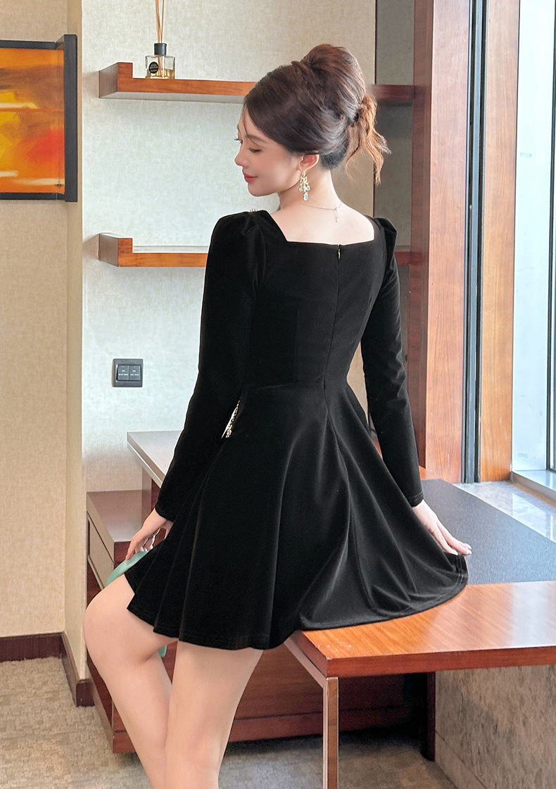C-4555# miu系赫本风丝绒方领连衣裙秋冬女修身显瘦小黑裙生日礼服裙21939