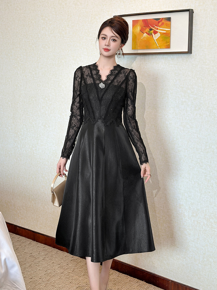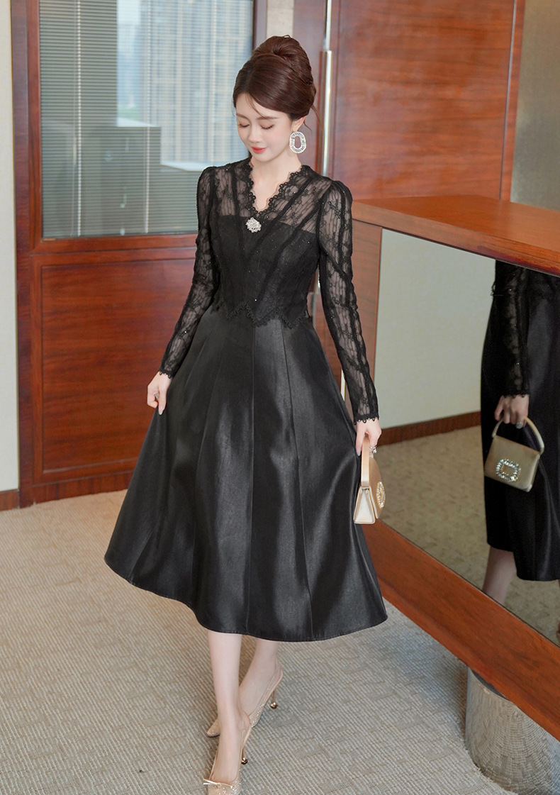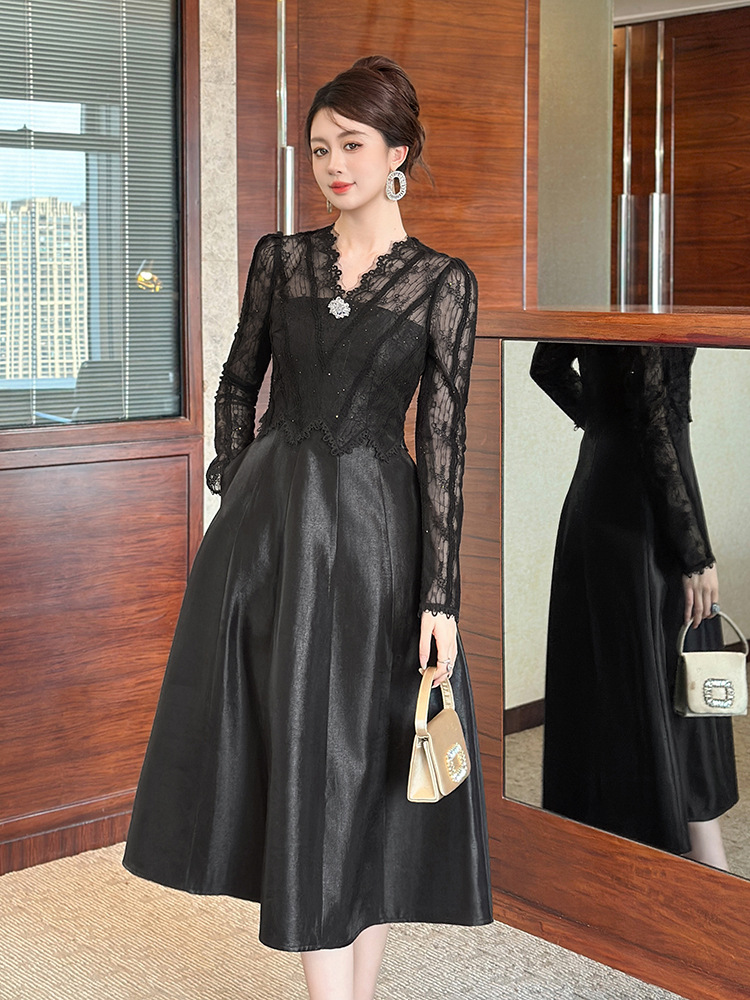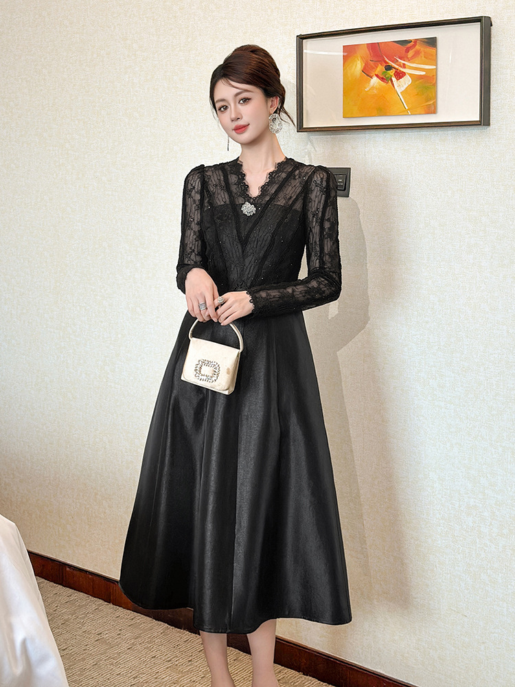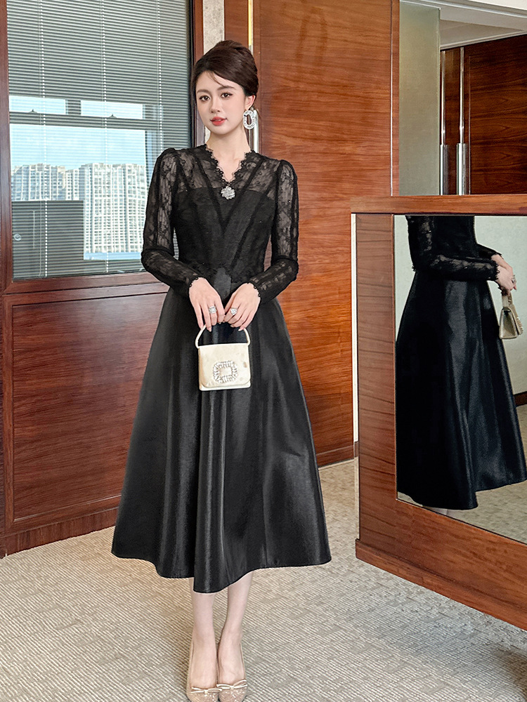 C-4557# 法式千金风蕾丝拼接收腰V领连衣裙女长款黑色年会礼服裙秋冬21882