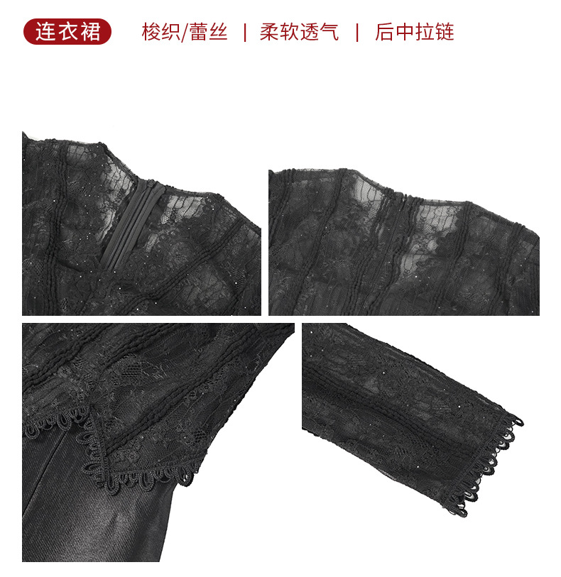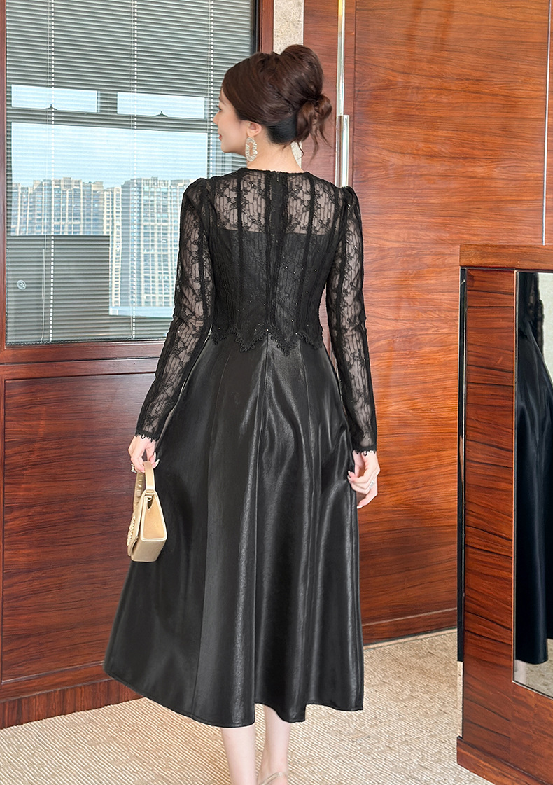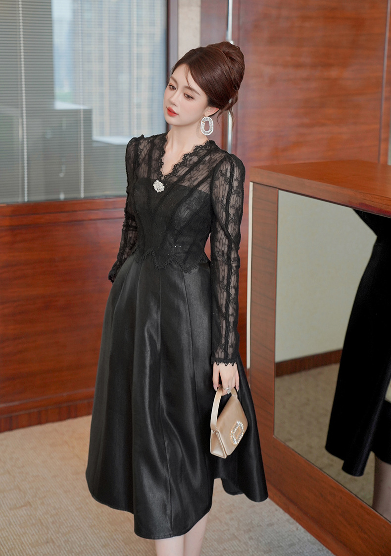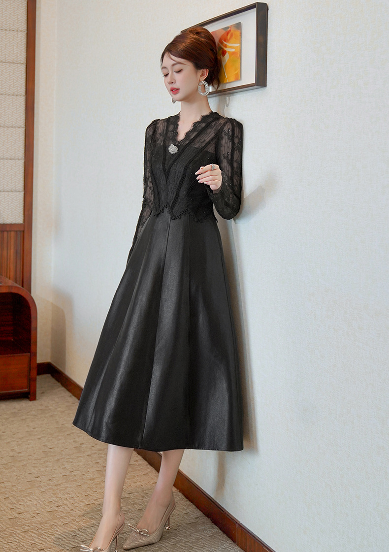 C-4557# 法式千金风蕾丝拼接收腰V领连衣裙女长款黑色年会礼服裙秋冬21882