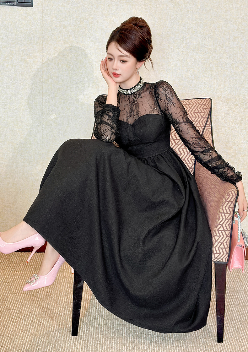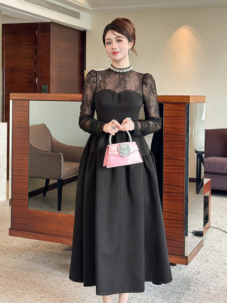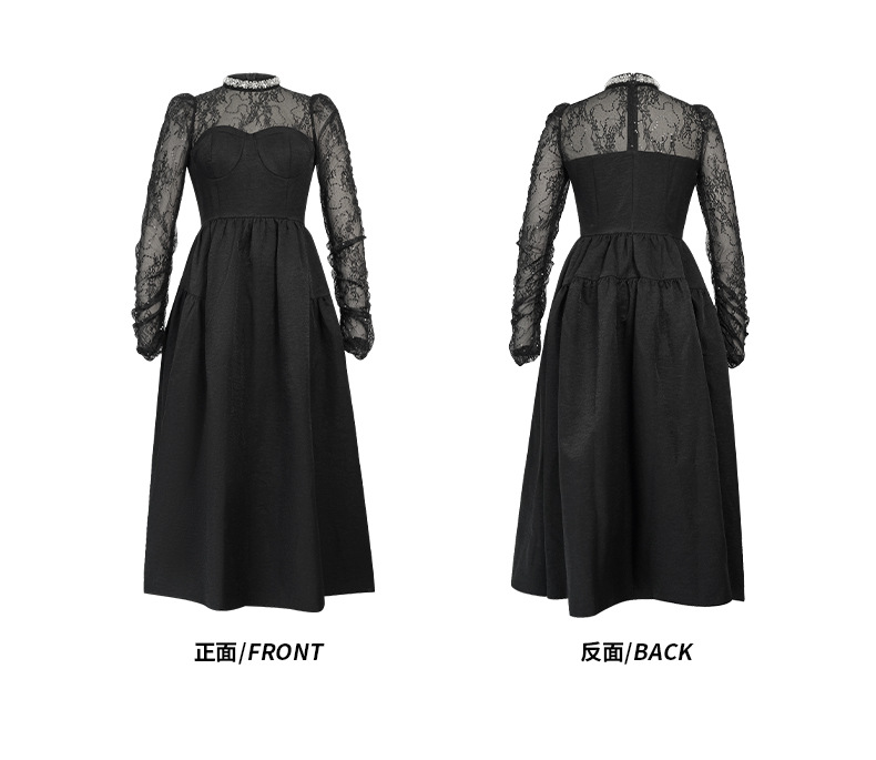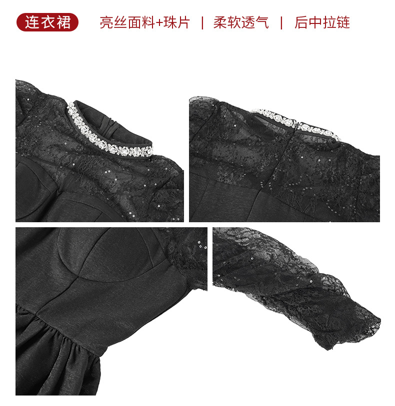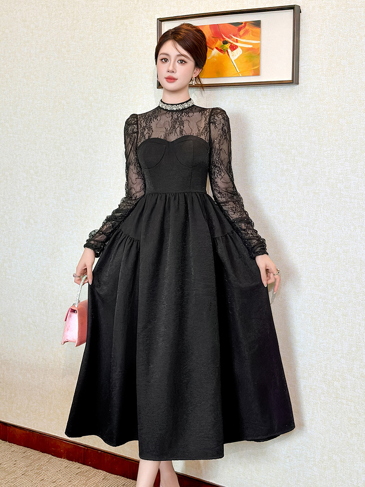 C-4560# 圆领镶钻收腰连衣裙女早秋新款法式复古显瘦赫本风蓬蓬长裙9965