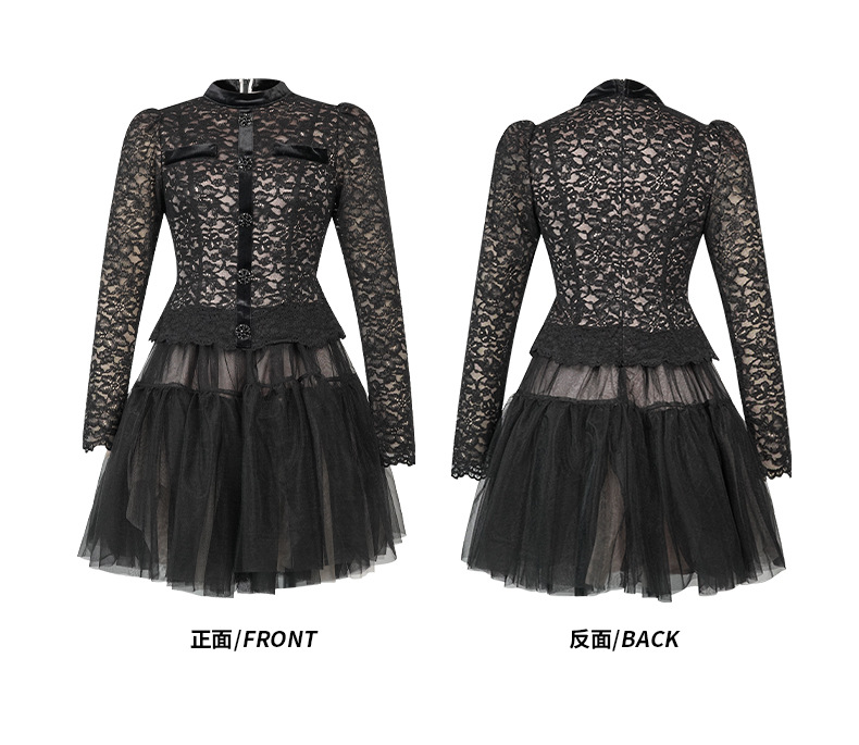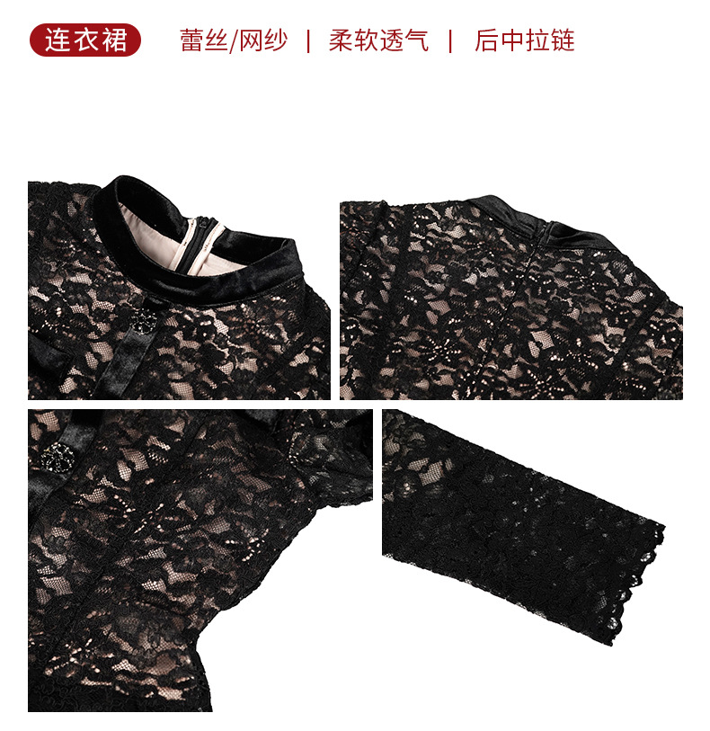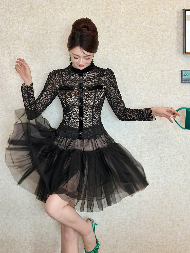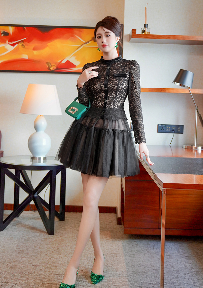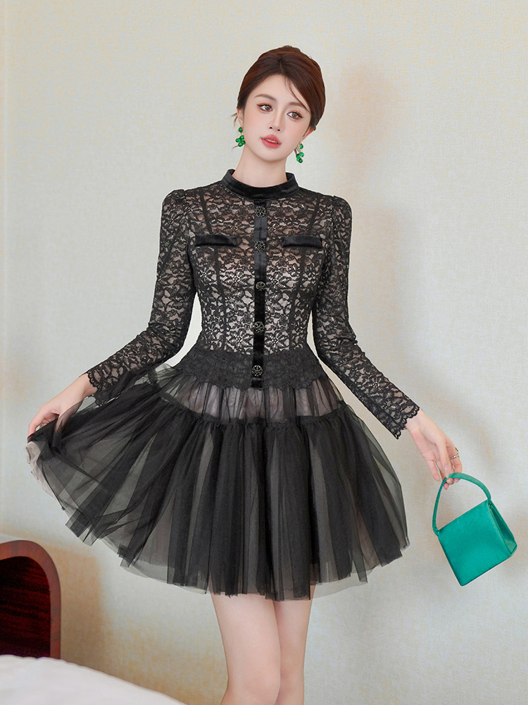 C-4562# 名媛气质蕾丝拼接网纱蓬蓬仙女连衣裙长袖约会生日礼服裙女45347