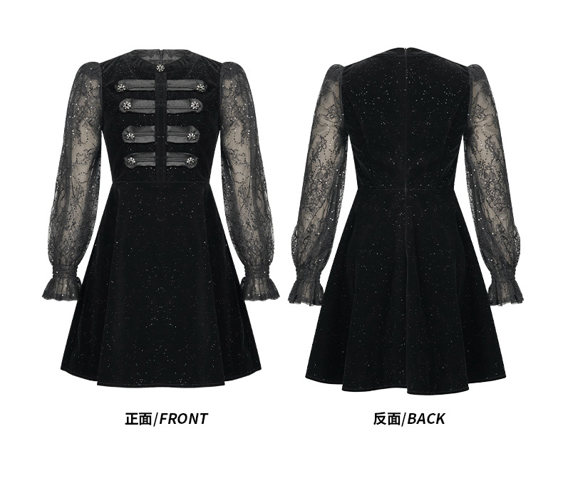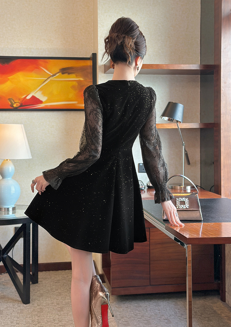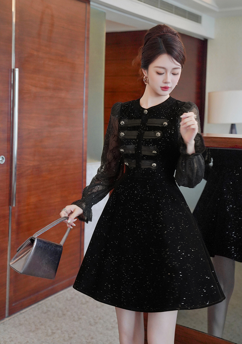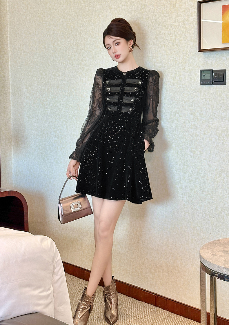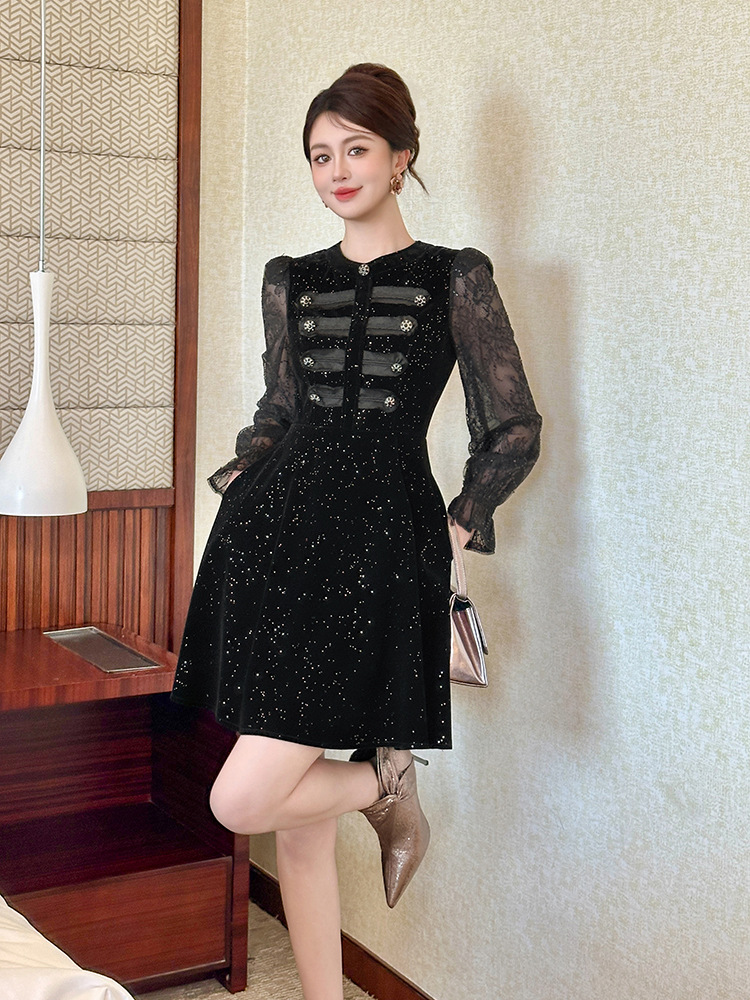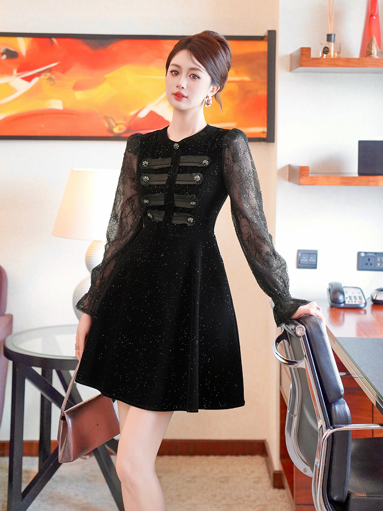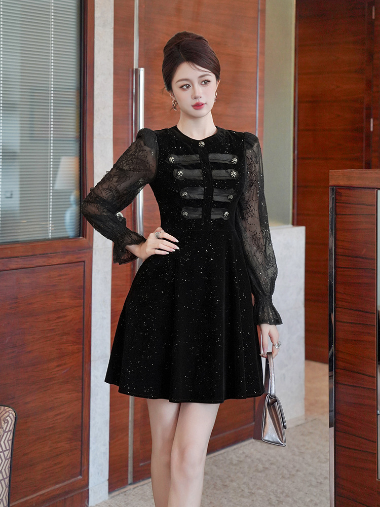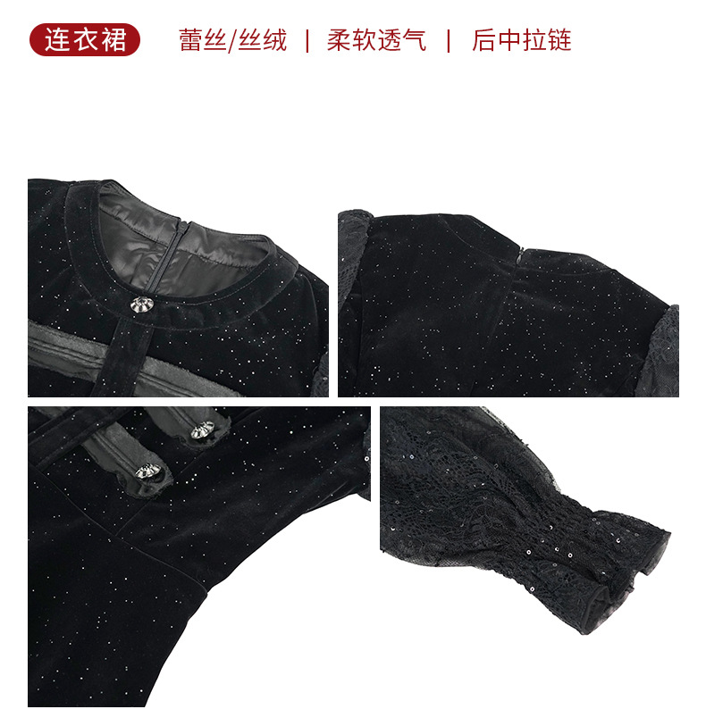 C-4566# miu系法式复古礼服裙千金赫本风丝绒连衣裙收腰显瘦小黑裙45401