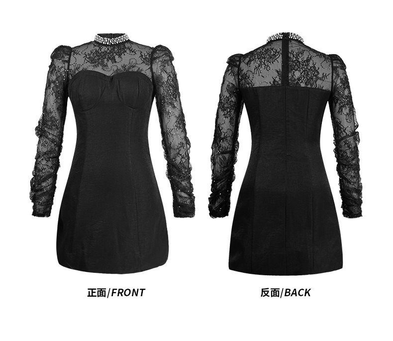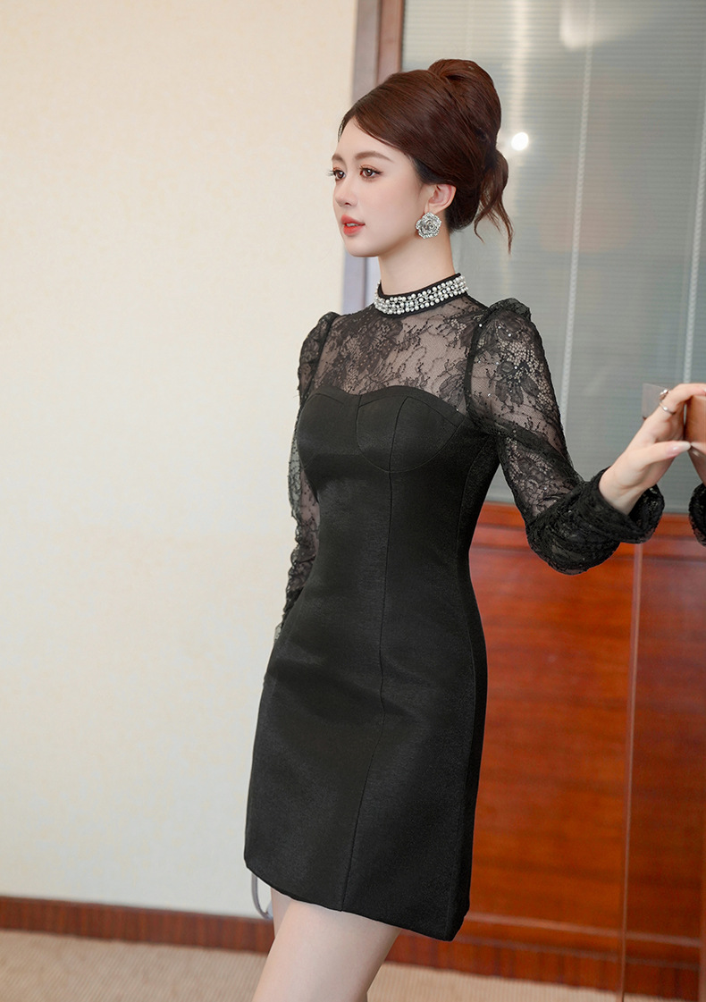 C-4570# 重工镶钻圆领蕾丝长袖显瘦黑色连衣裙女小香风收腰a字小礼裙9674