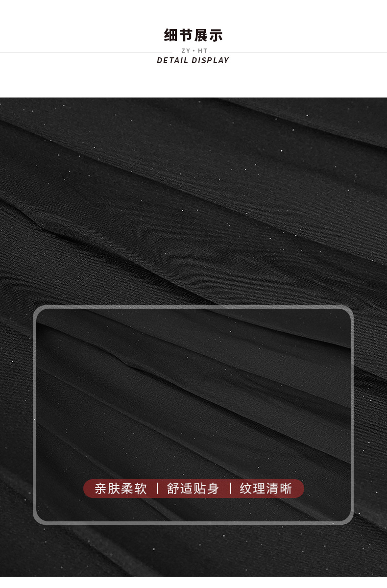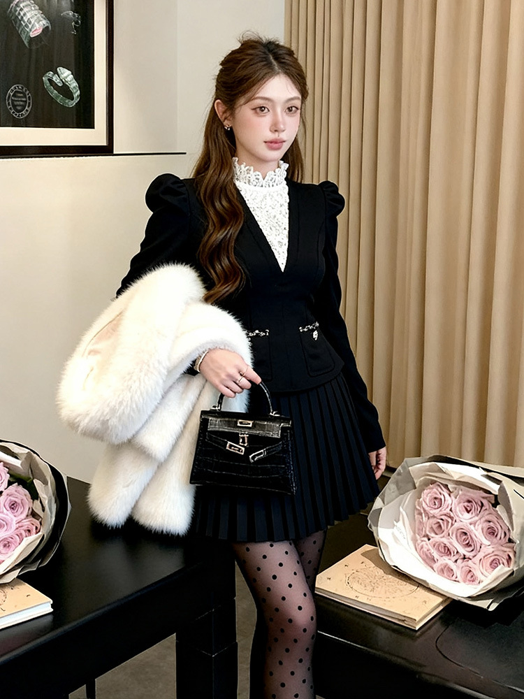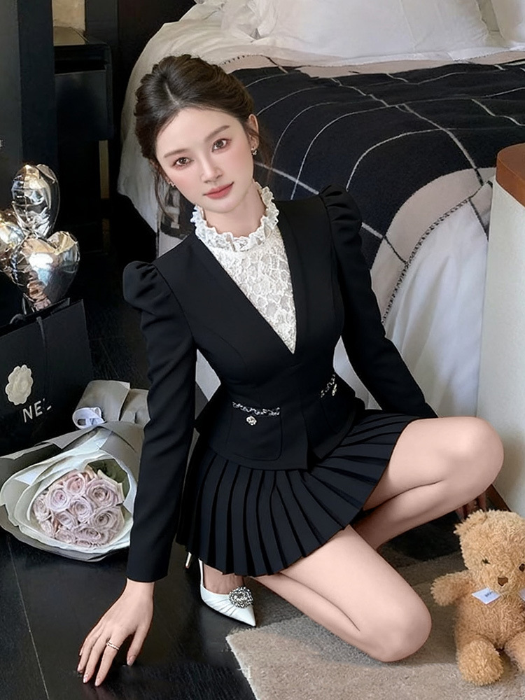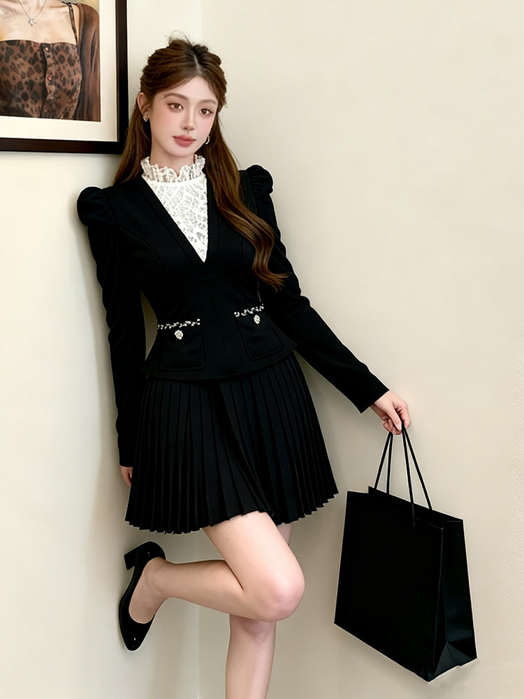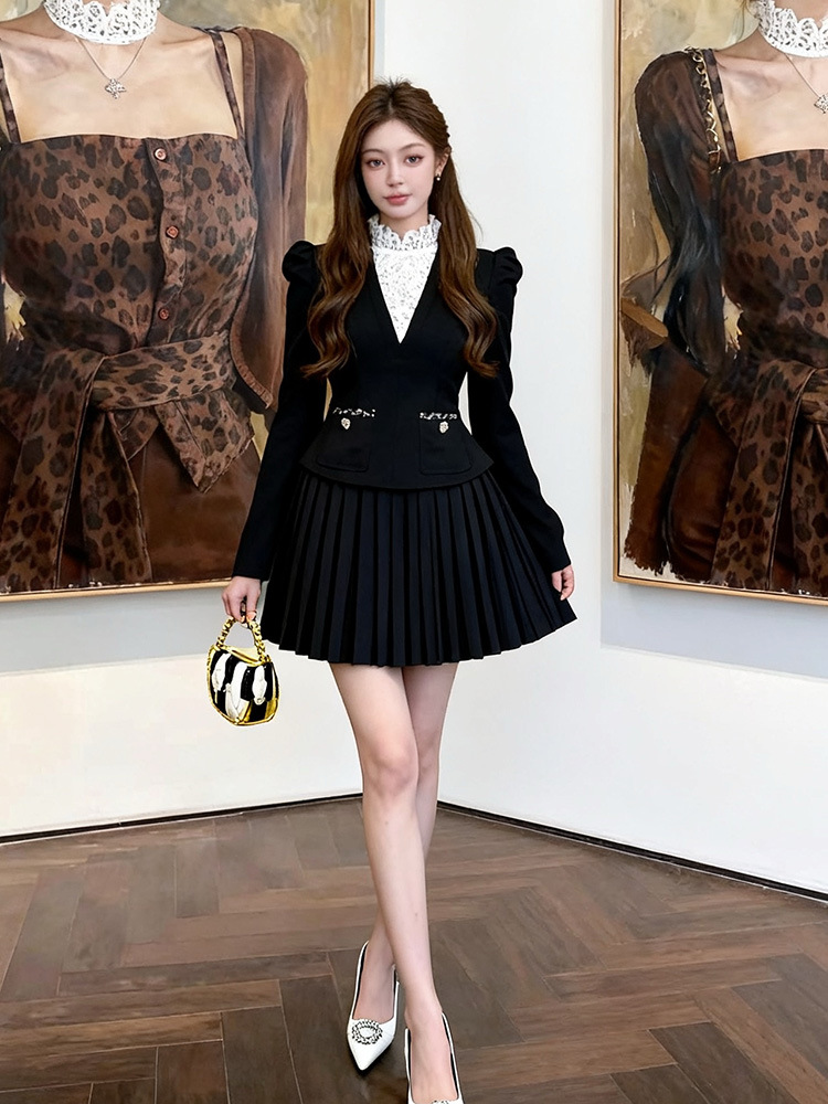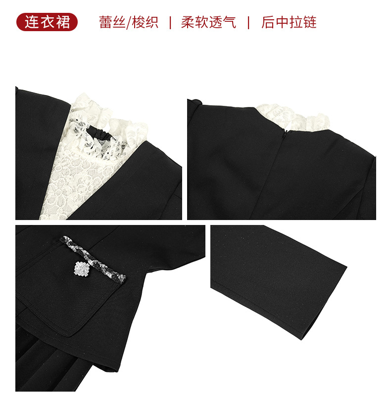 C-4575# 富家千金小香风蕾丝立领收腰百褶连衣裙秋冬黑色生日礼服裙45379
