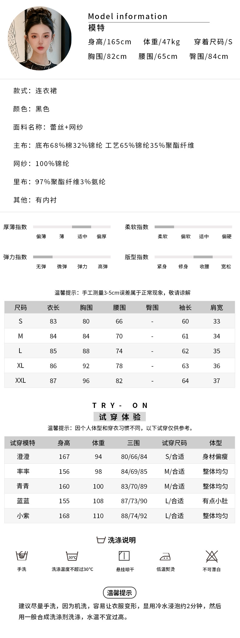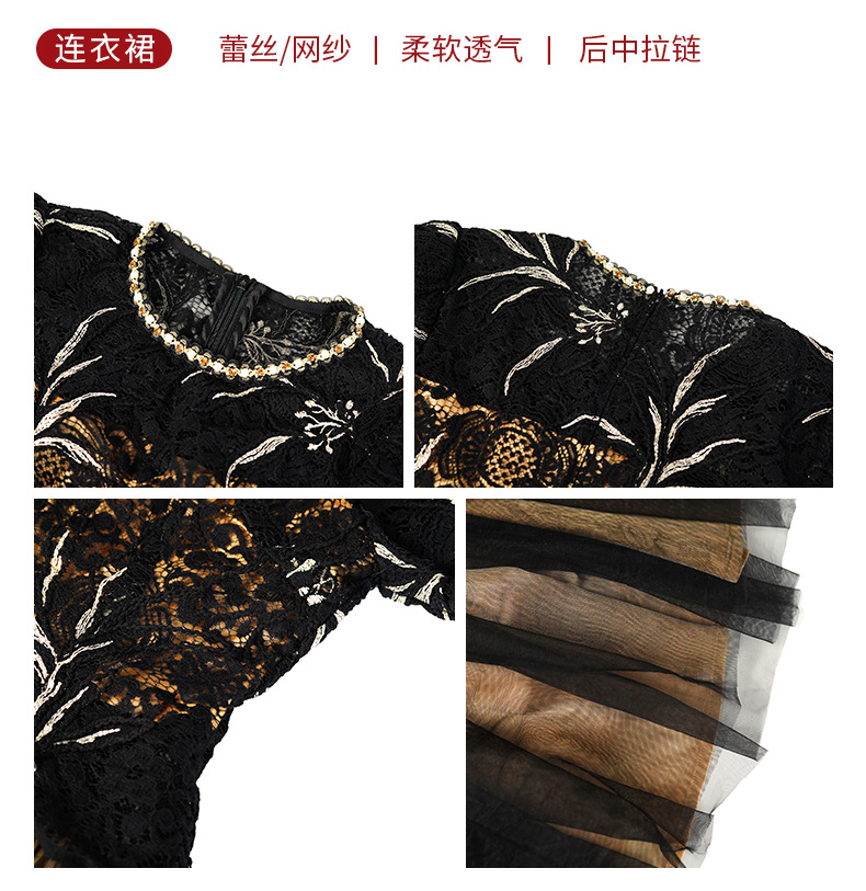 C-4579# 镶钻圆领收腰显瘦黑色蕾丝网纱拼接连衣裙女蓬蓬礼服短裙21930