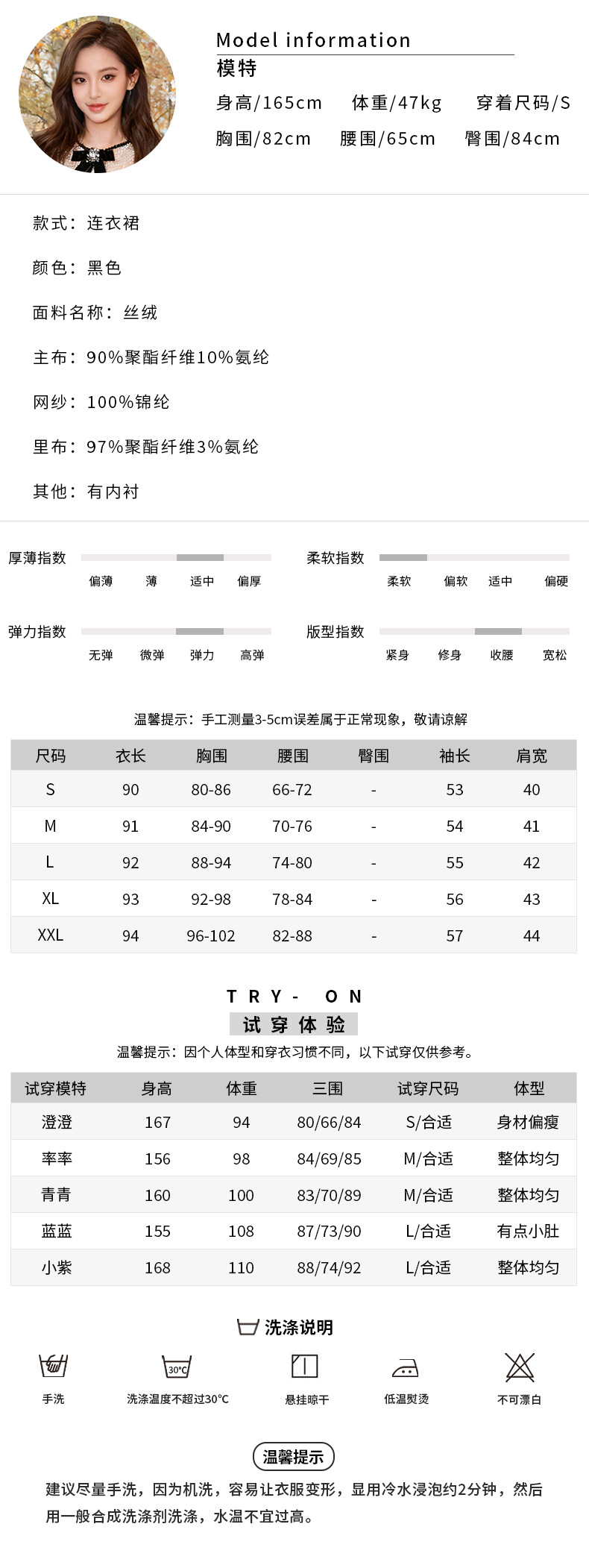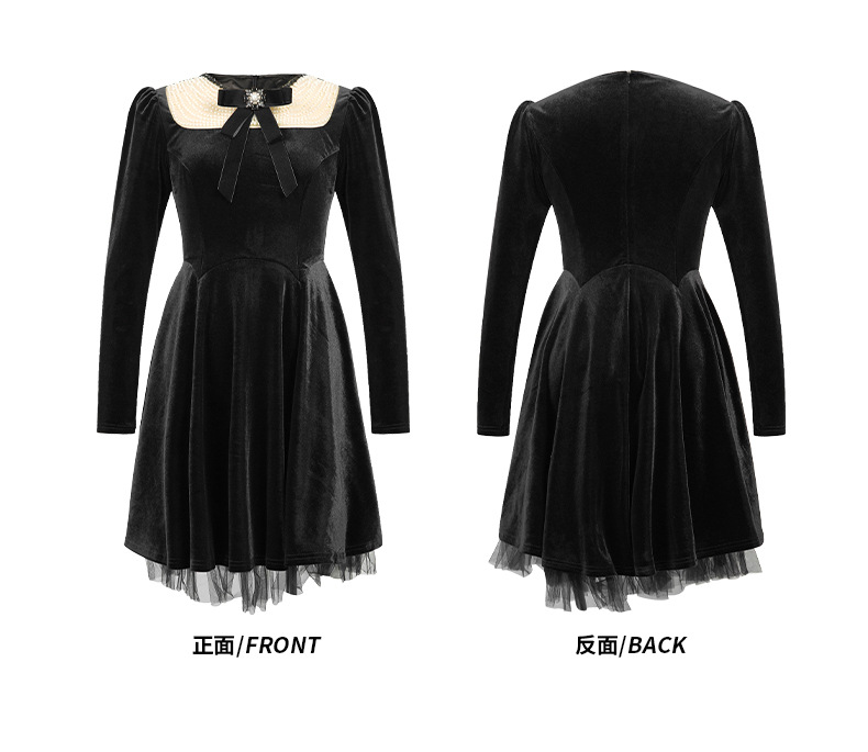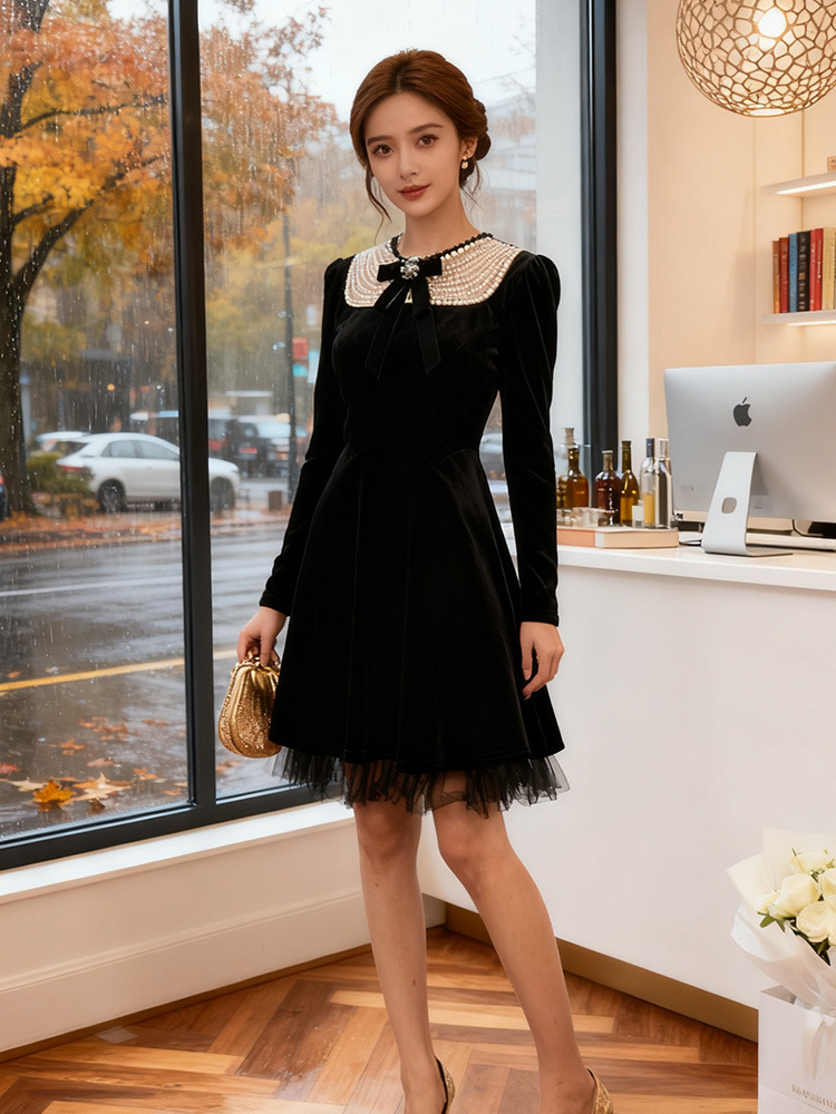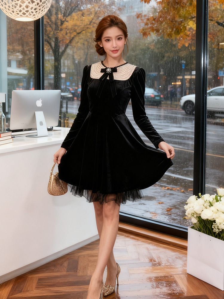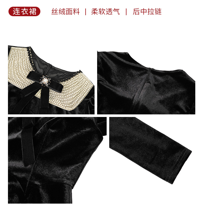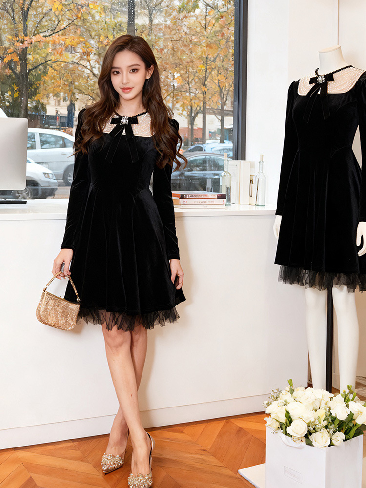 C-4581# miu系富家千金风珍珠圆领减龄蝴蝶结收腰蓬蓬丝绒长袖连衣裙45408