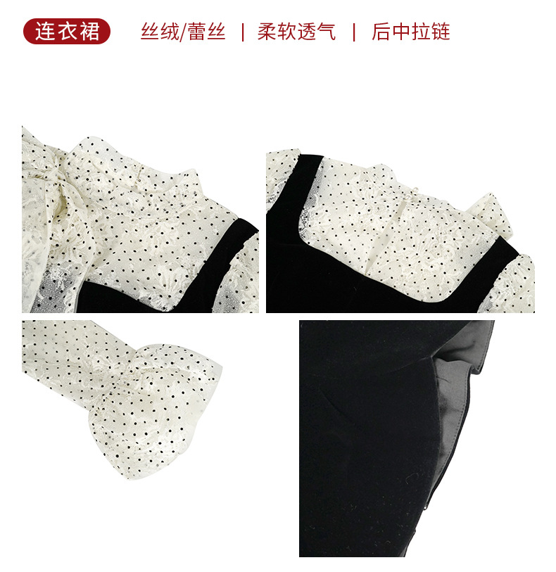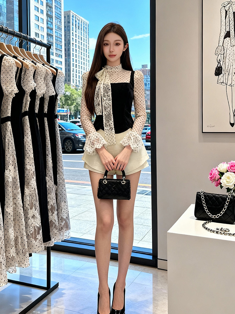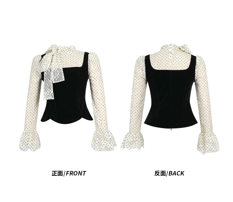 C-4584# 法式波点蕾丝拼接丝绒上衣新款蝴蝶结喇叭袖收腰显瘦衬衫15585