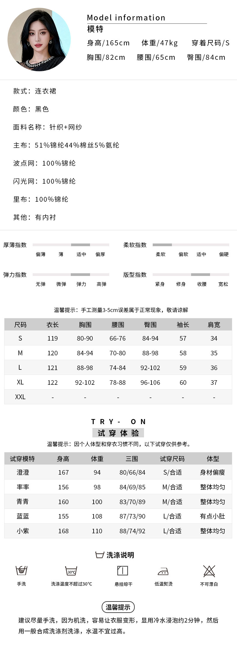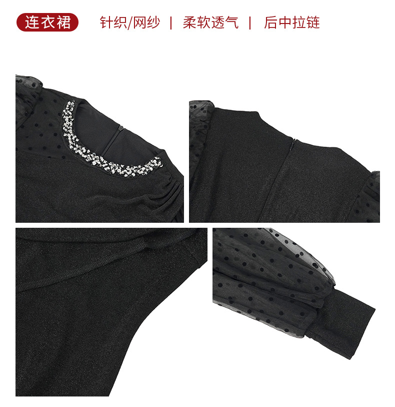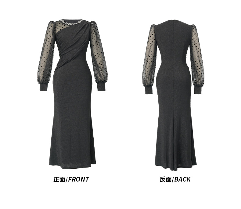 C-4586# 黑色波点网纱拼接连衣裙女冬圆领收腰显瘦鱼尾裙晚礼服长裙21898