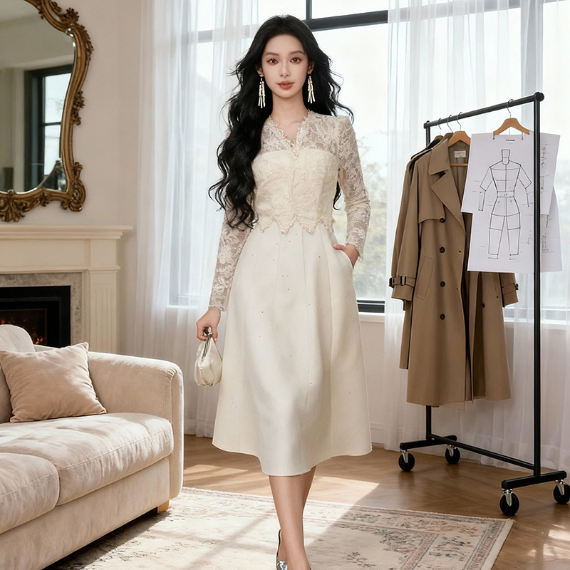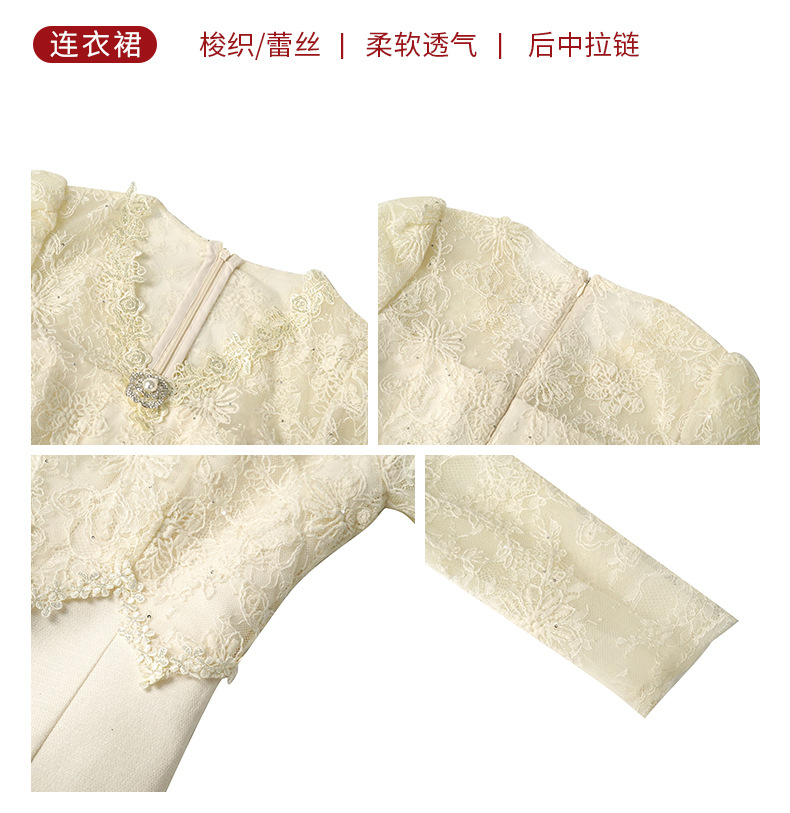 C-4589# 法式蕾丝拼接连衣裙女2025新款长袖收腰显瘦礼服长款A字裙21956