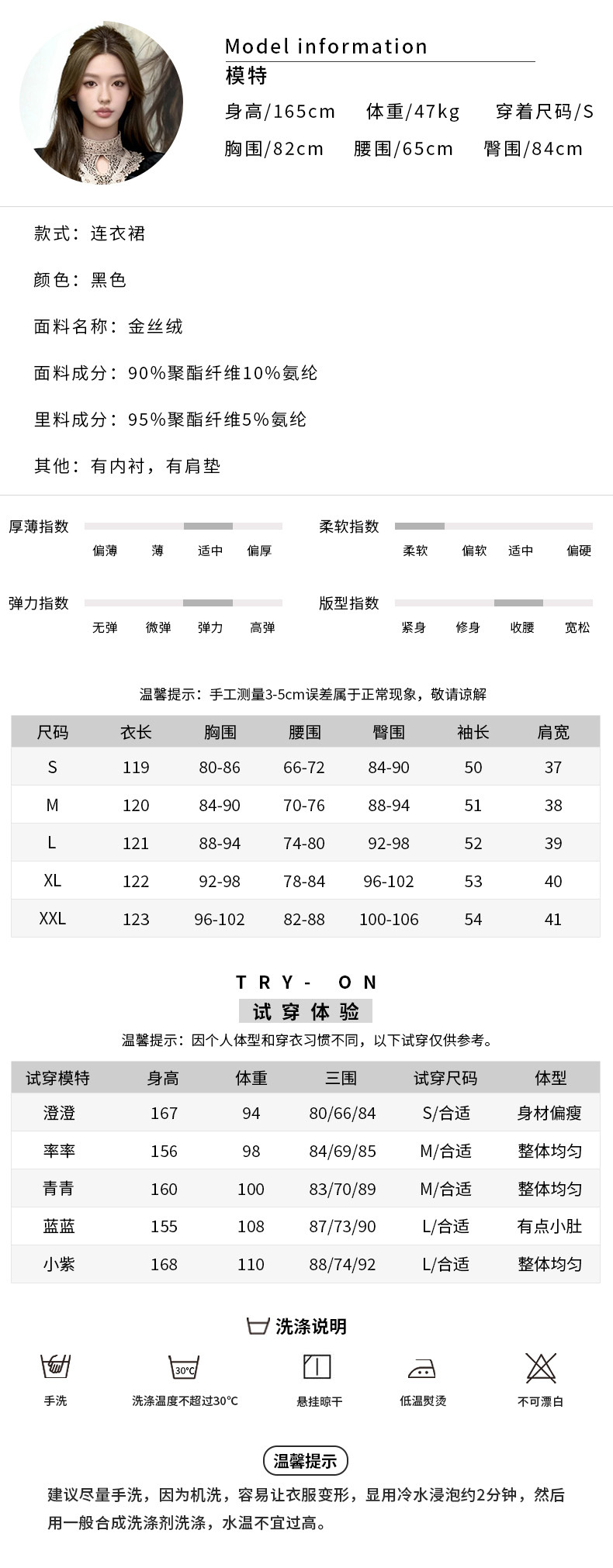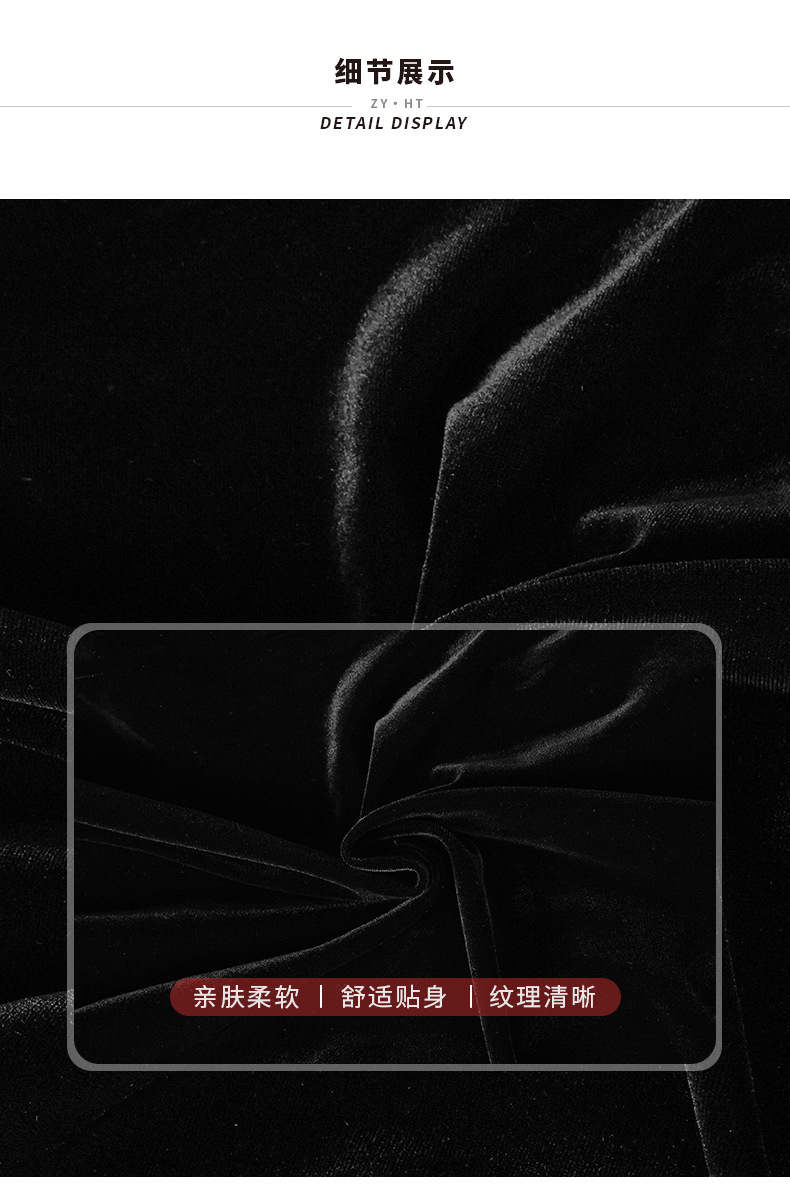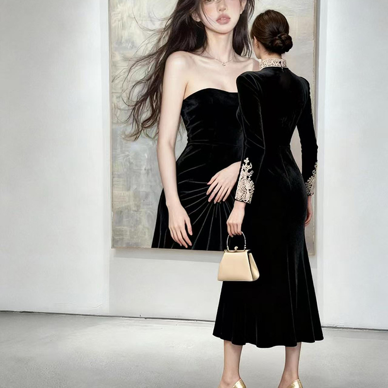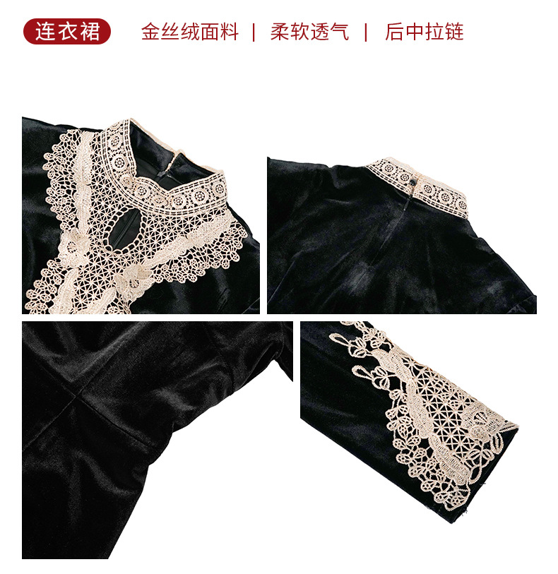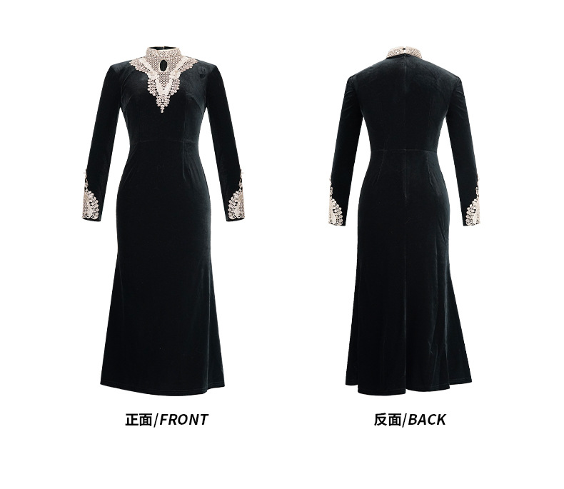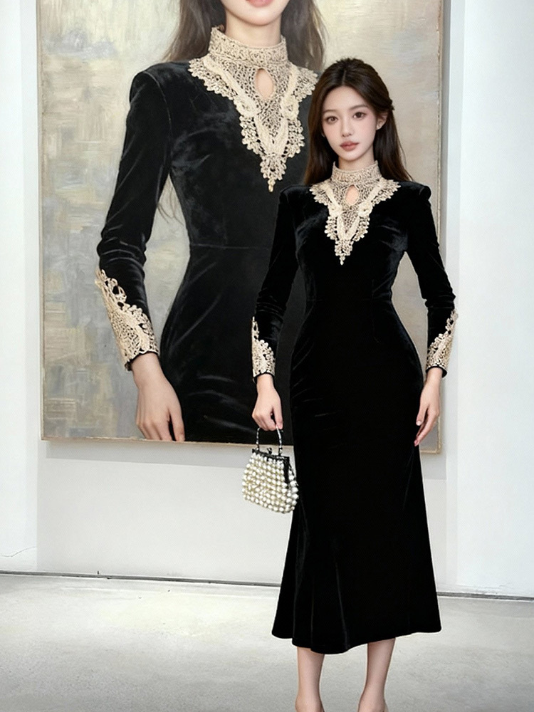 C-4595# 黑色丝绒蕾丝拼接连衣裙女秋冬立领修身鱼尾裙名媛风礼服长裙9978