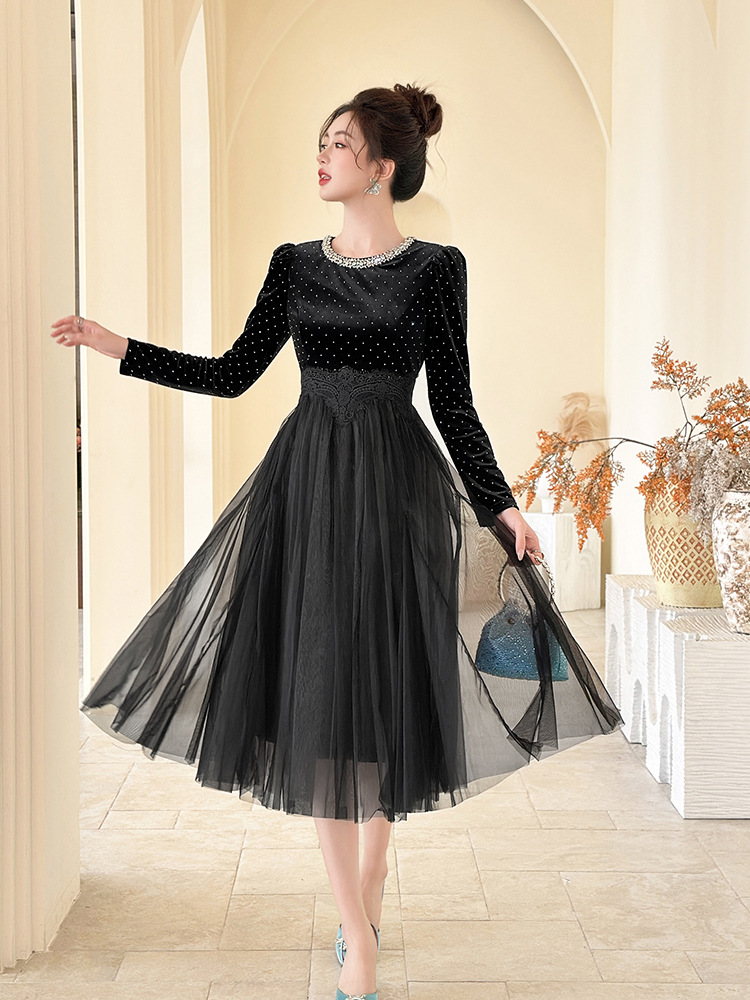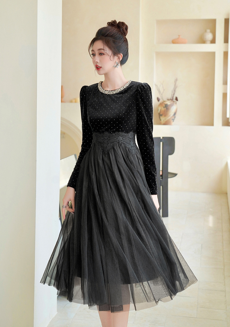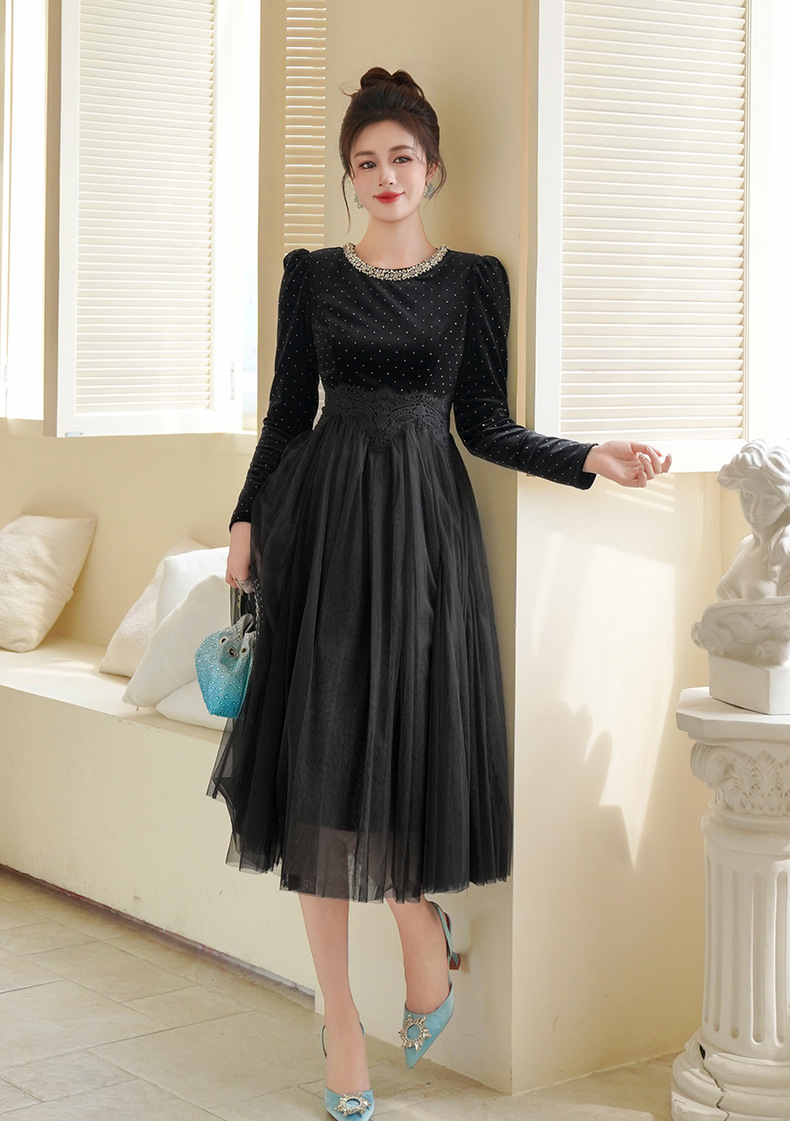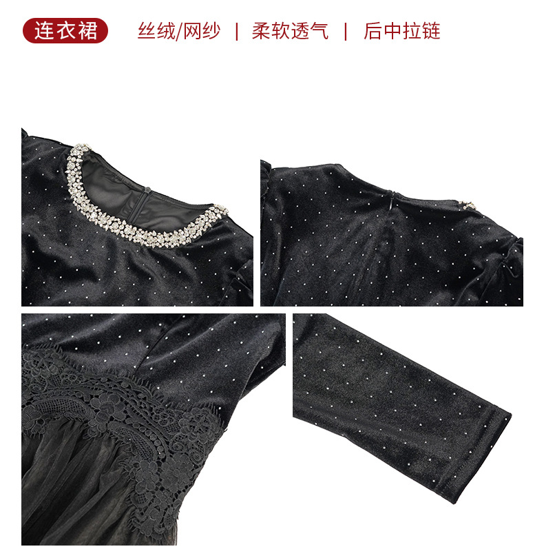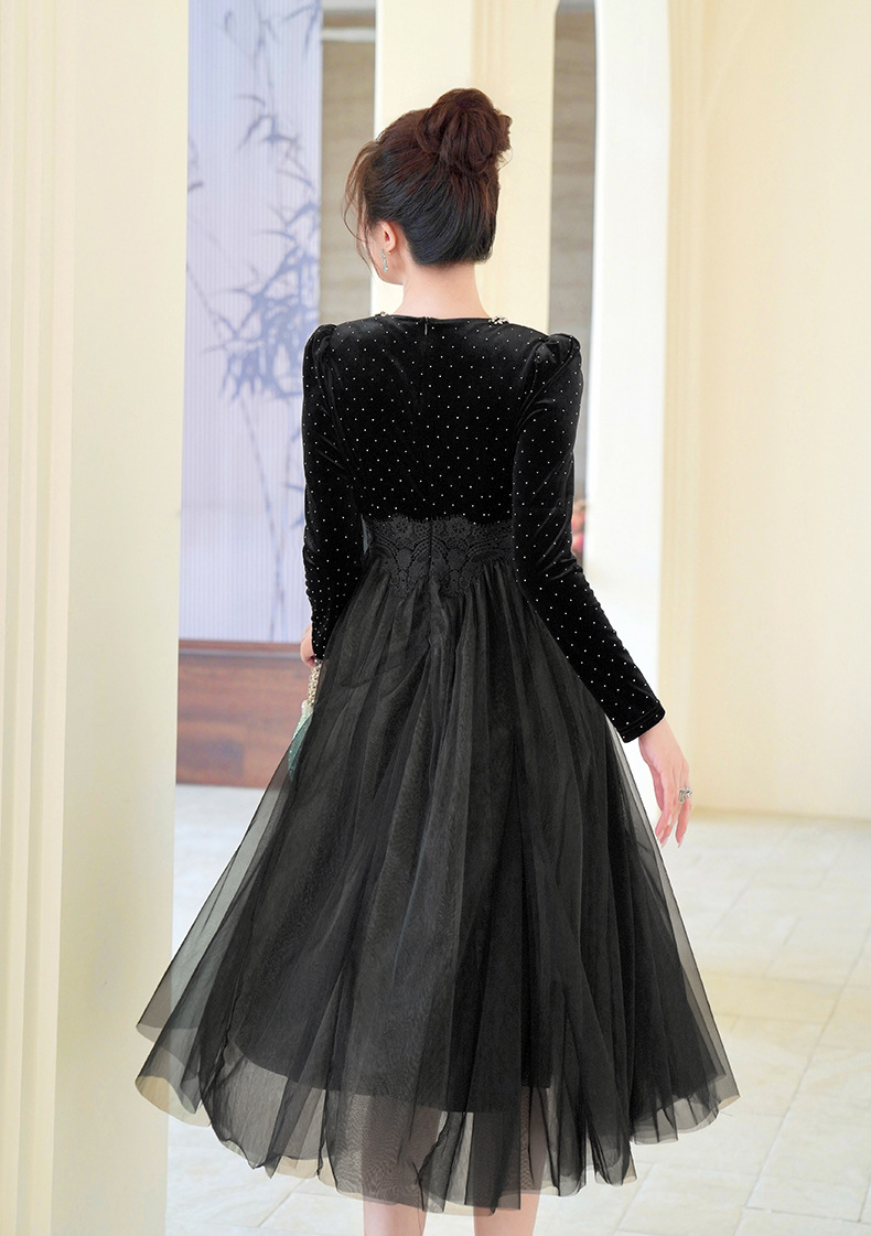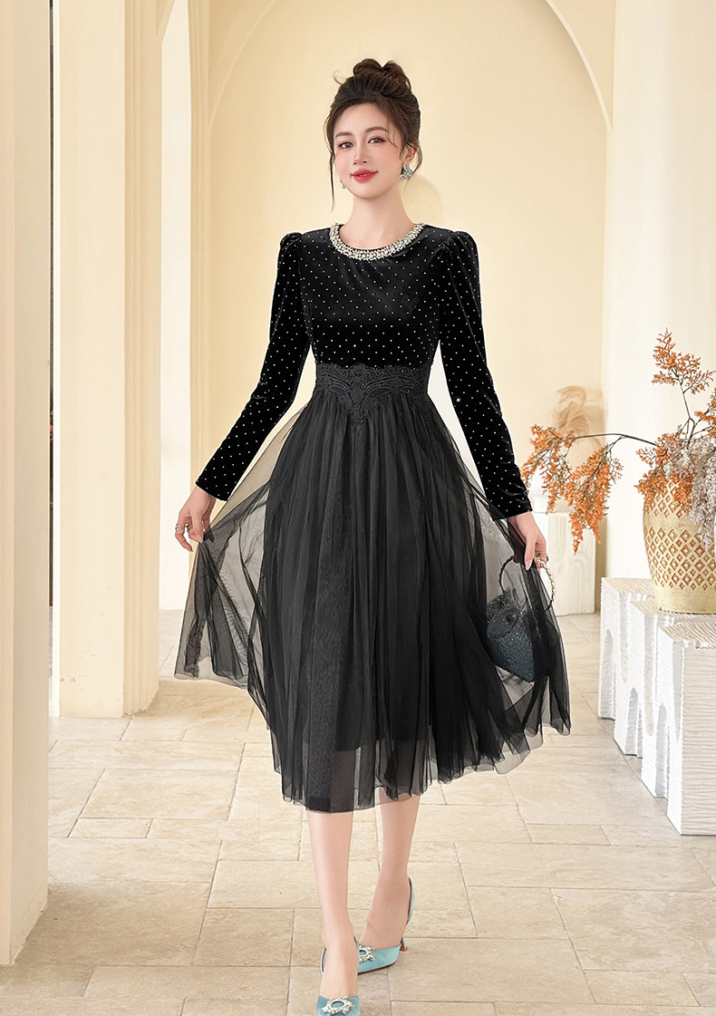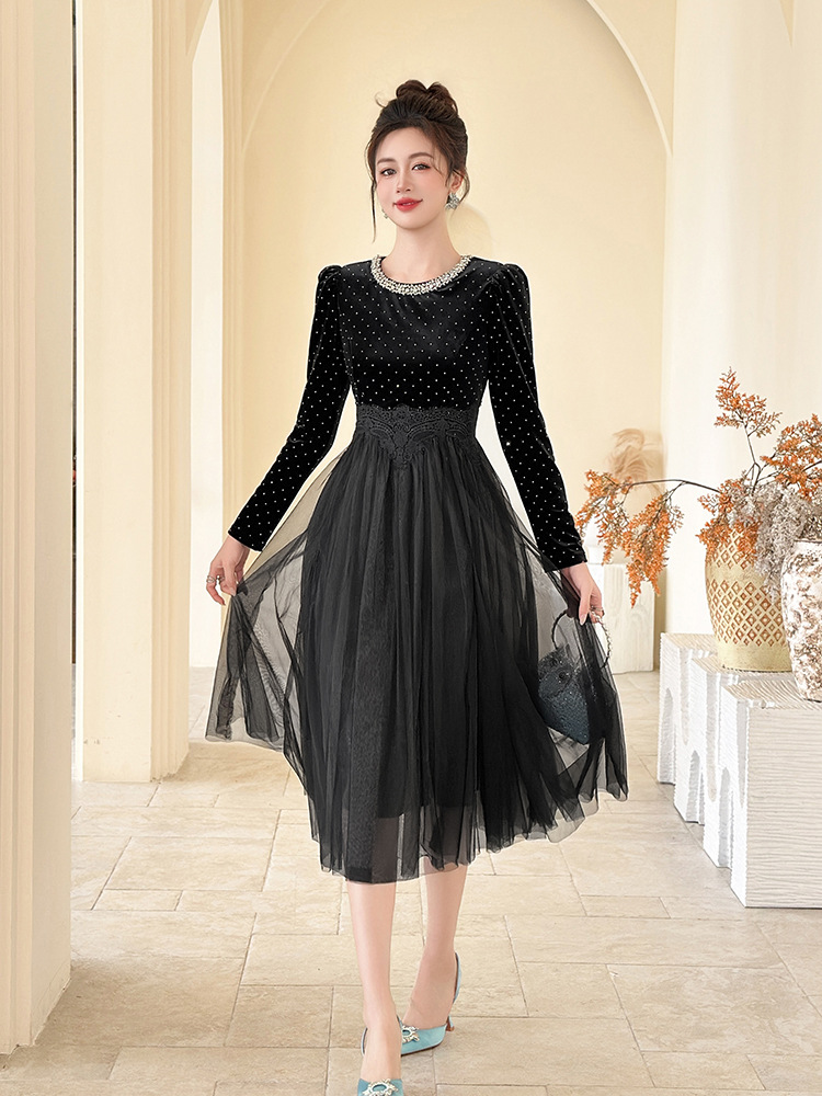 C-4599# 秋冬法式丝绒网纱拼接连衣裙女收腰显瘦镶钻名媛风晚宴长裙45388