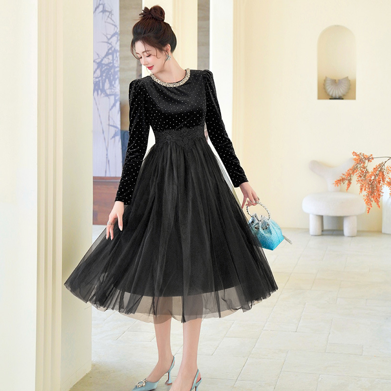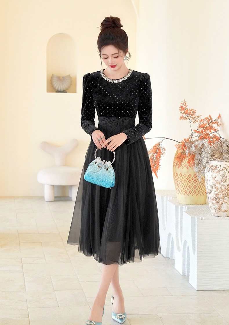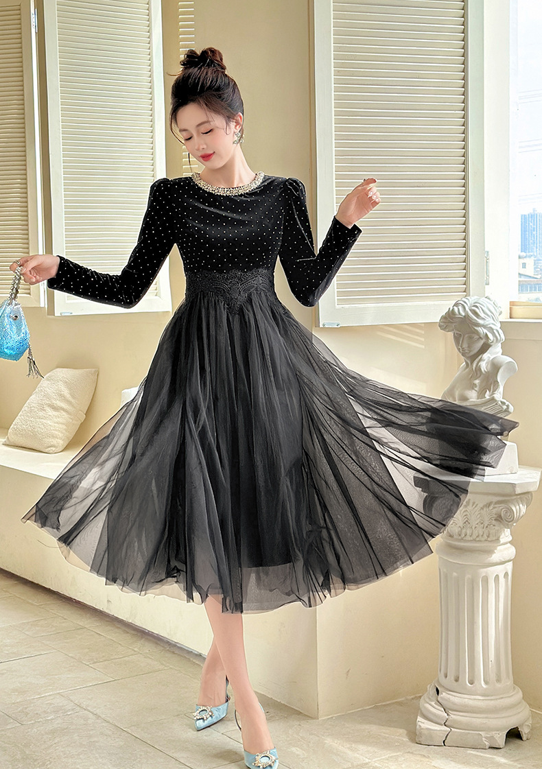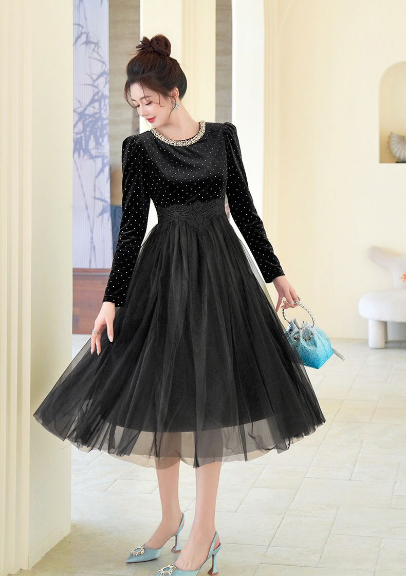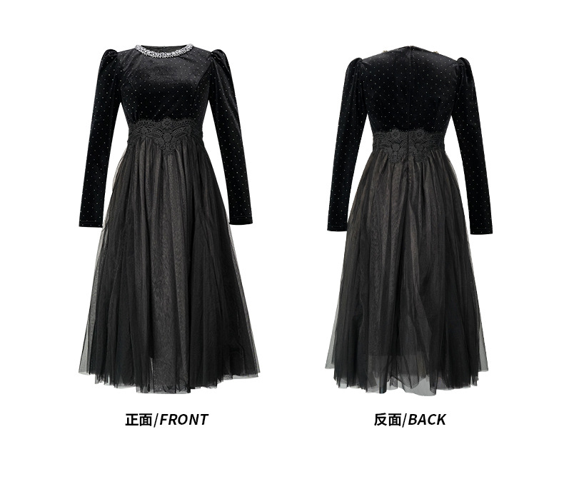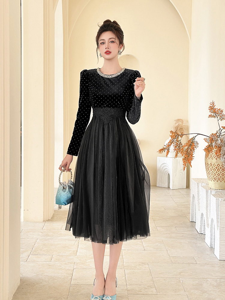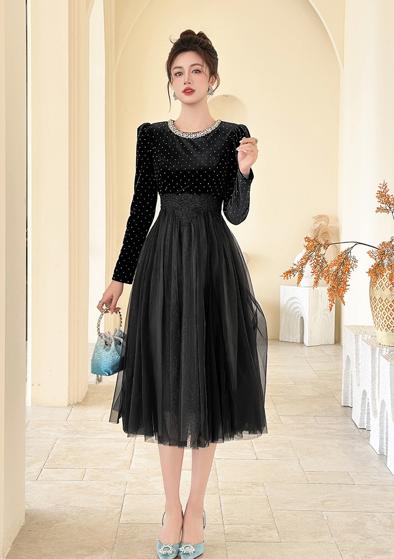 C-4599# 秋冬法式丝绒网纱拼接连衣裙女收腰显瘦镶钻名媛风晚宴长裙45388