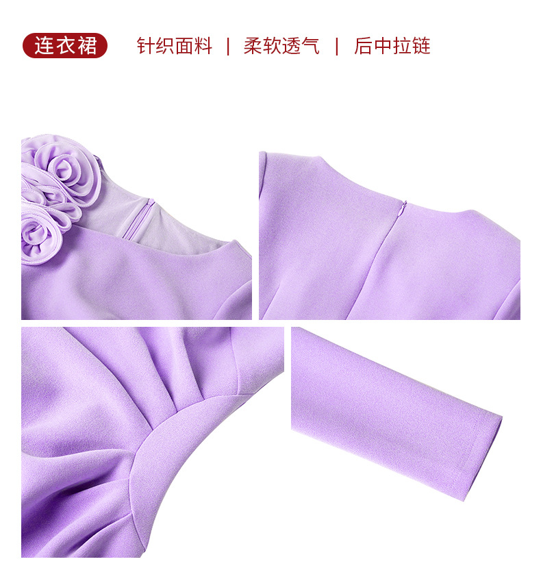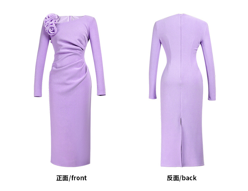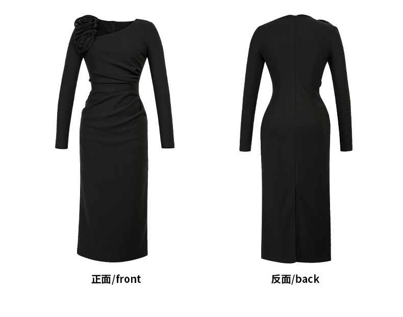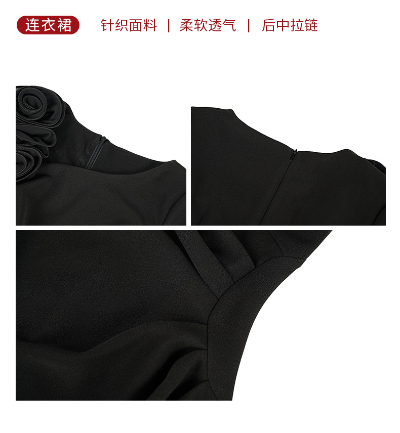 C-4600# 黑色立体花斜肩连衣裙女2025新款收腰显瘦褶皱包臀礼服长裙21935