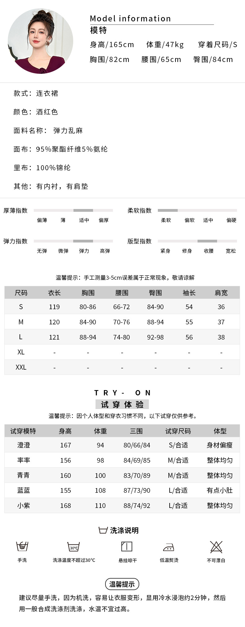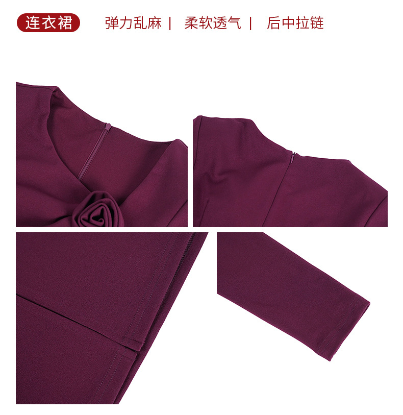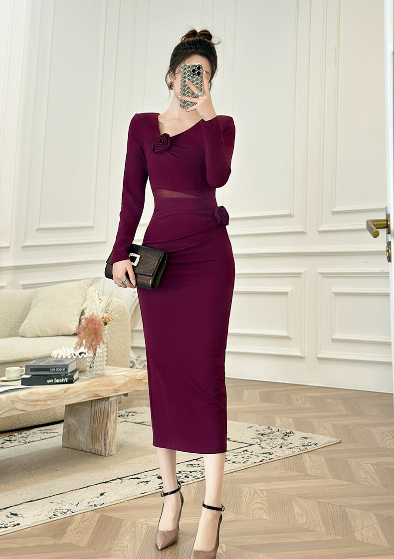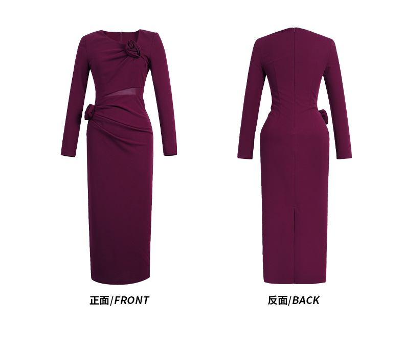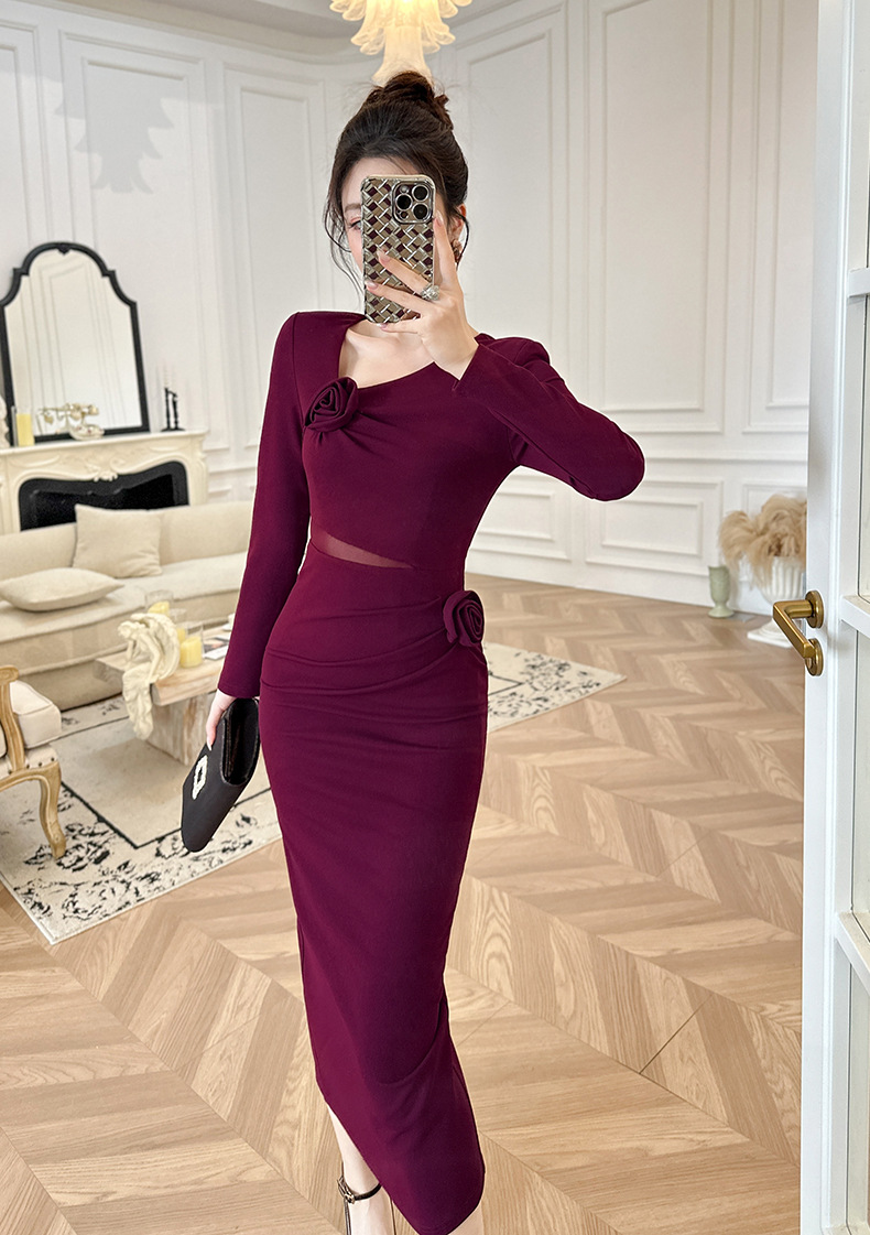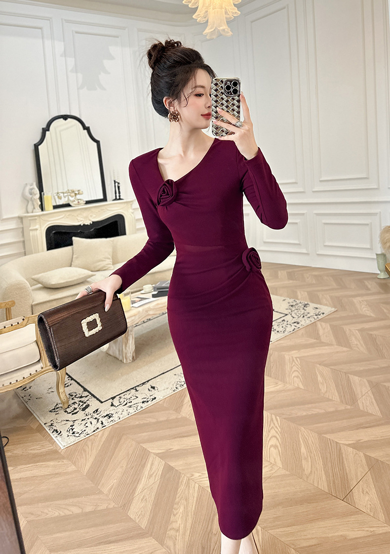 C-4603# 秋冬法式酒红色修身连衣裙女收腰显瘦立体花装饰包臀长裙61313