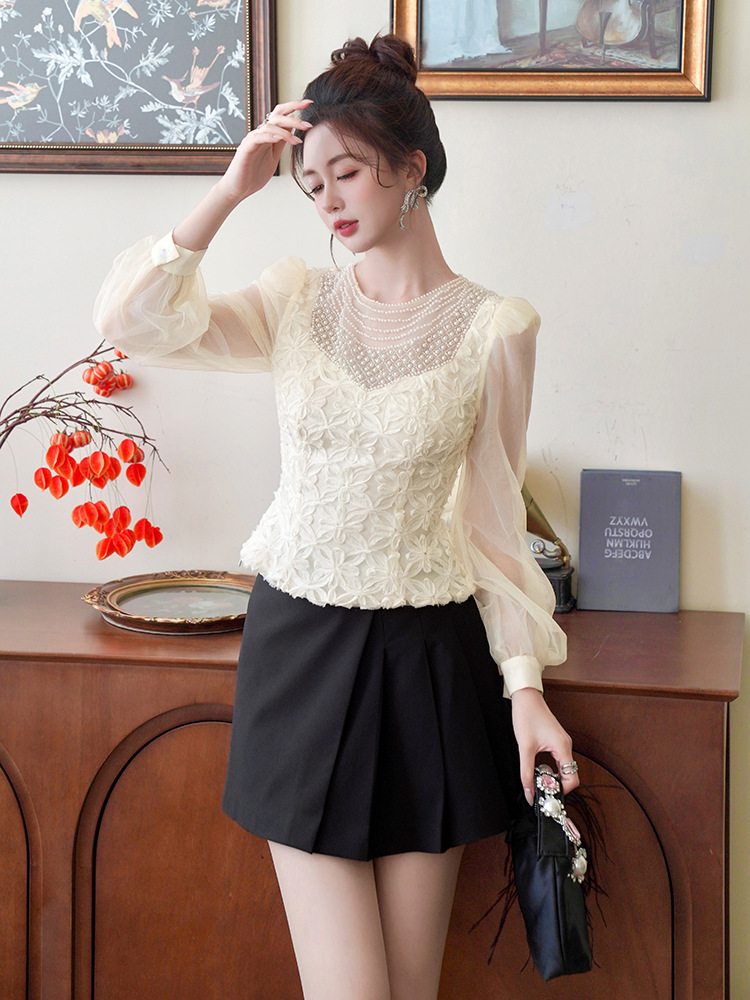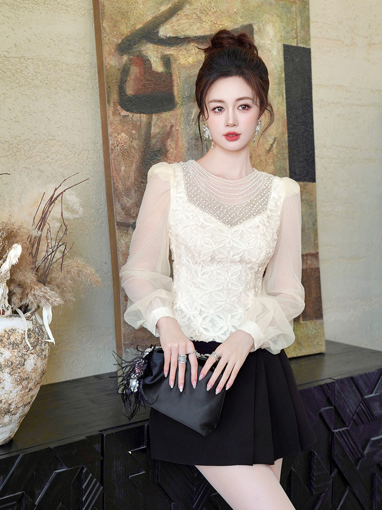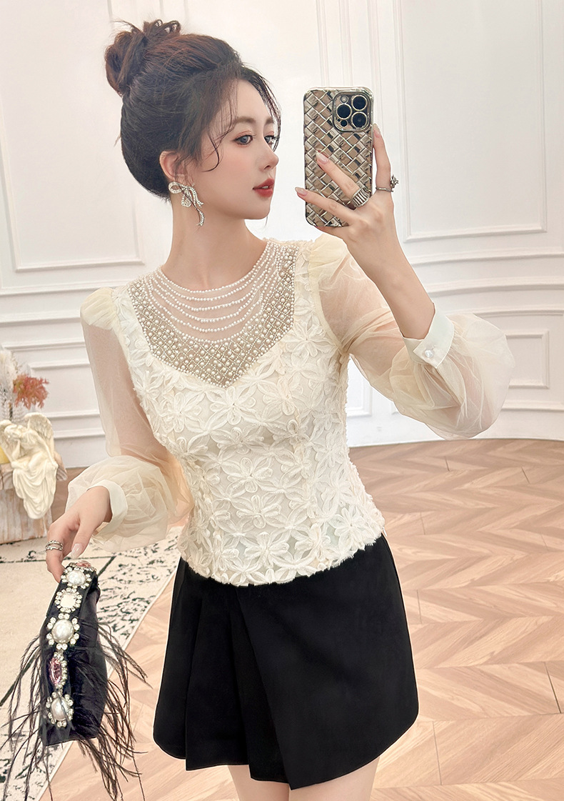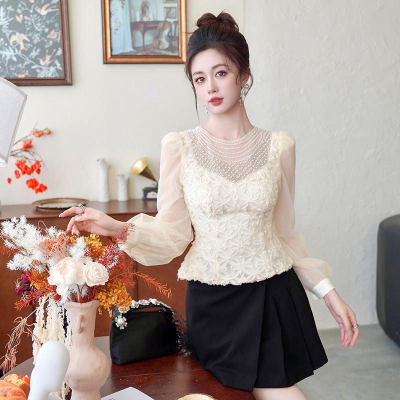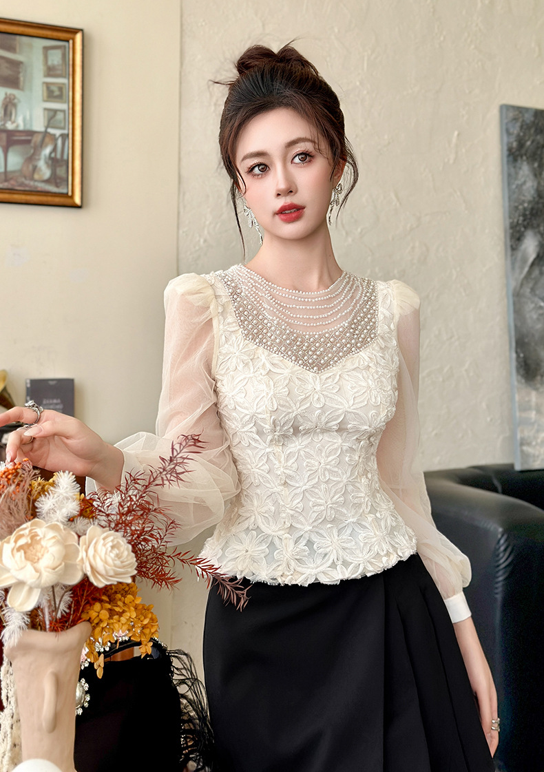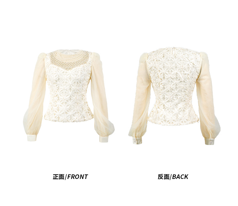 C-4604# 法式珍珠蕾丝网纱拼接上衣女新款宫廷风收腰显瘦气质衬衫11671