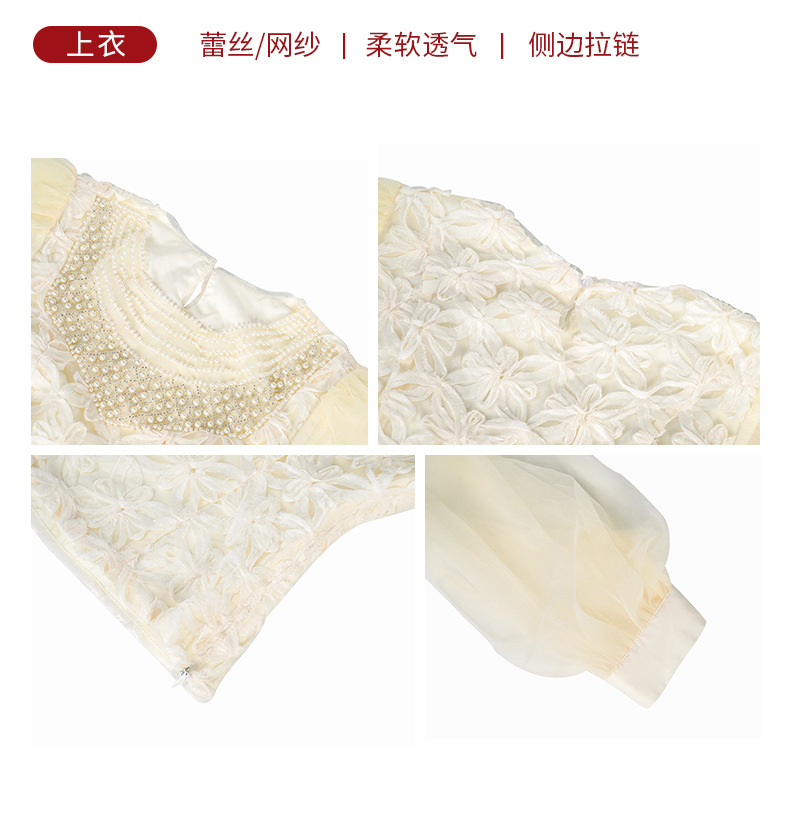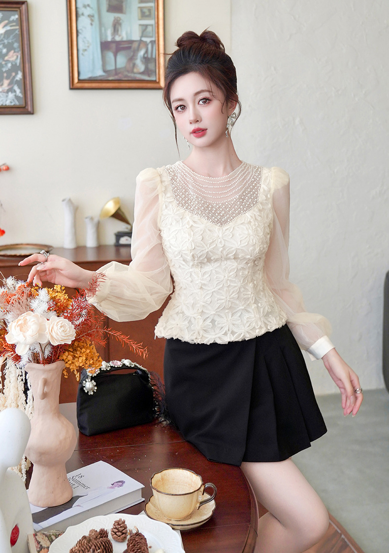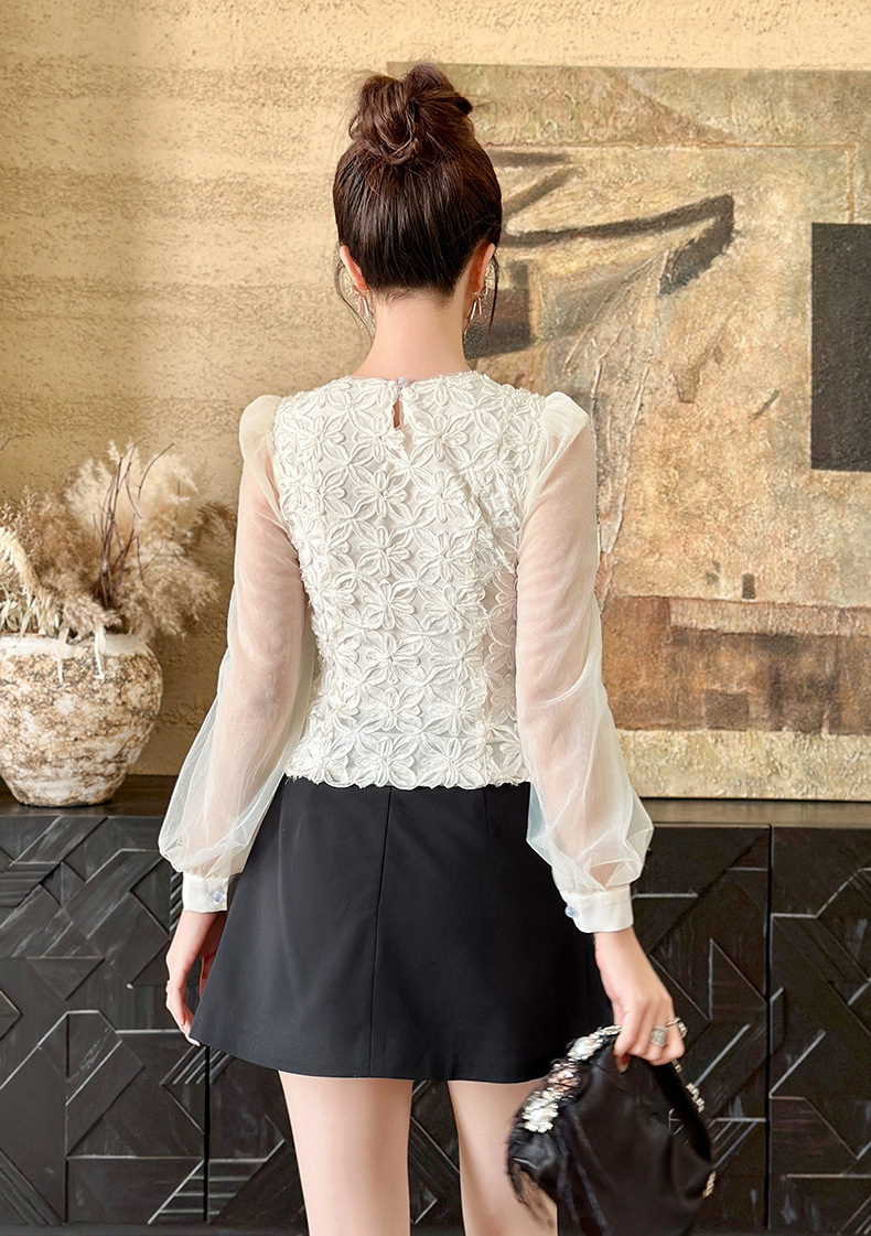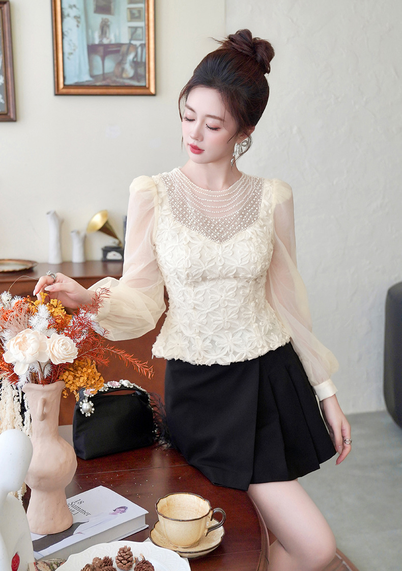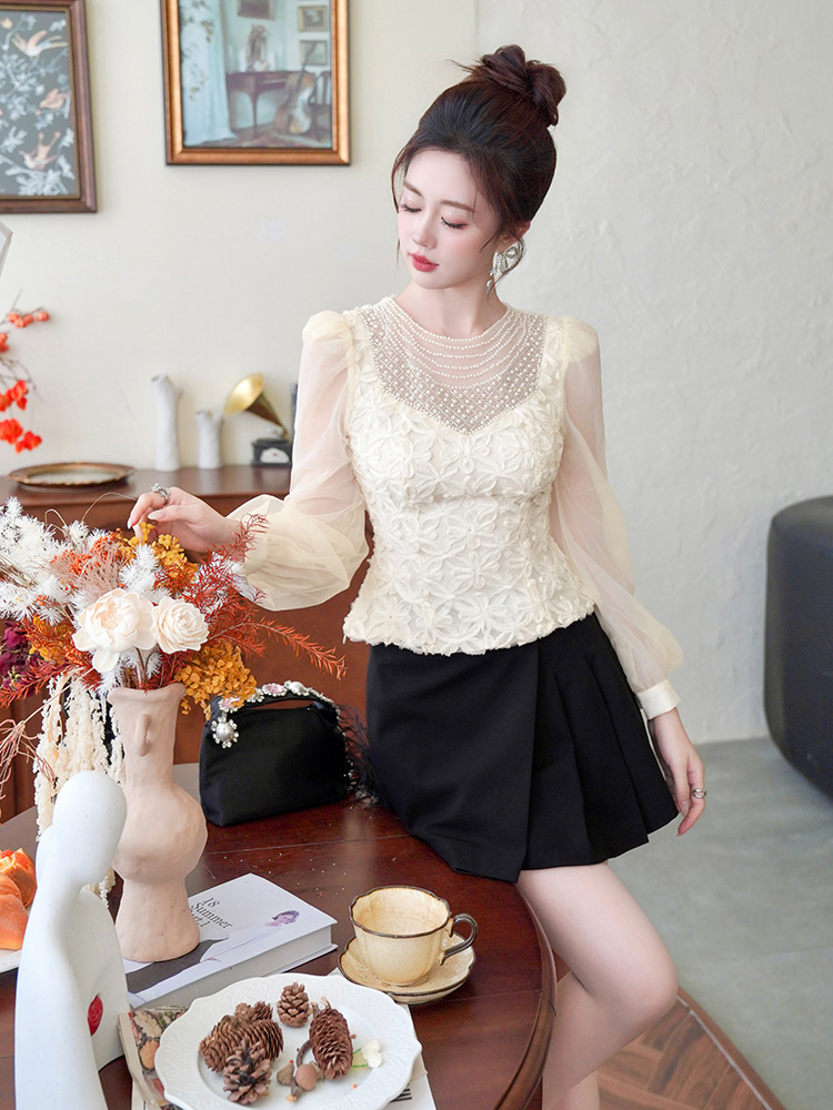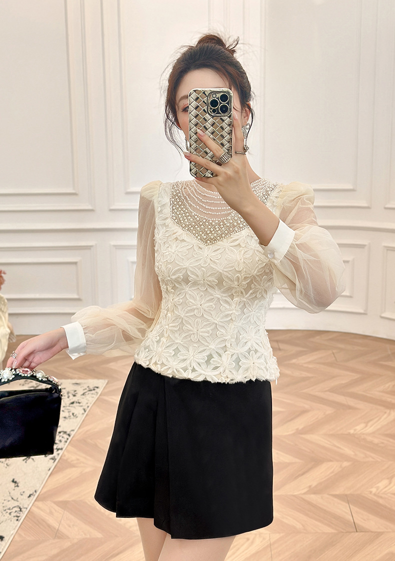 C-4604# 法式珍珠蕾丝网纱拼接上衣女新款宫廷风收腰显瘦气质衬衫11671
