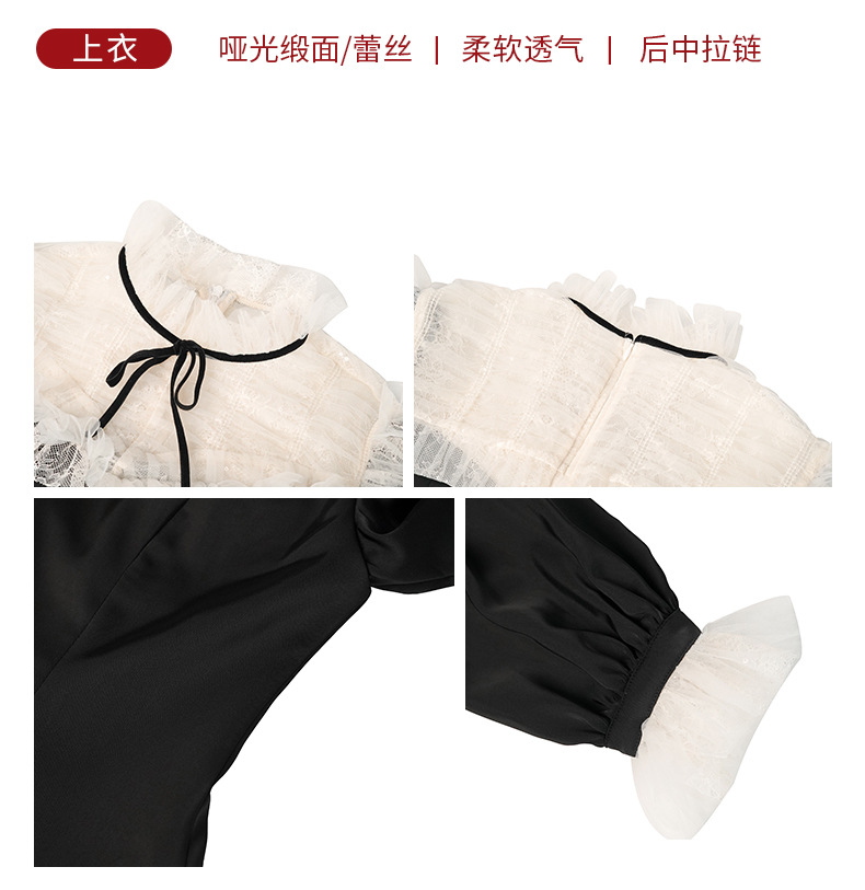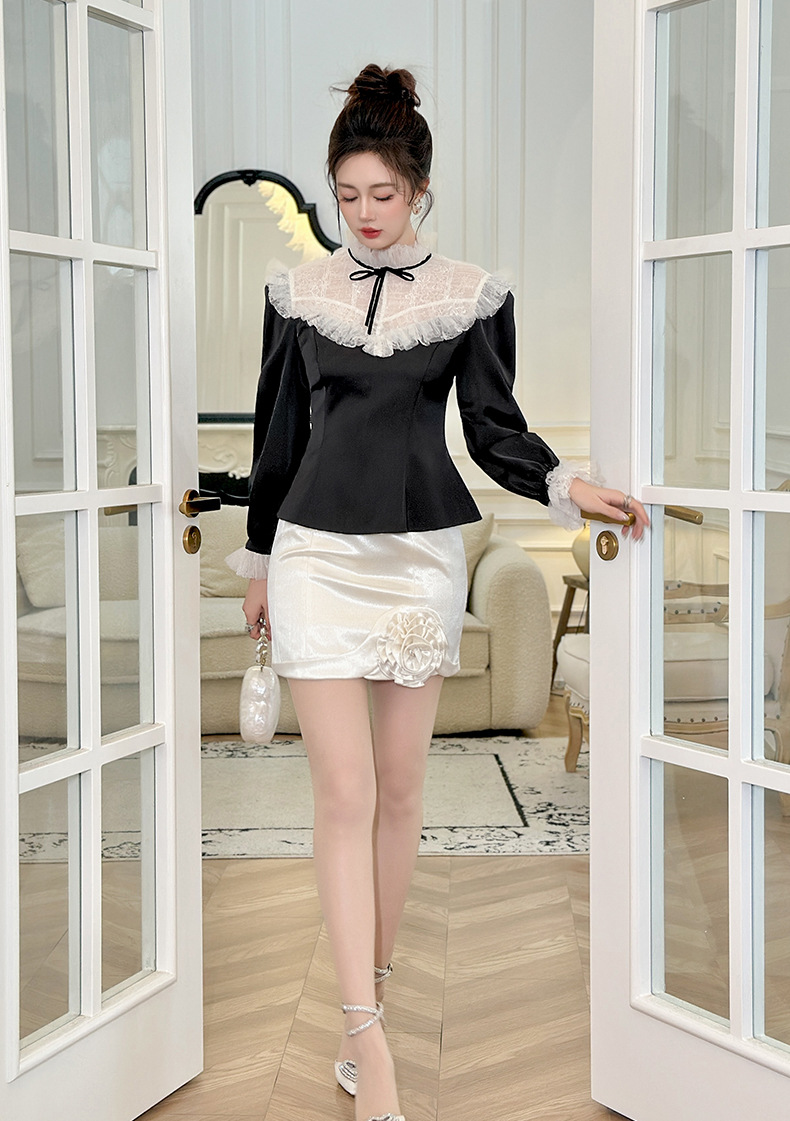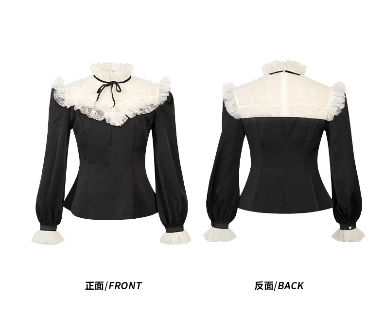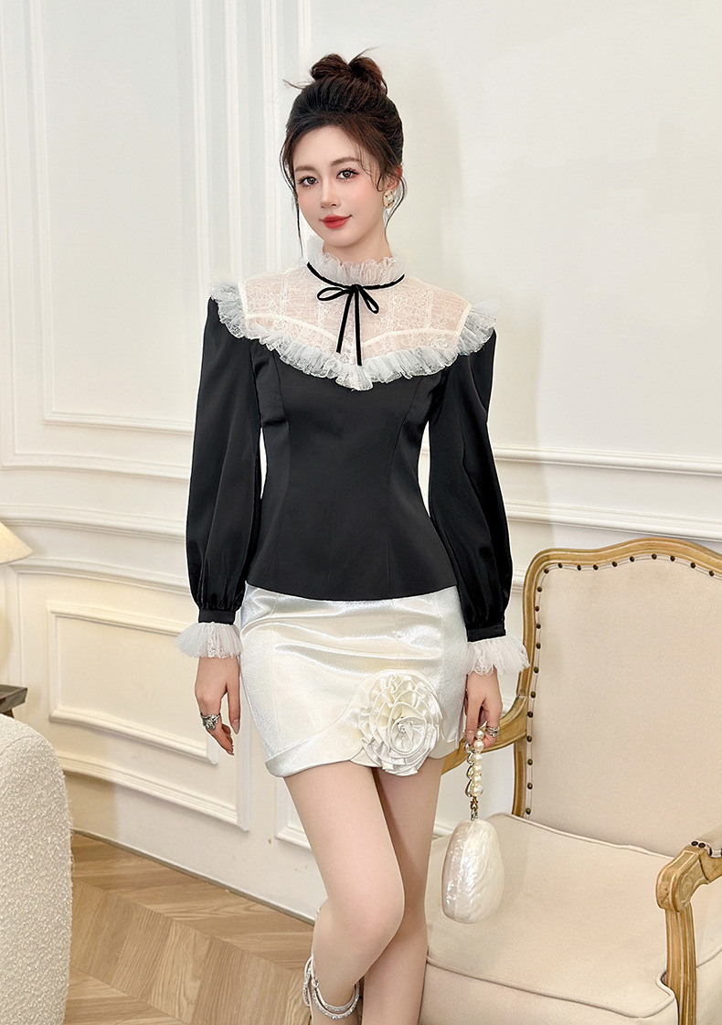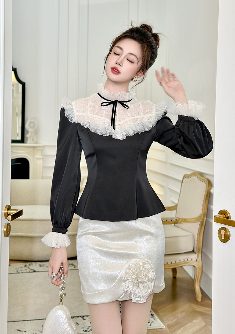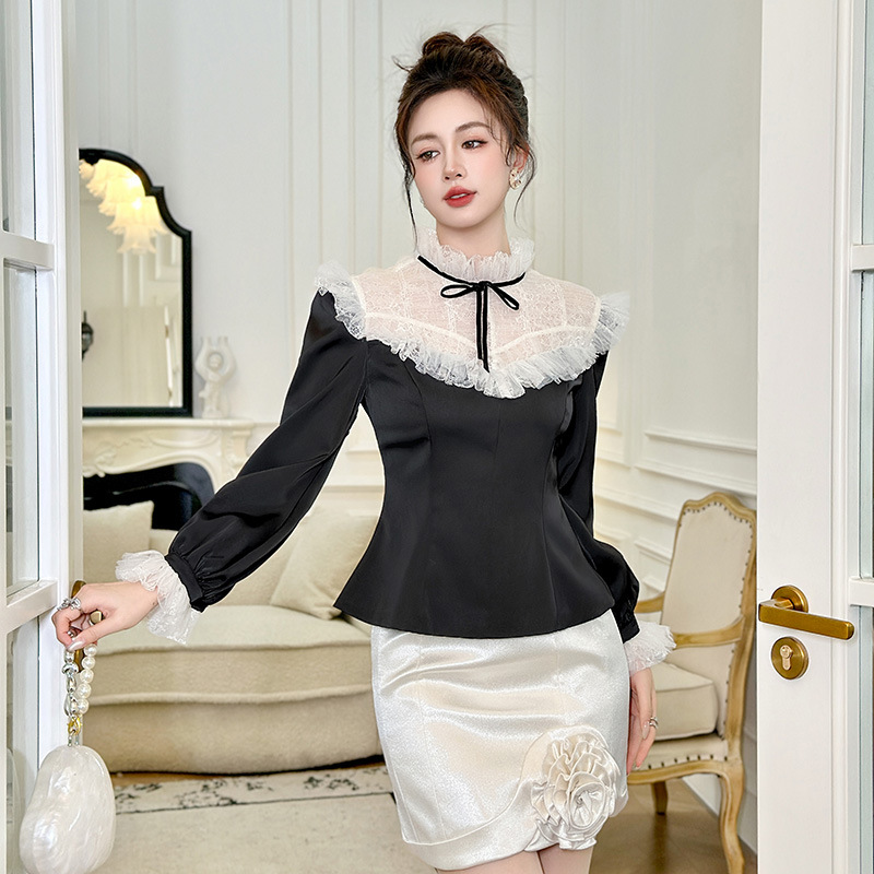 C-4606# 法式蕾丝荷叶边拼接上衣女收腰显瘦蝴蝶结名媛风宫廷风衬衫56015