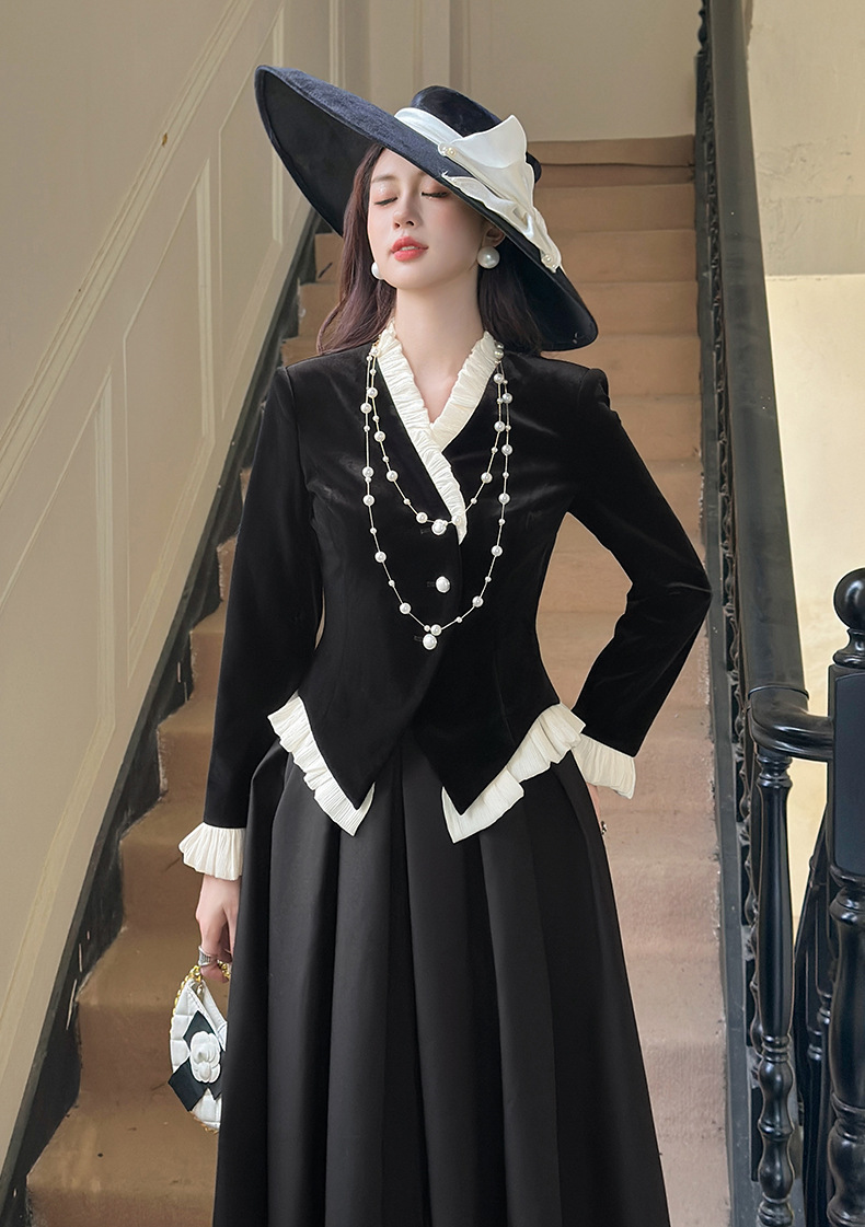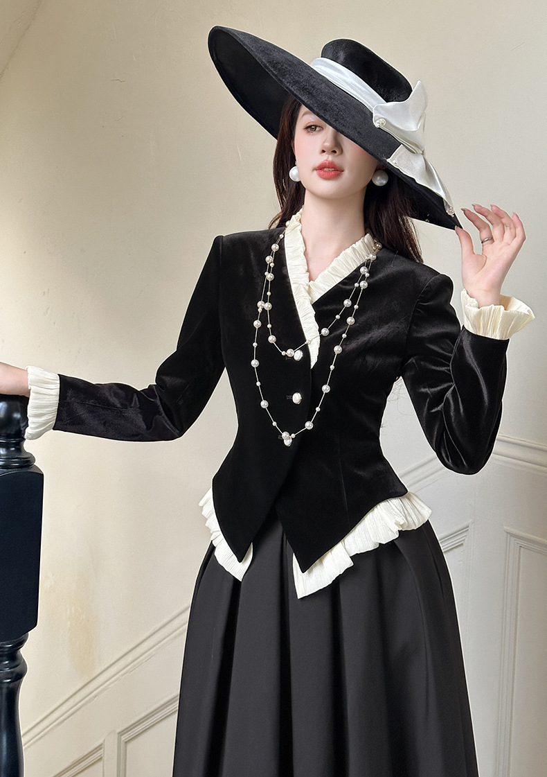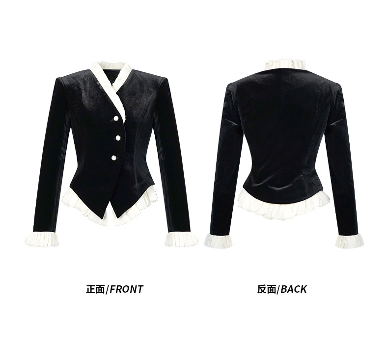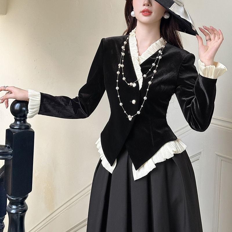 C-4612# 秋冬法式丝绒上衣女收腰显瘦撞色拼接名媛风复古修身外套35239