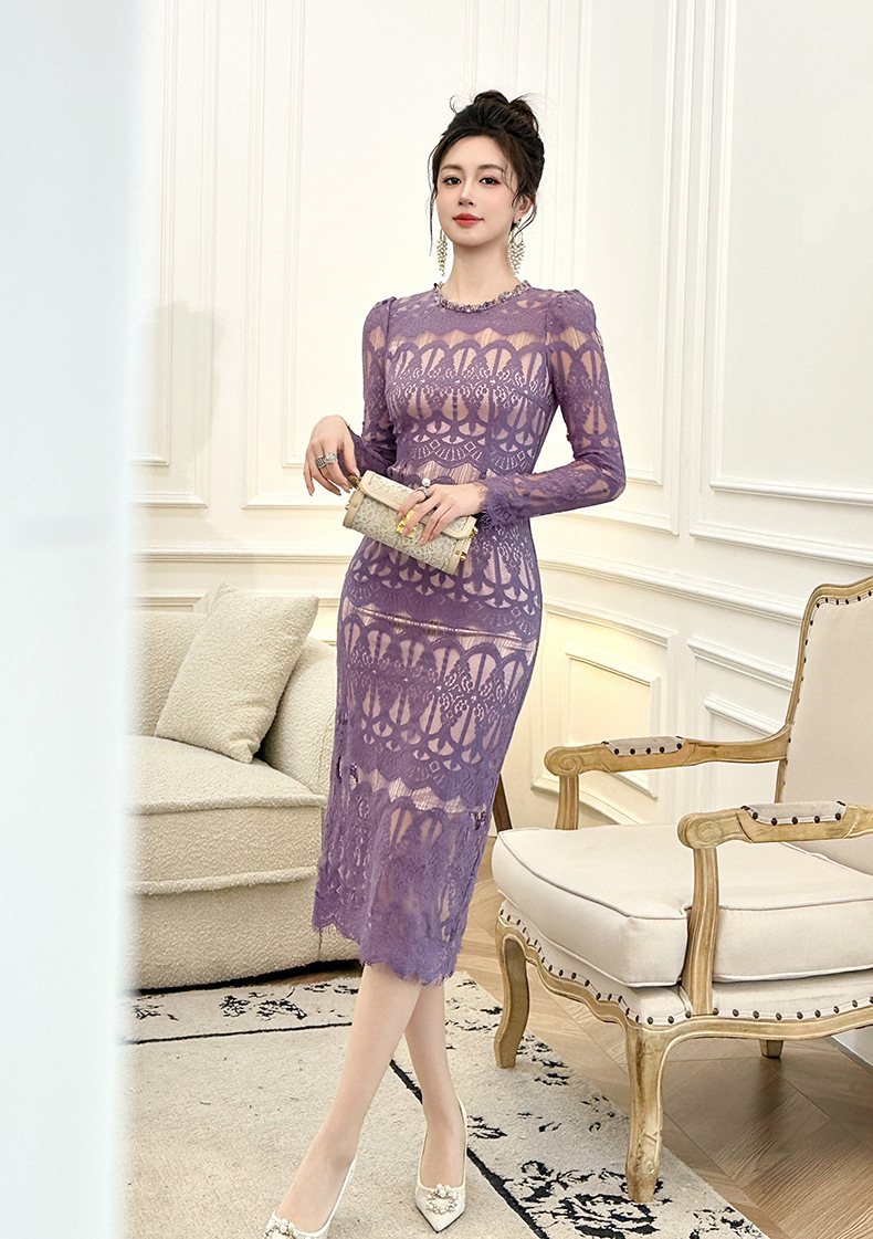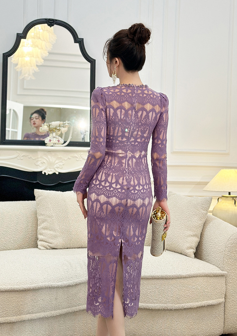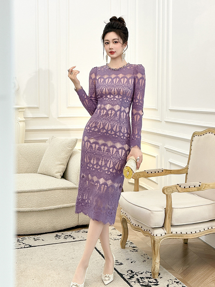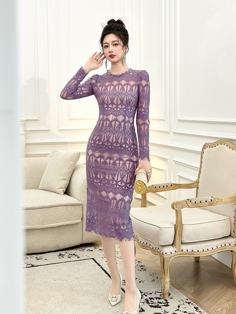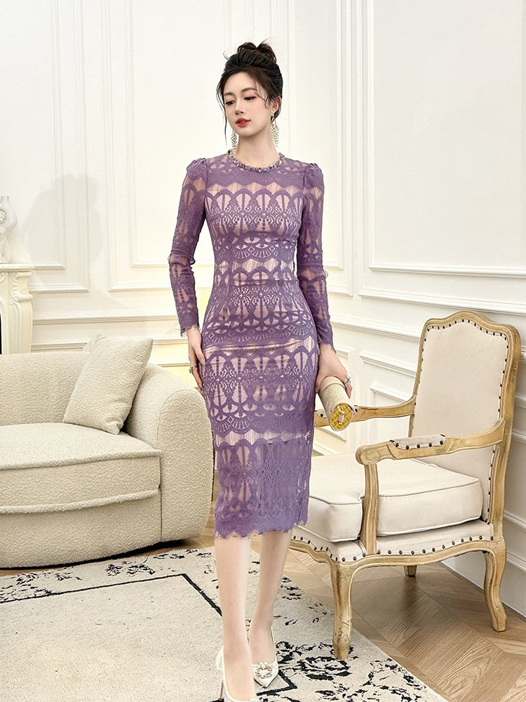 C-4614# 新款法式圆领蕾丝连衣裙女收腰显瘦名媛风紫色镂空包臀长裙21909