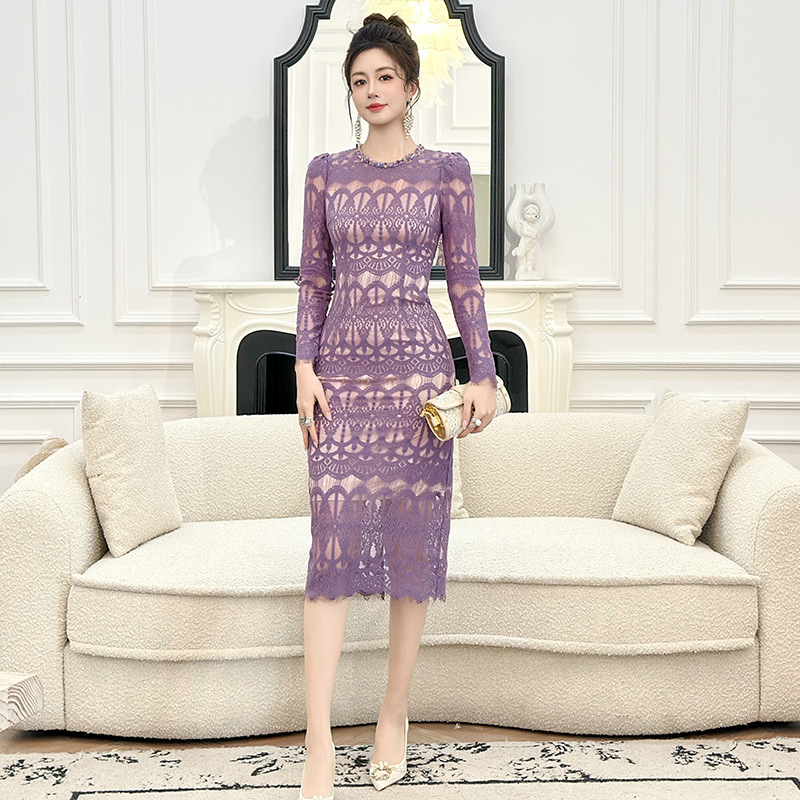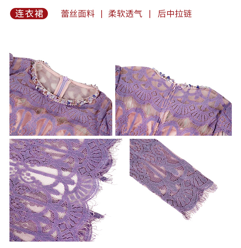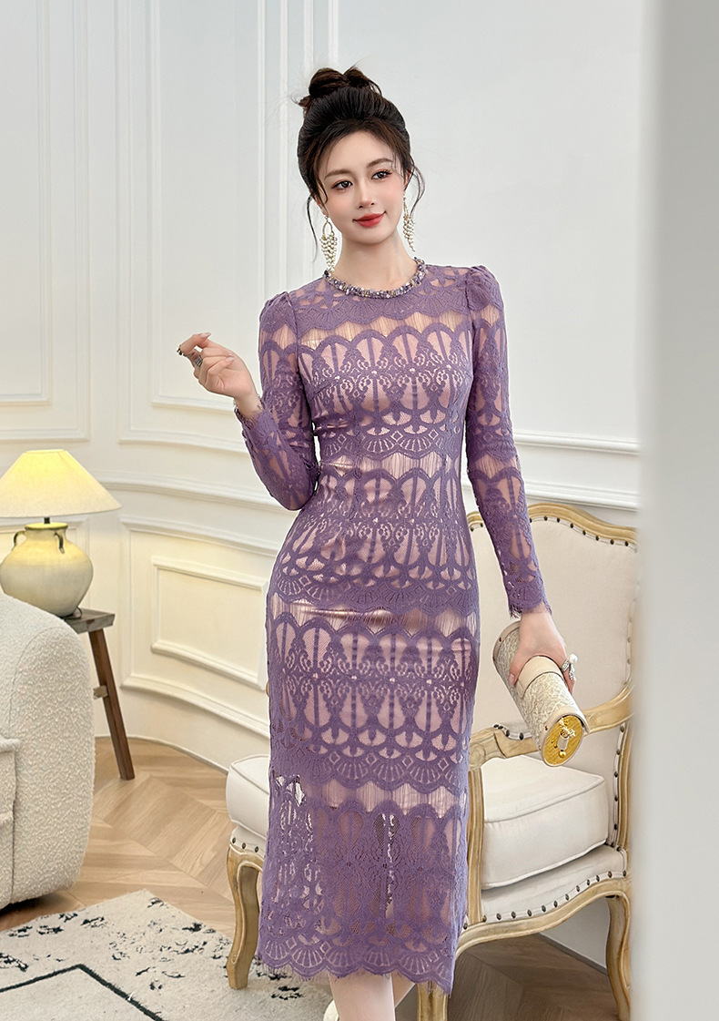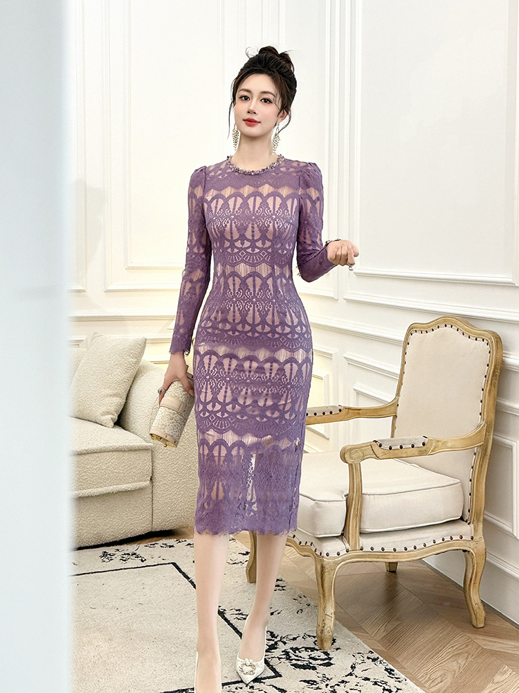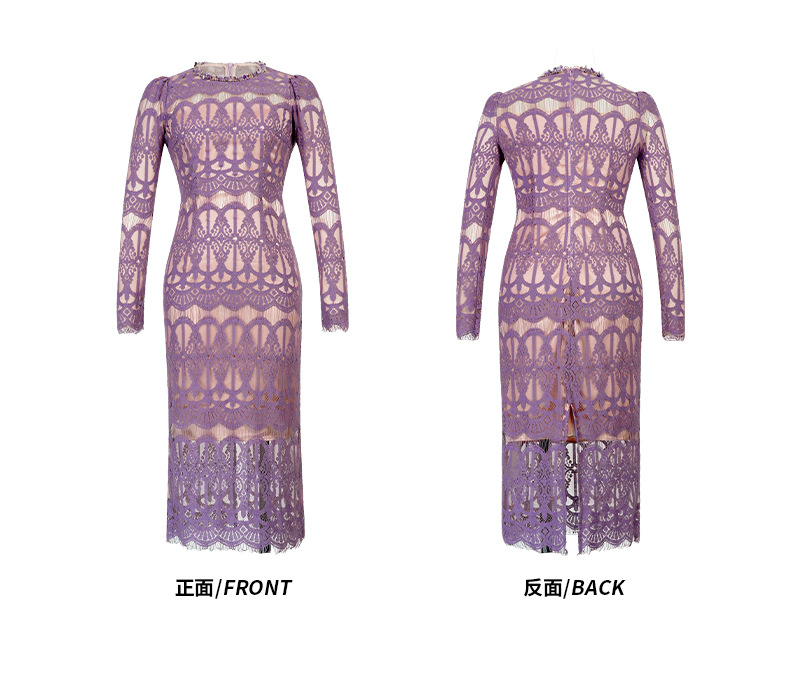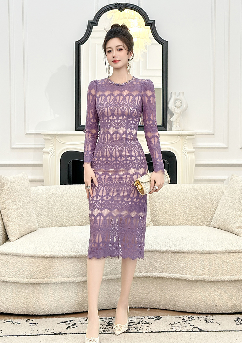C-4614# 新款法式圆领蕾丝连衣裙女收腰显瘦名媛风紫色镂空包臀长裙21909