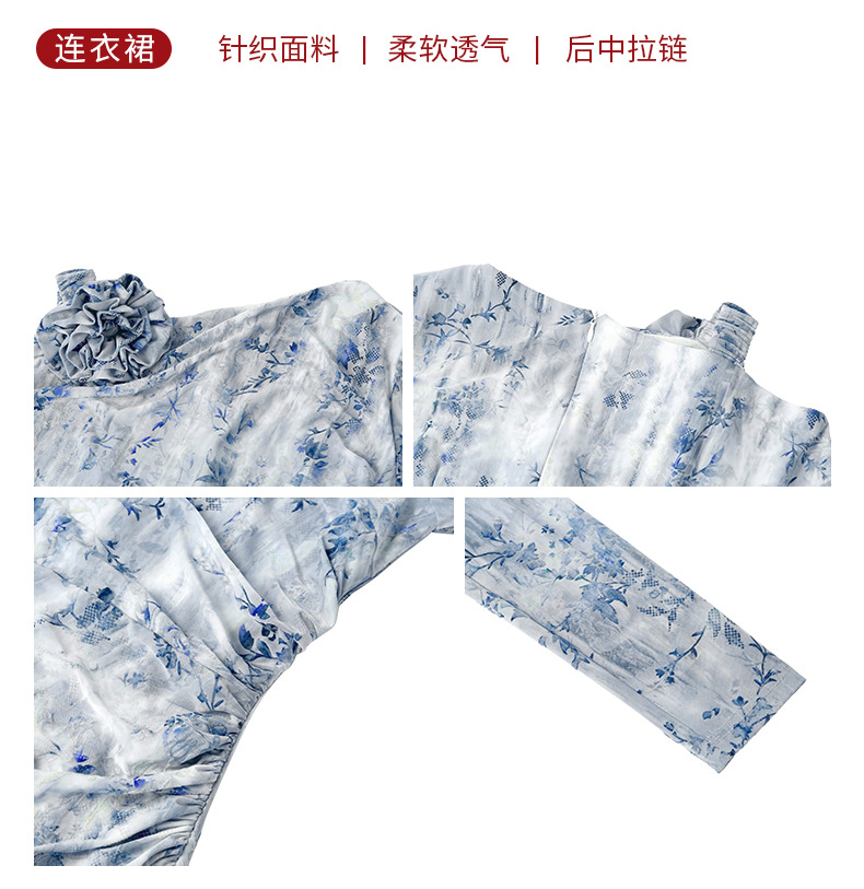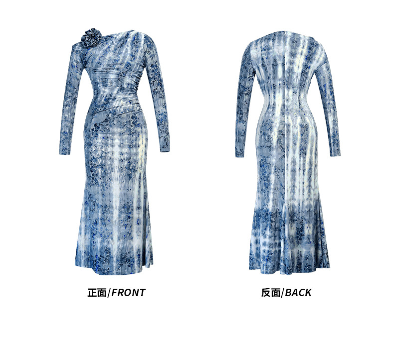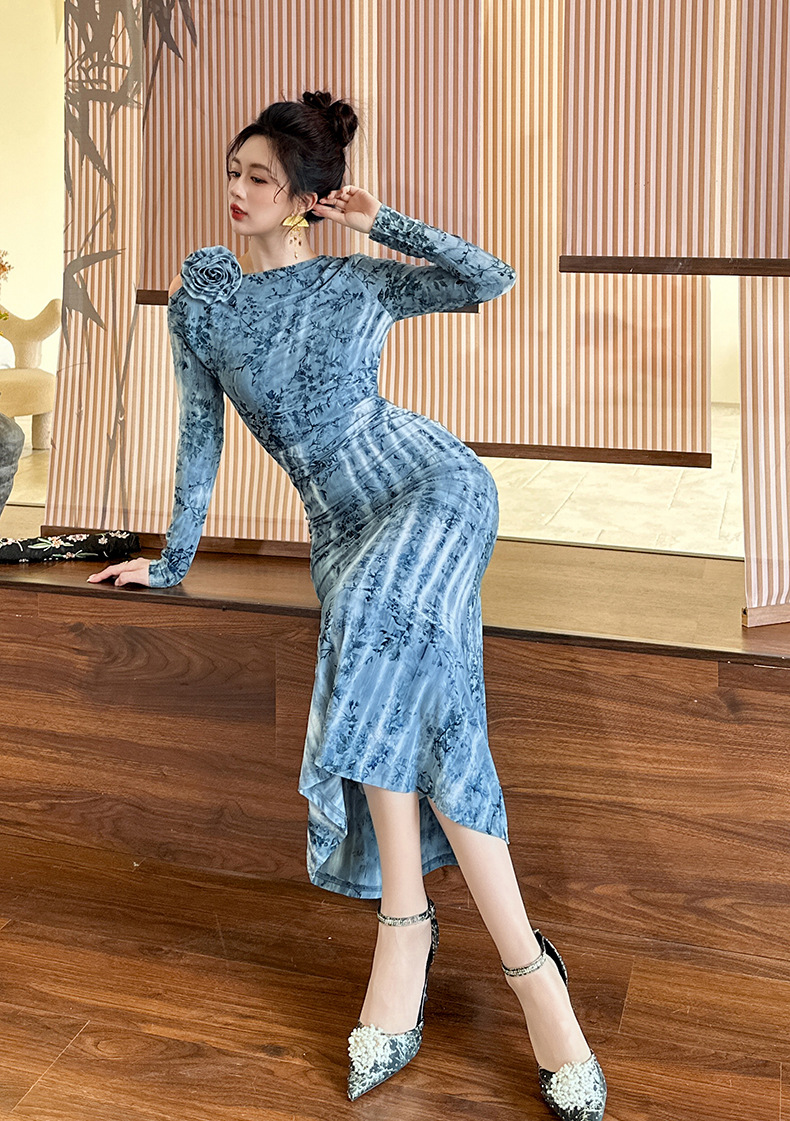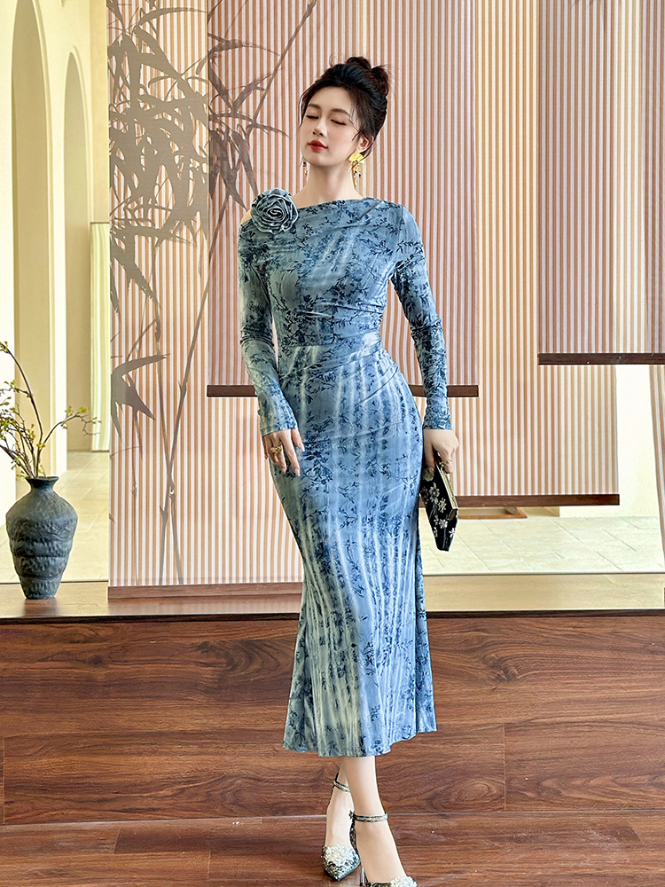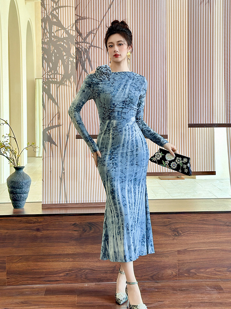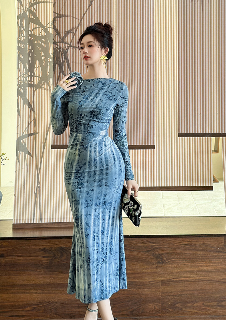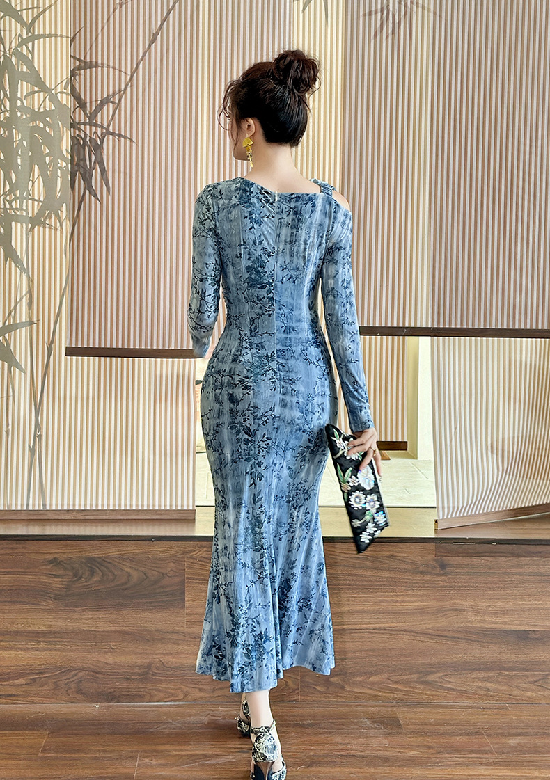 C-4616# 秋冬新款法式一字肩印花连衣裙女收腰显瘦鱼尾裙名媛风长裙21894