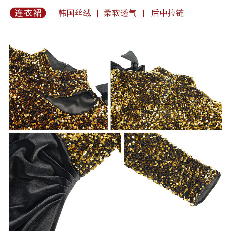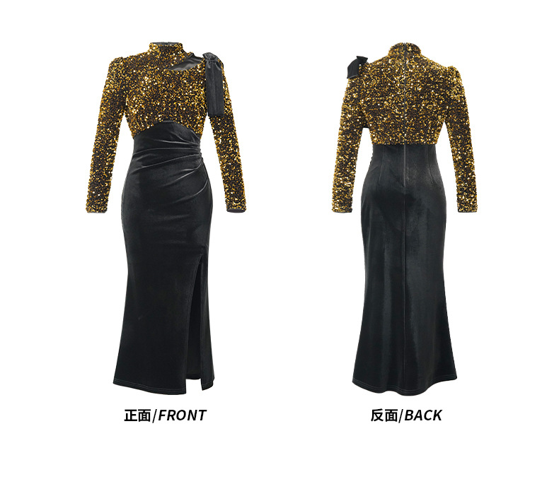 C-4619# 秋冬法式亮片丝绒连衣裙女收腰显瘦开叉包臀长裙晚宴礼服裙51523