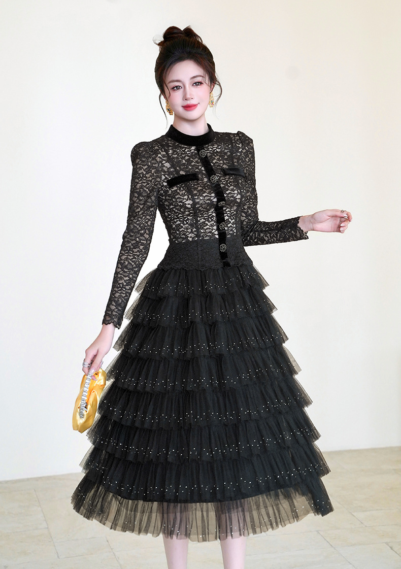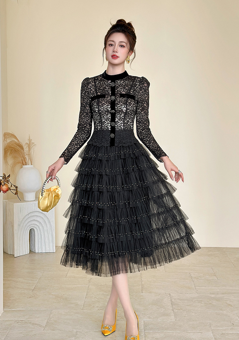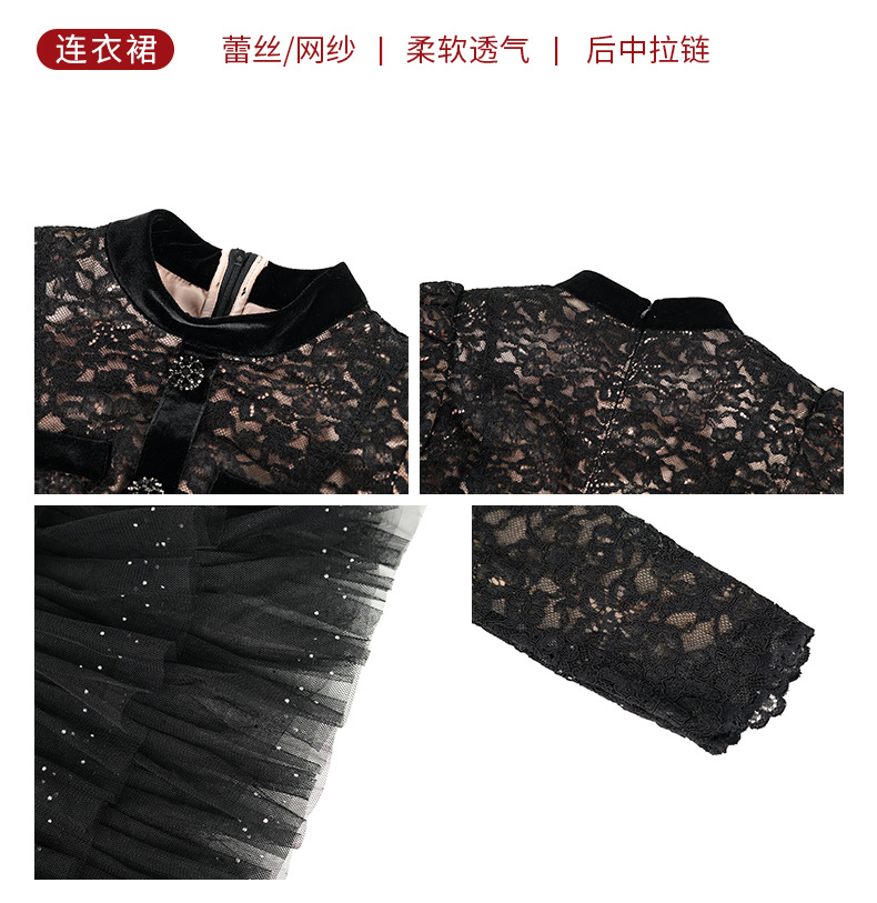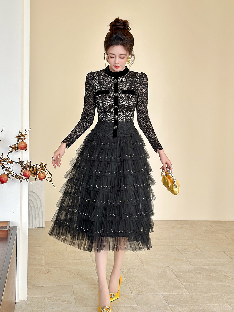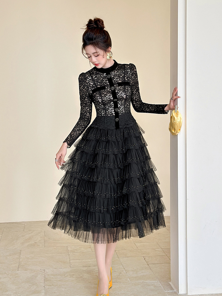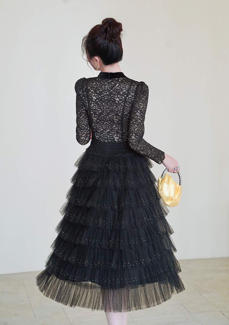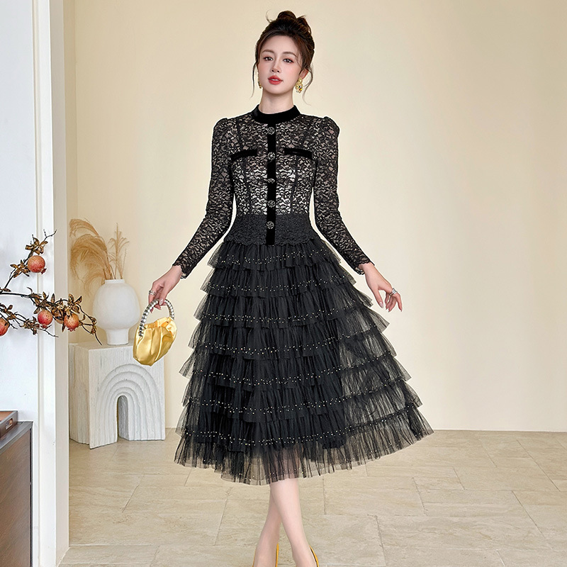 C-4620# 秋冬法式蕾丝网纱拼接连衣裙女收腰显瘦蛋糕裙名媛风晚宴裙45350