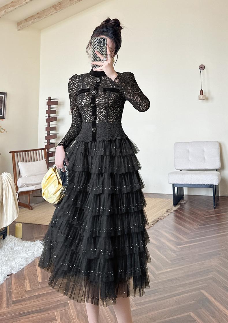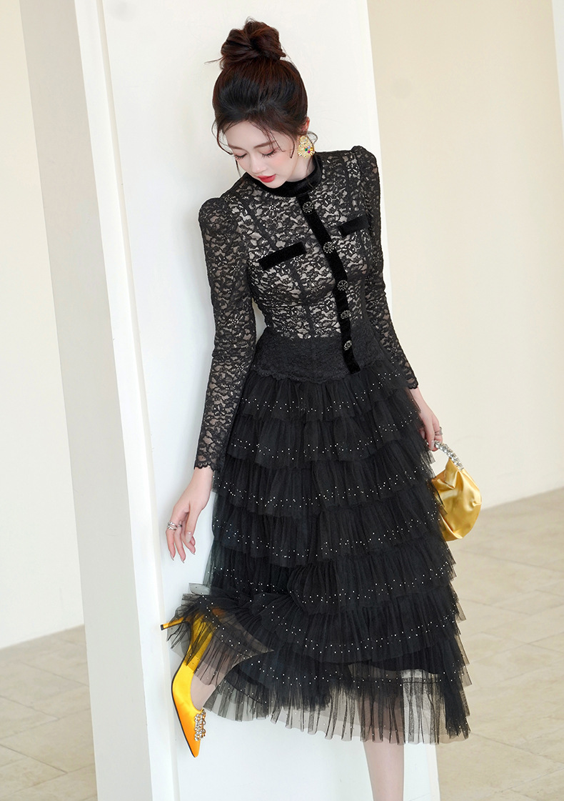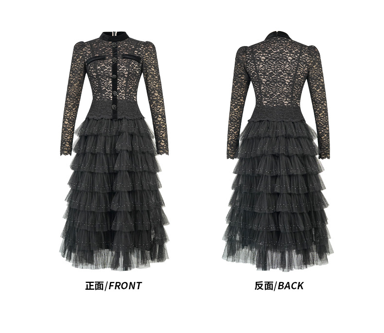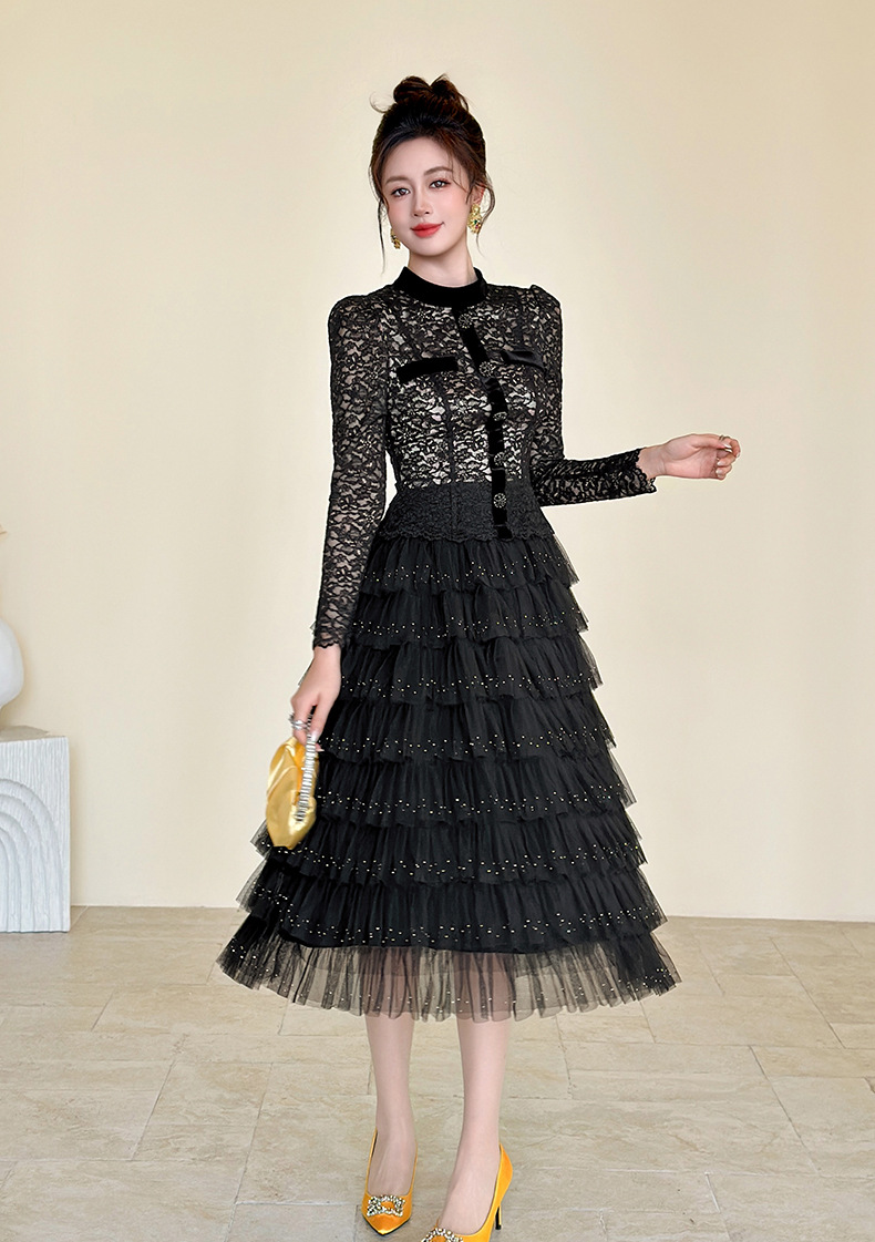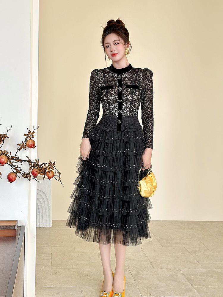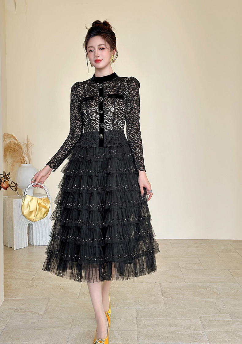 C-4620# 秋冬法式蕾丝网纱拼接连衣裙女收腰显瘦蛋糕裙名媛风晚宴裙45350