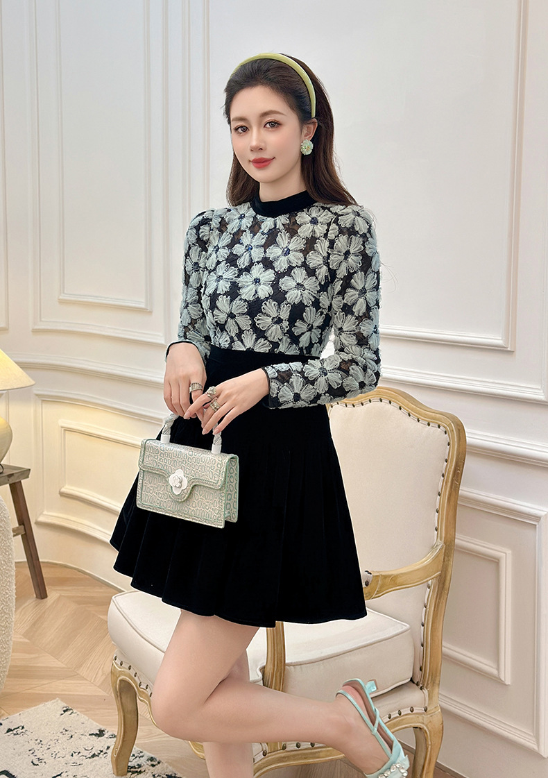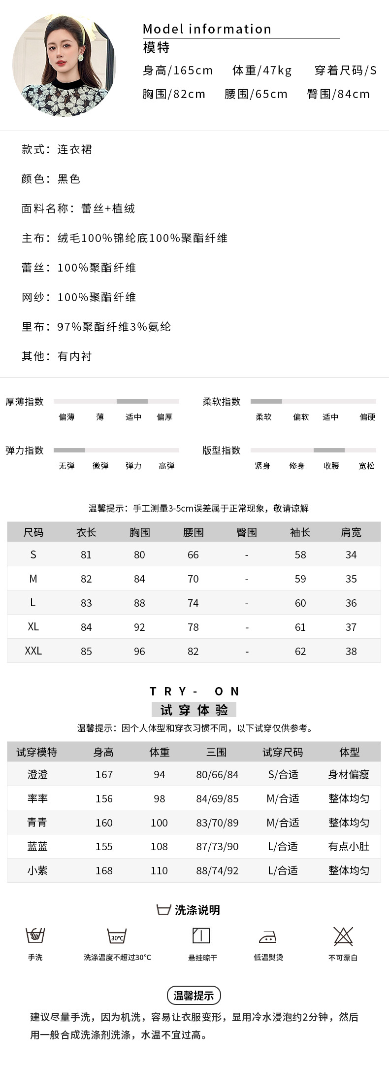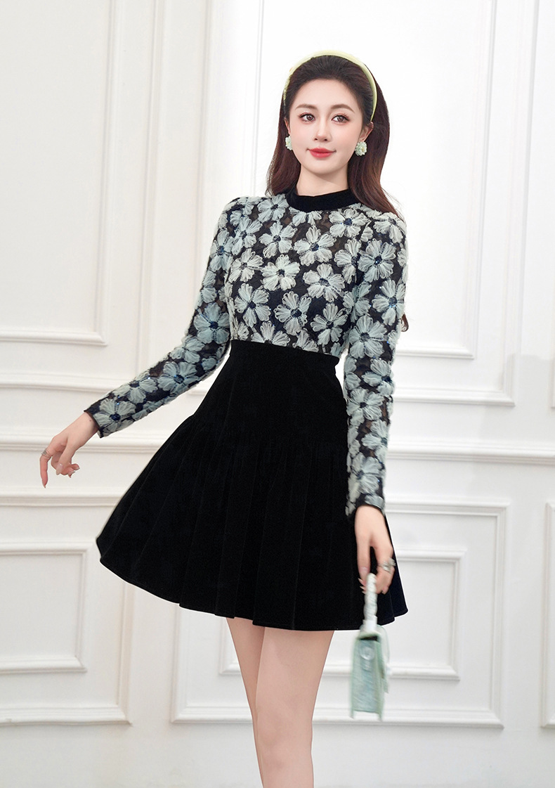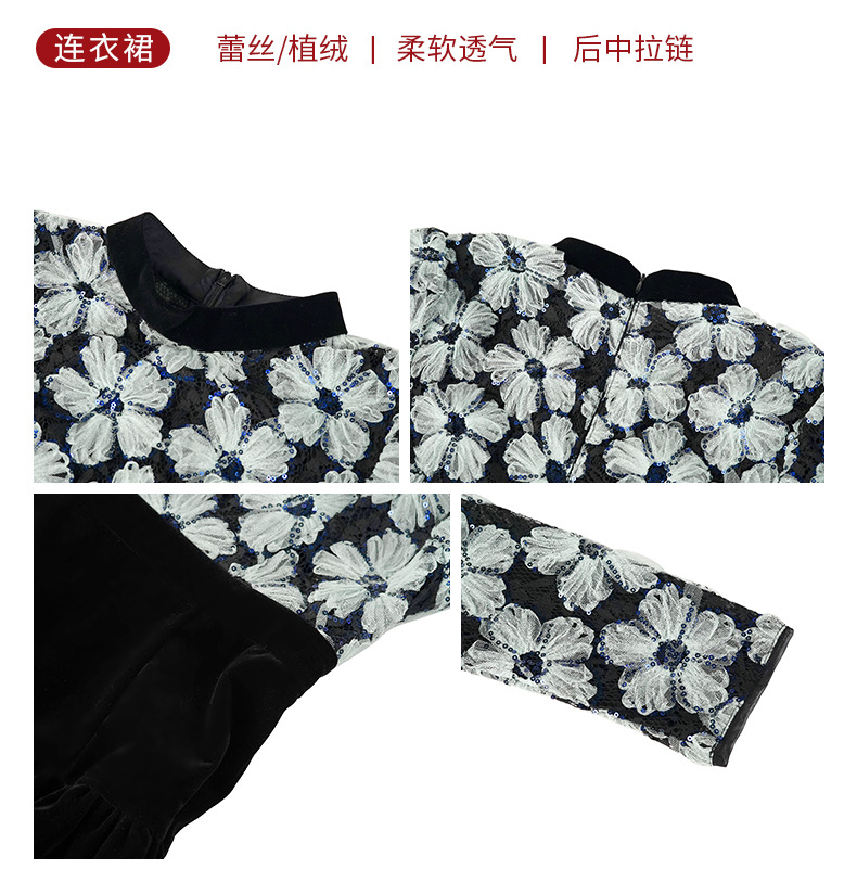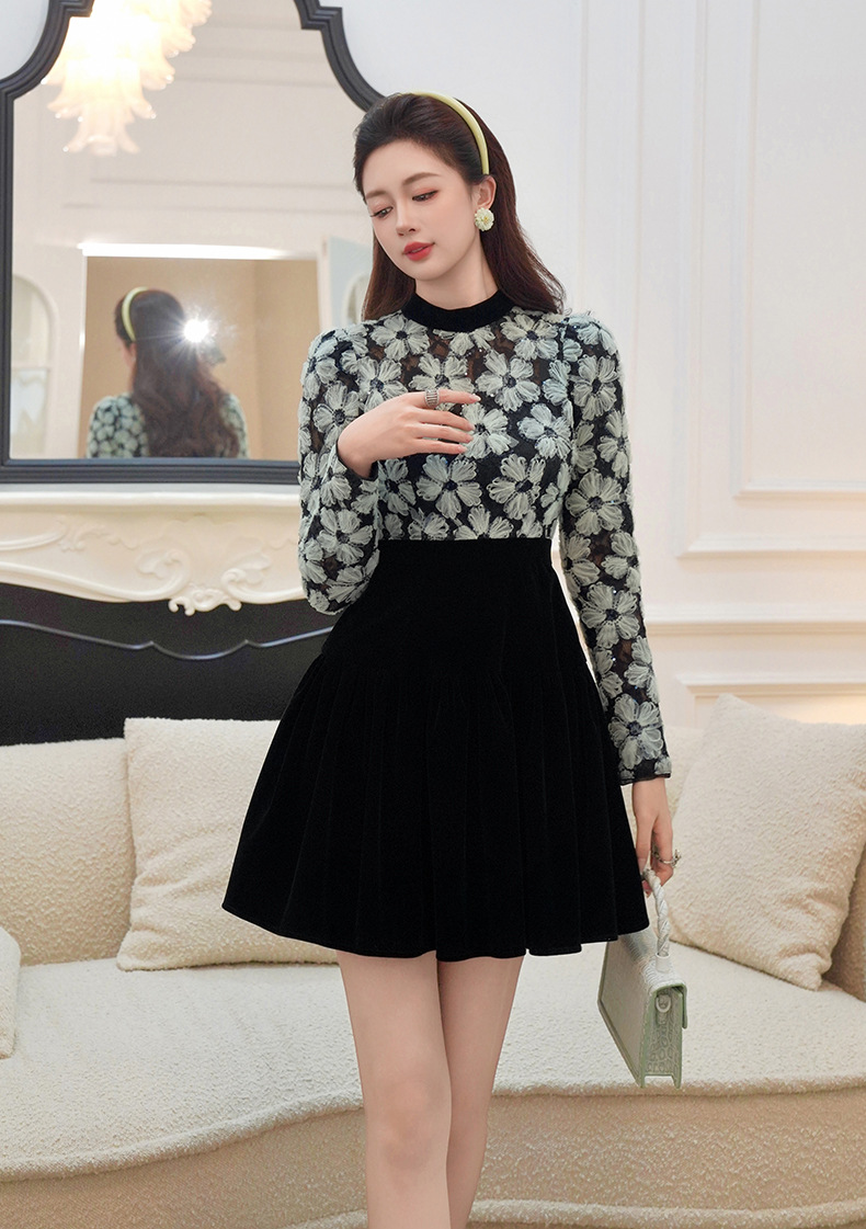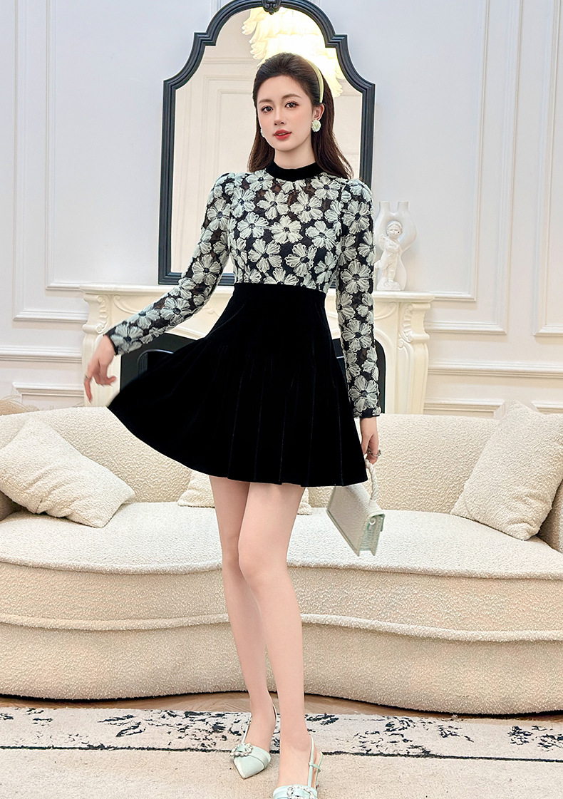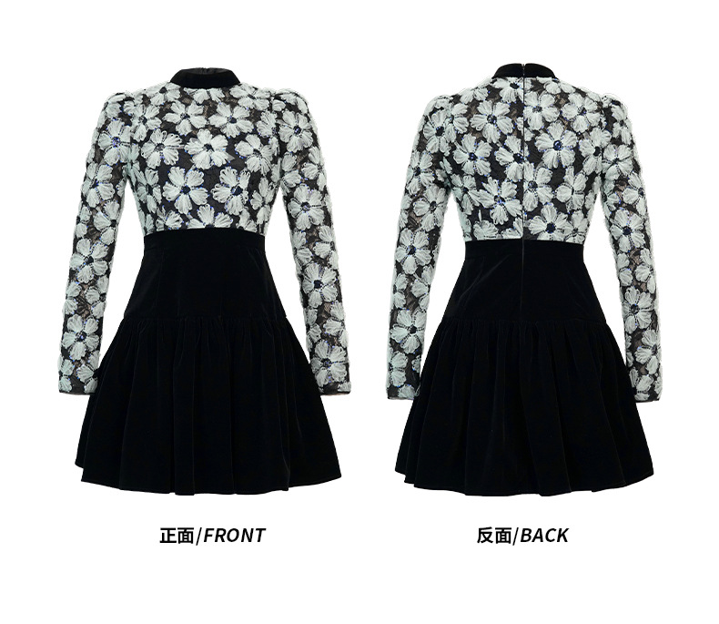 C-4621# 秋冬法式立领蕾丝花拼接丝绒连衣裙女收腰显瘦名媛风A字裙21900