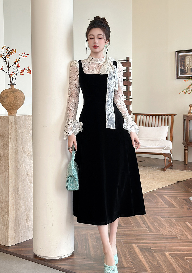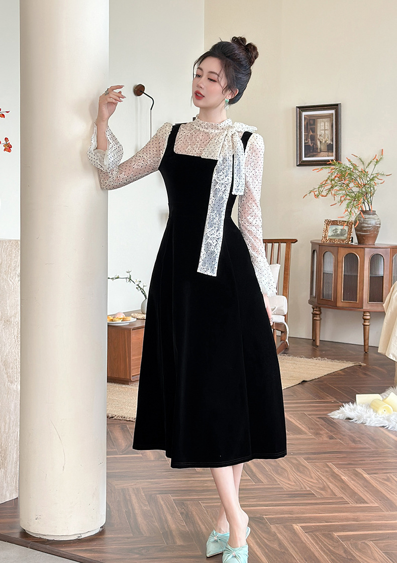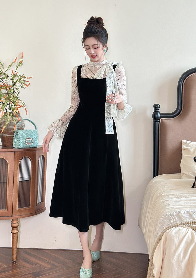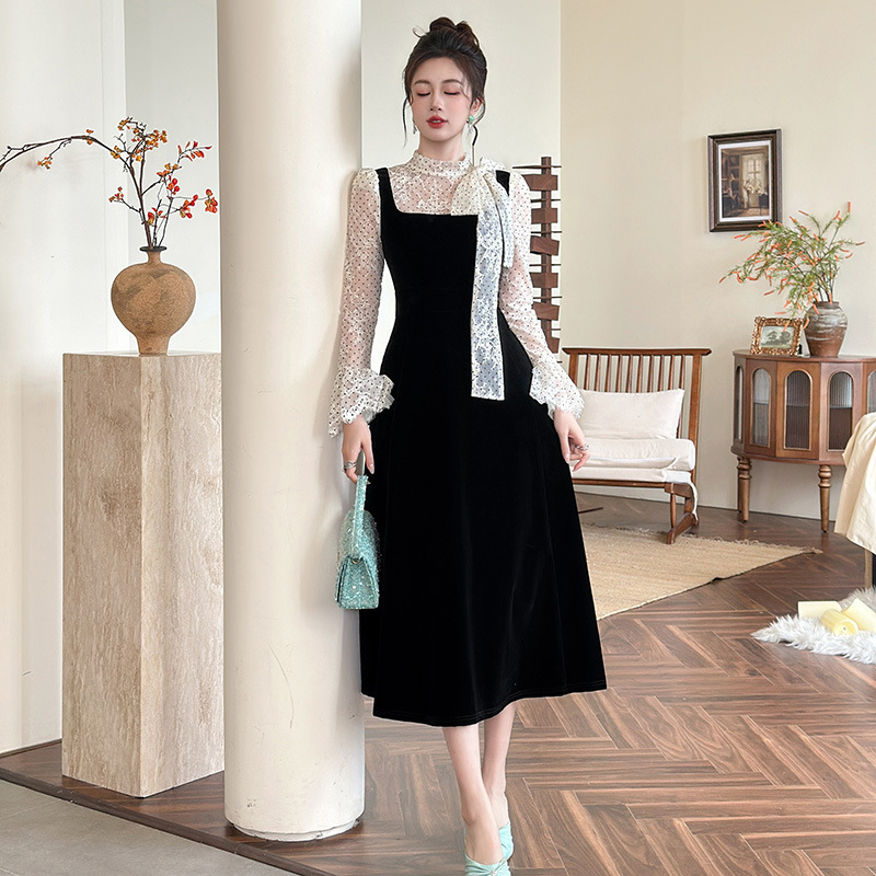 C-4622# 法式丝绒假两件背带连衣裙女冬蕾丝波点收腰显瘦名媛风长裙21925