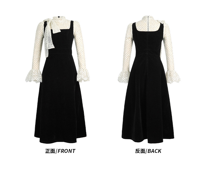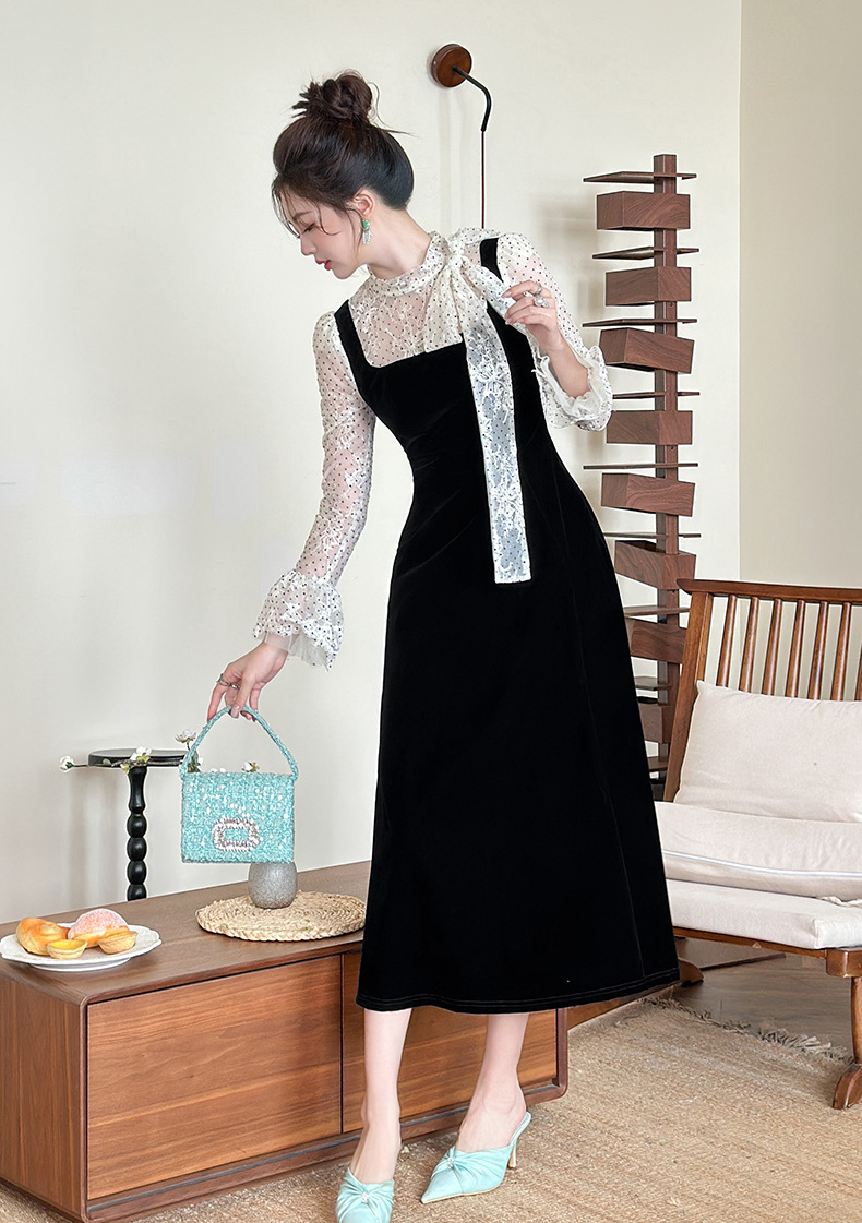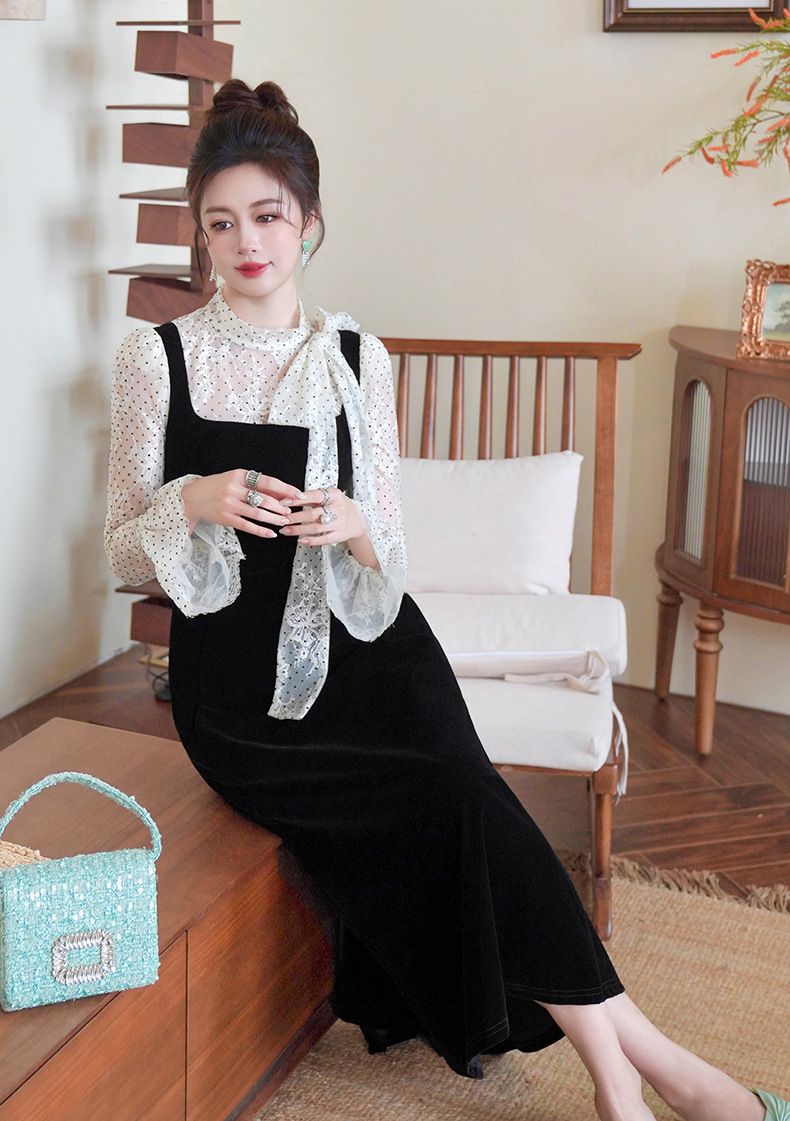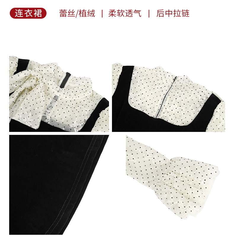 C-4622# 法式丝绒假两件背带连衣裙女冬蕾丝波点收腰显瘦名媛风长裙21925