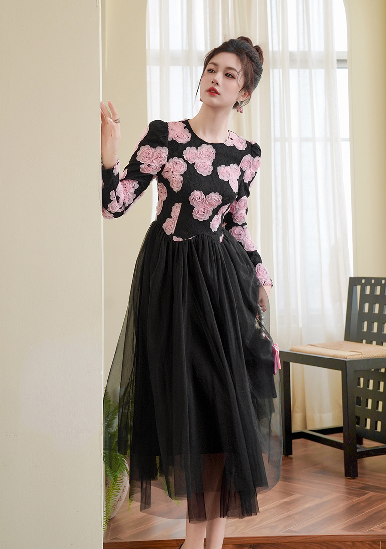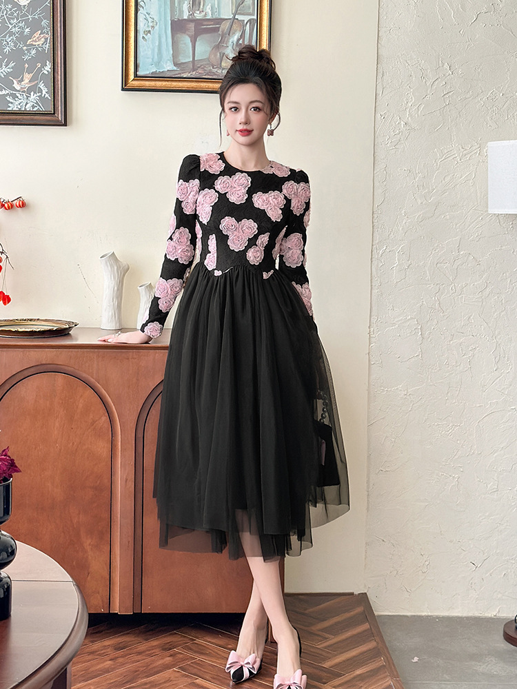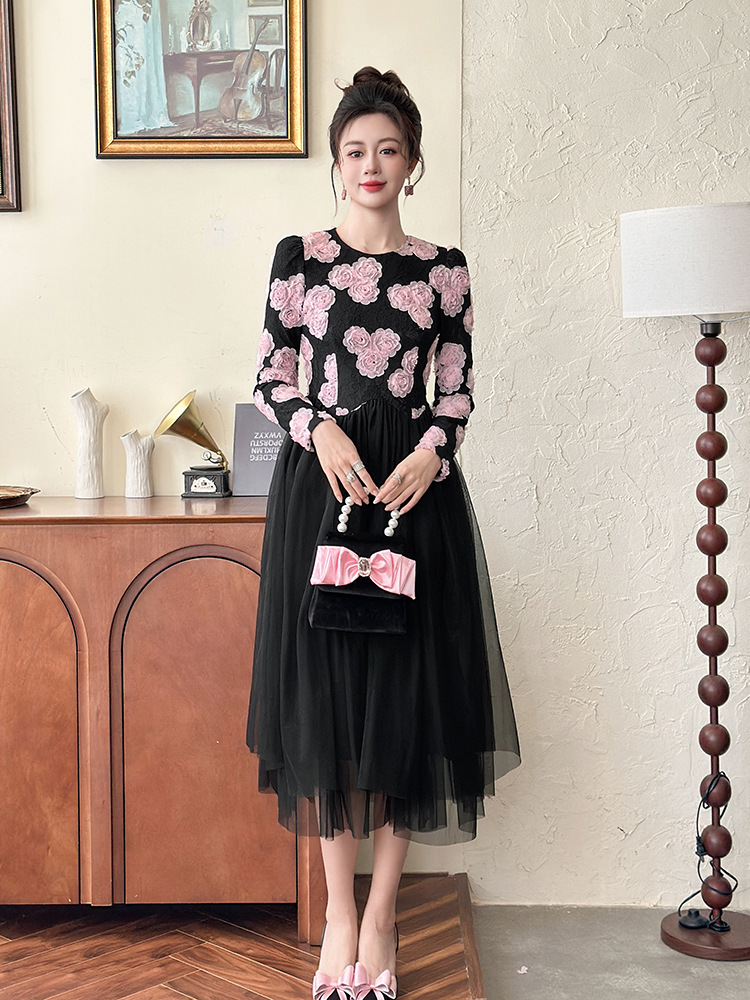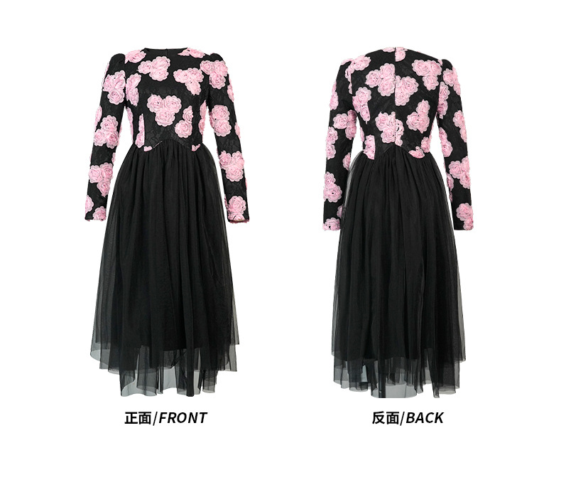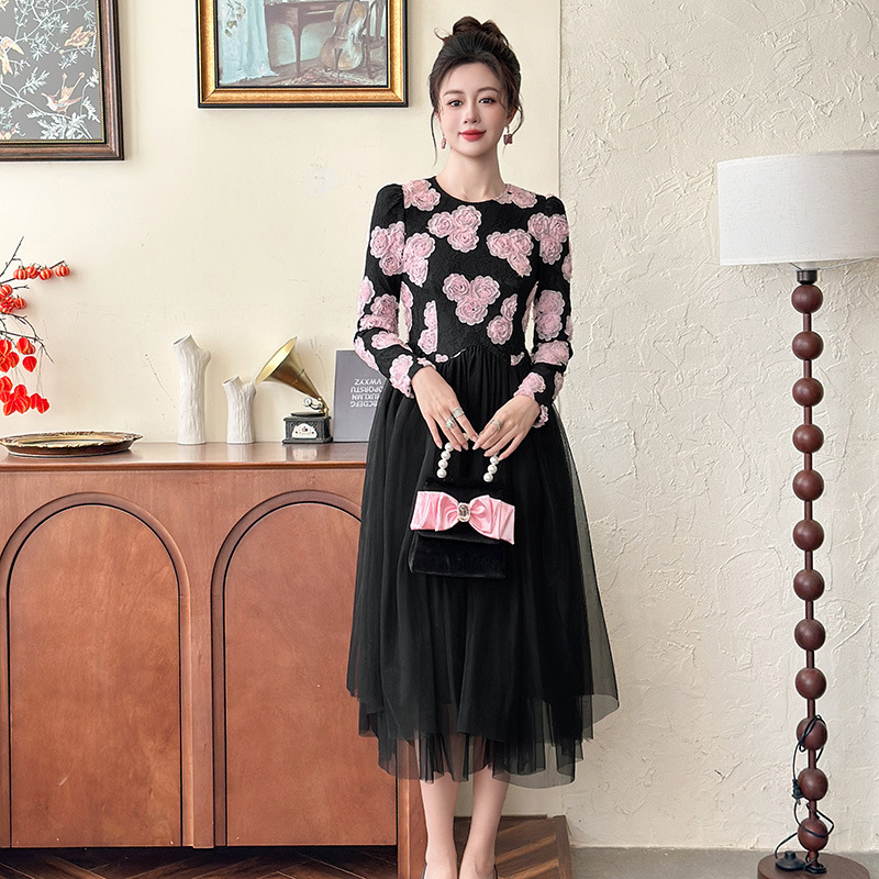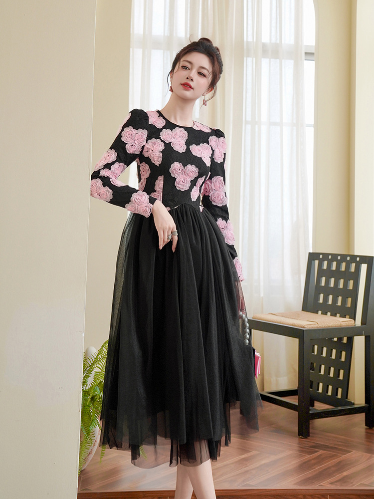 C-4624# 法式立体花网纱拼接连衣裙女收腰显瘦撞色设计感名媛风长裙65472