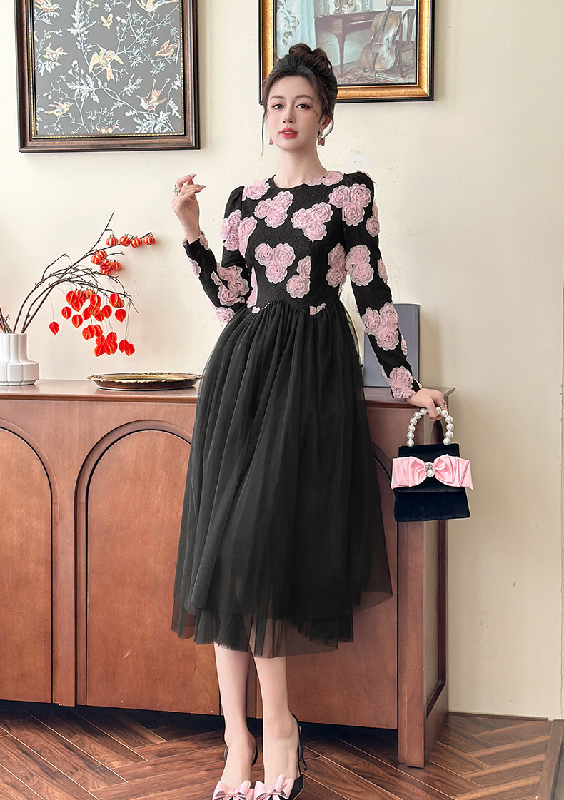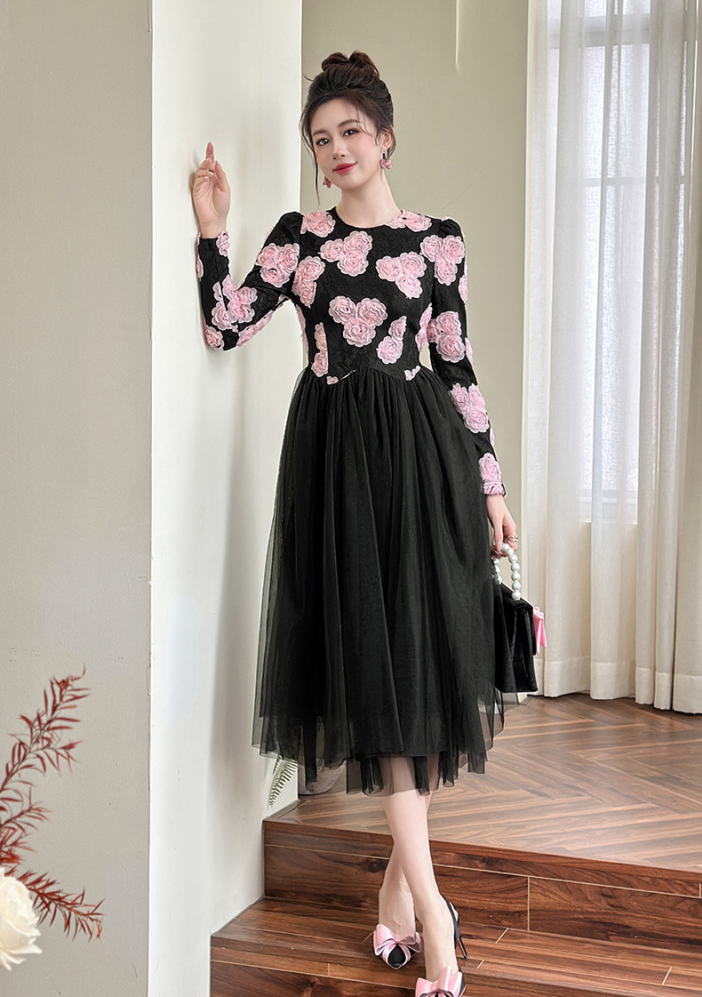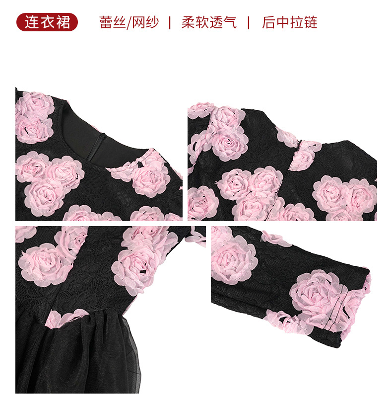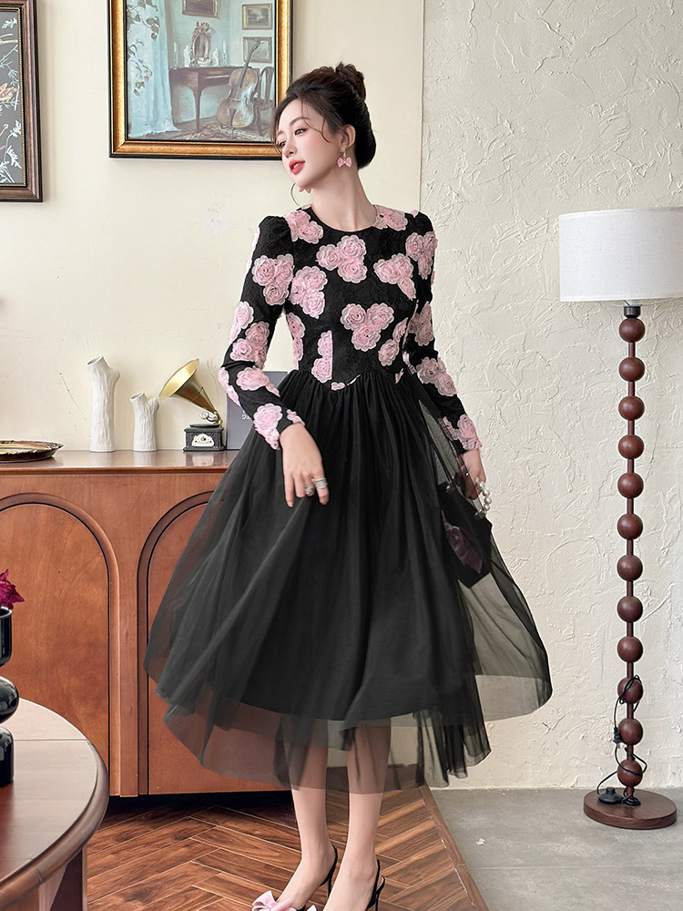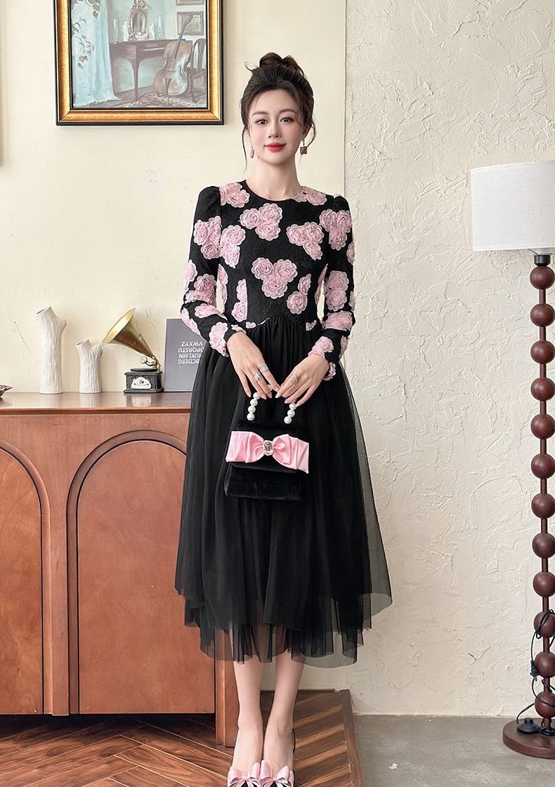 C-4624# 法式立体花网纱拼接连衣裙女收腰显瘦撞色设计感名媛风长裙65472