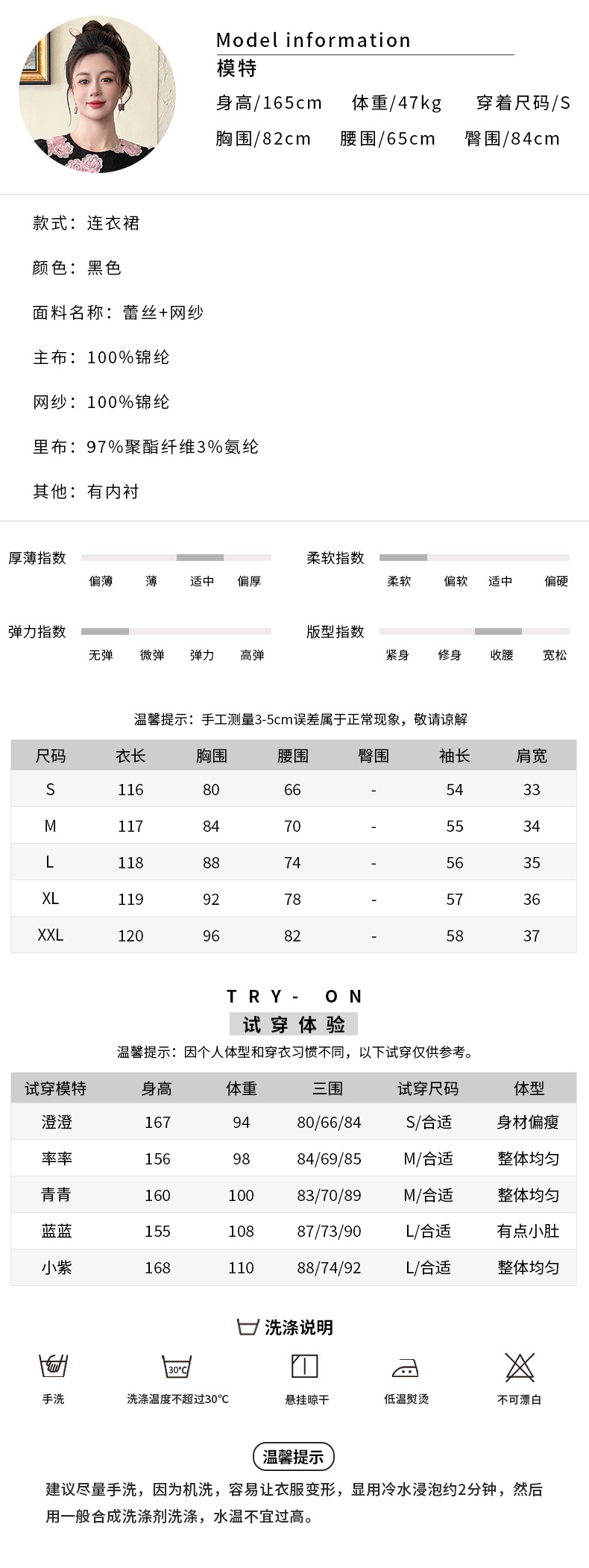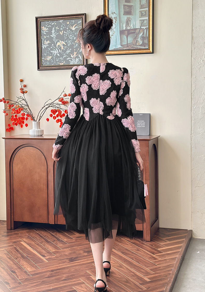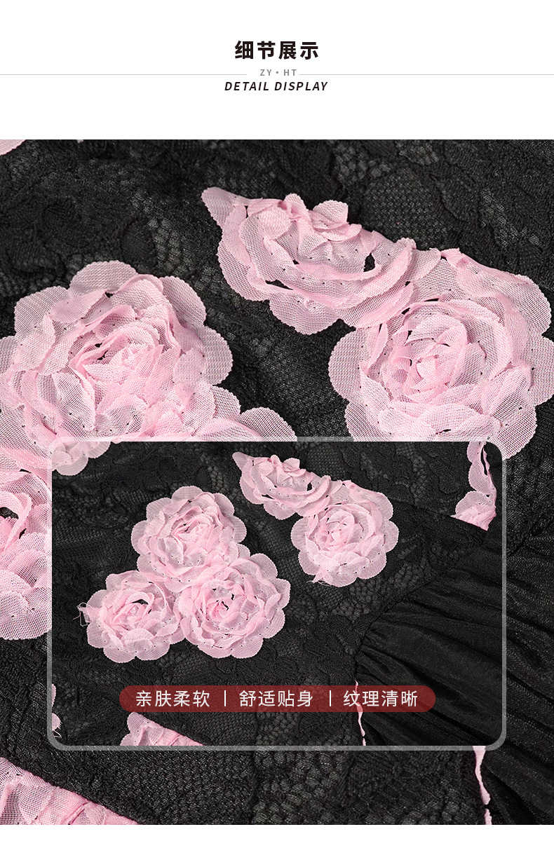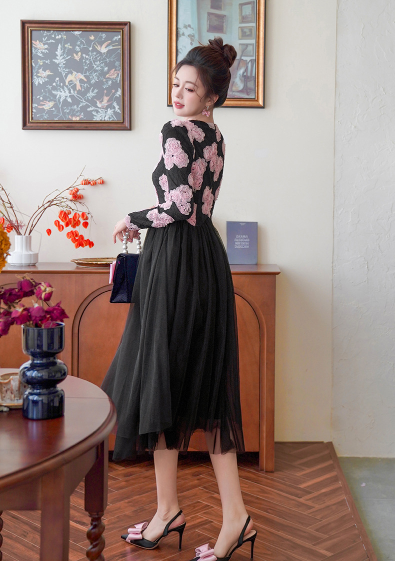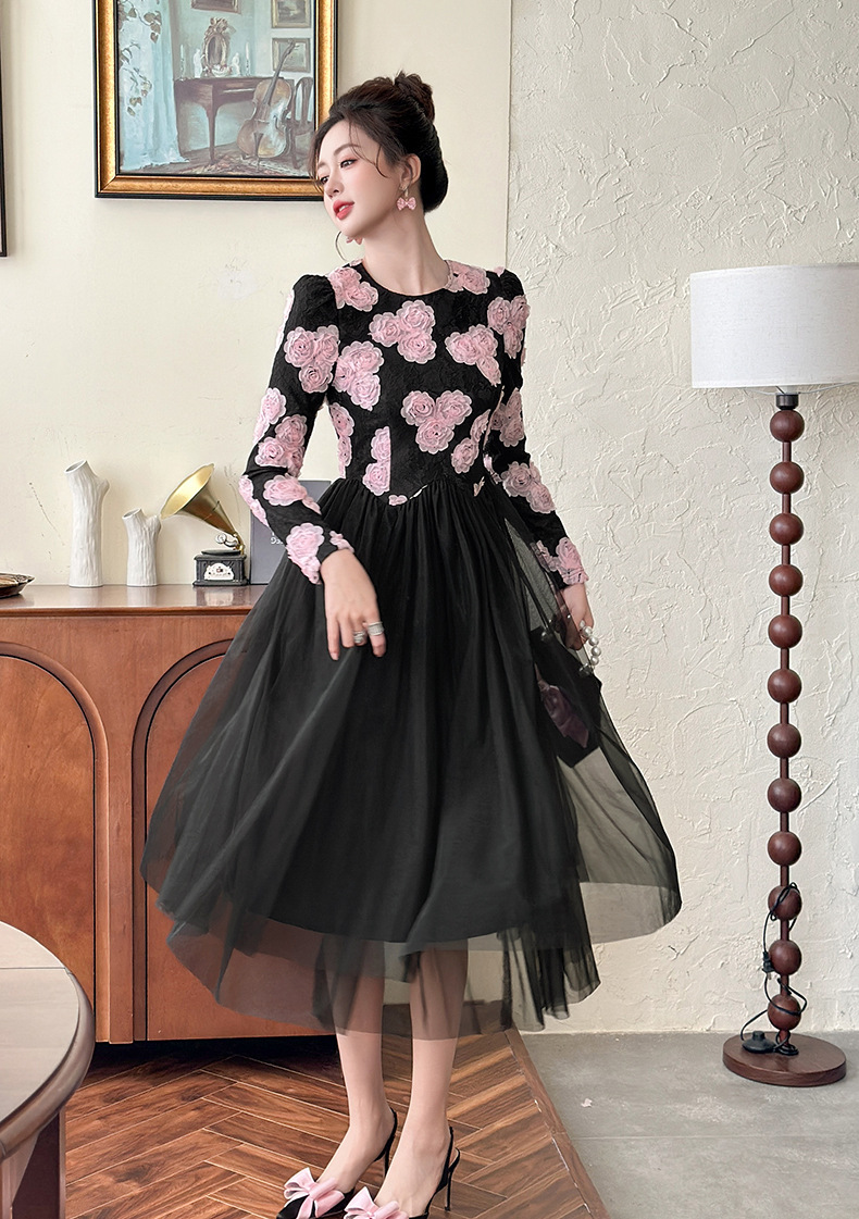 C-4624# 法式立体花网纱拼接连衣裙女收腰显瘦撞色设计感名媛风长裙65472