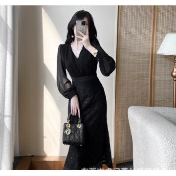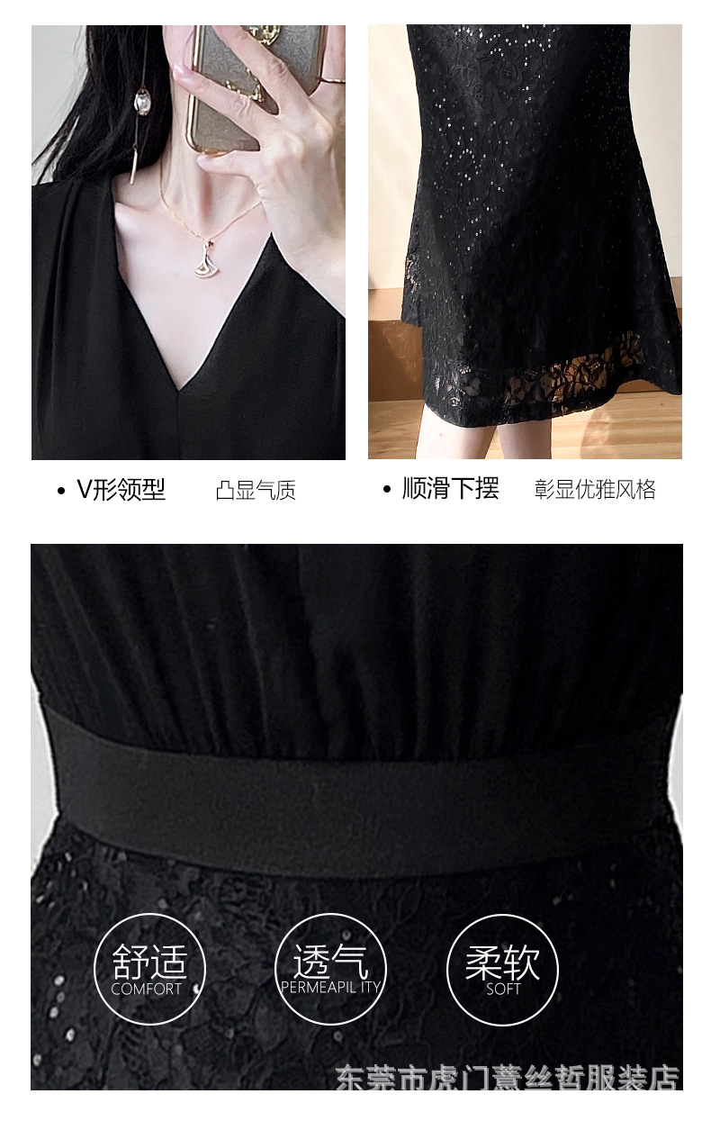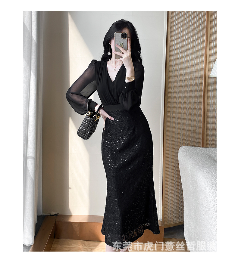 A-8275# 2638秋新款v领收腰显瘦法式雪纺拼接气质连衣裙标价不得低于238