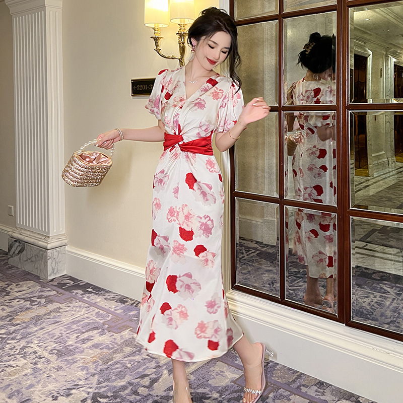 C-2527# 2023夏季新款女装御姐风气质V领泡泡袖印花扭结修身连衣裙30073