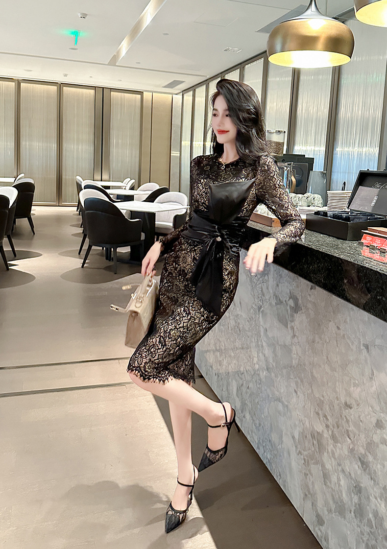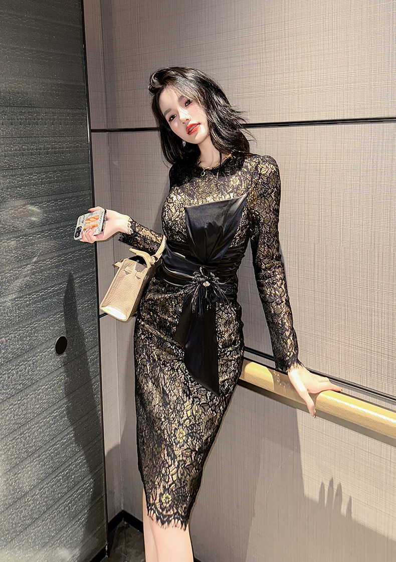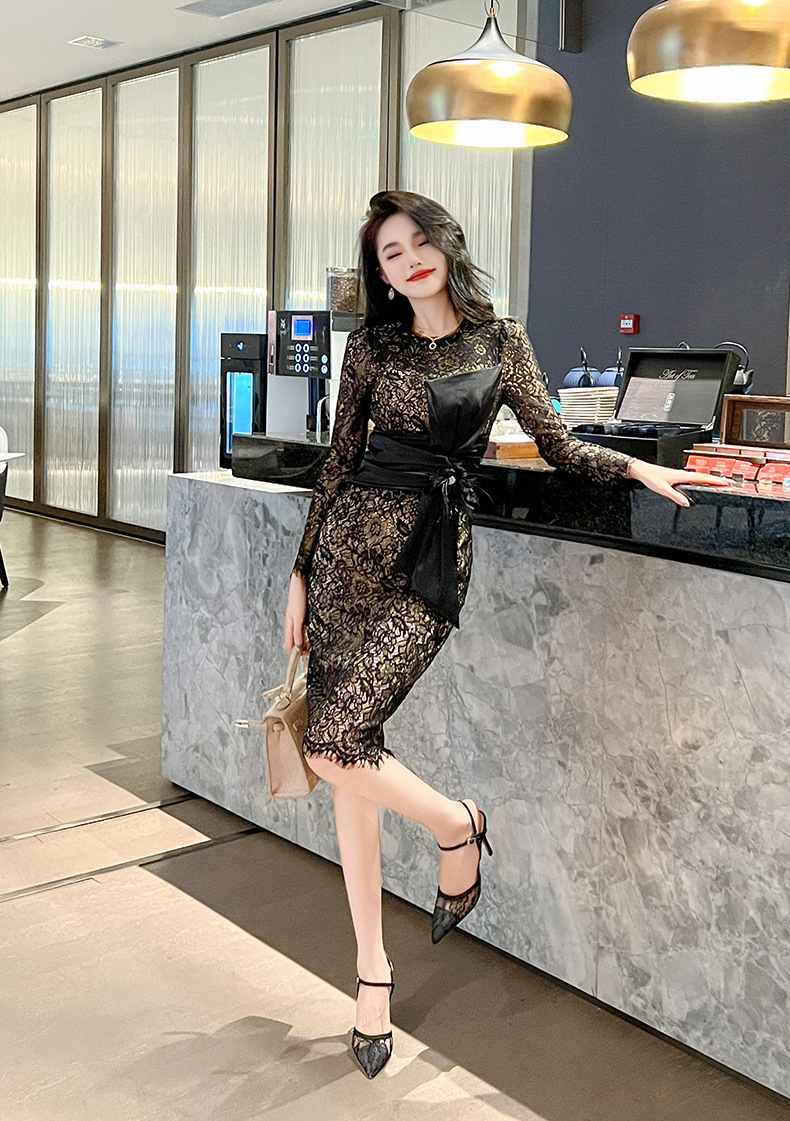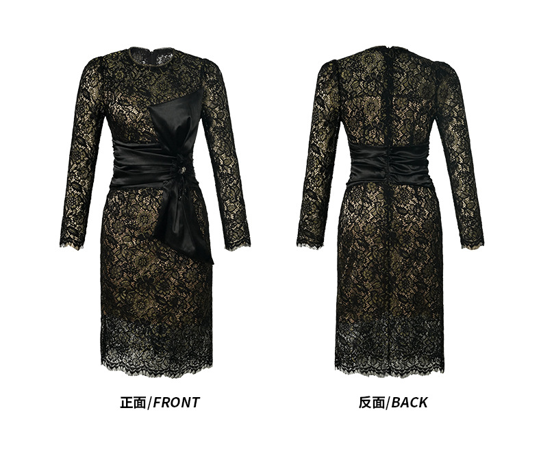 C-2782# 2023秋季新款跨境时尚圆领蝴蝶结减龄蕾丝修身包臀连衣裙女20747